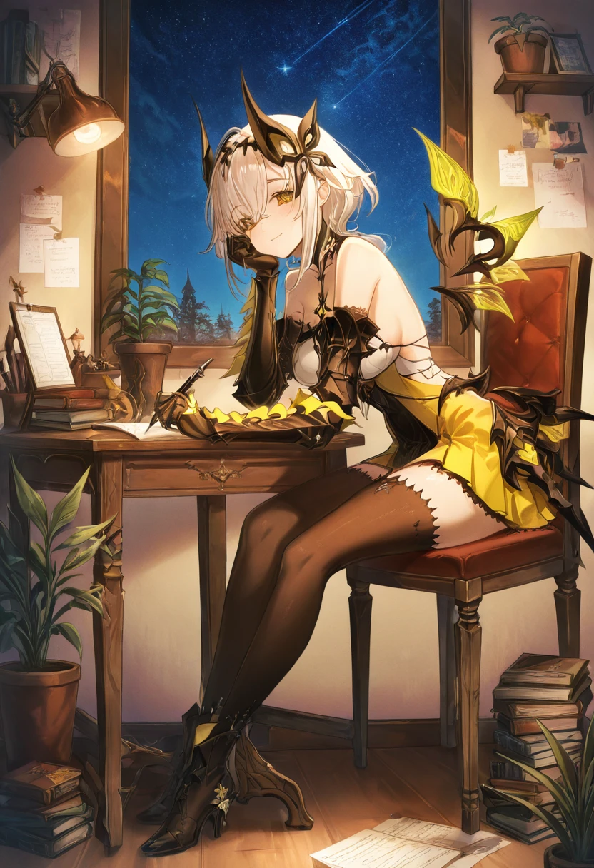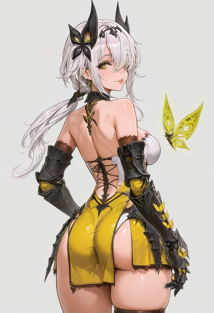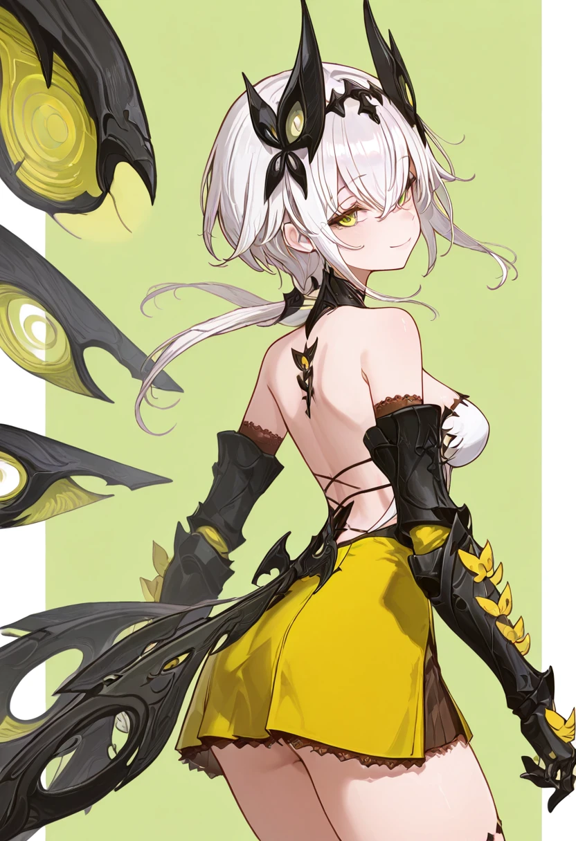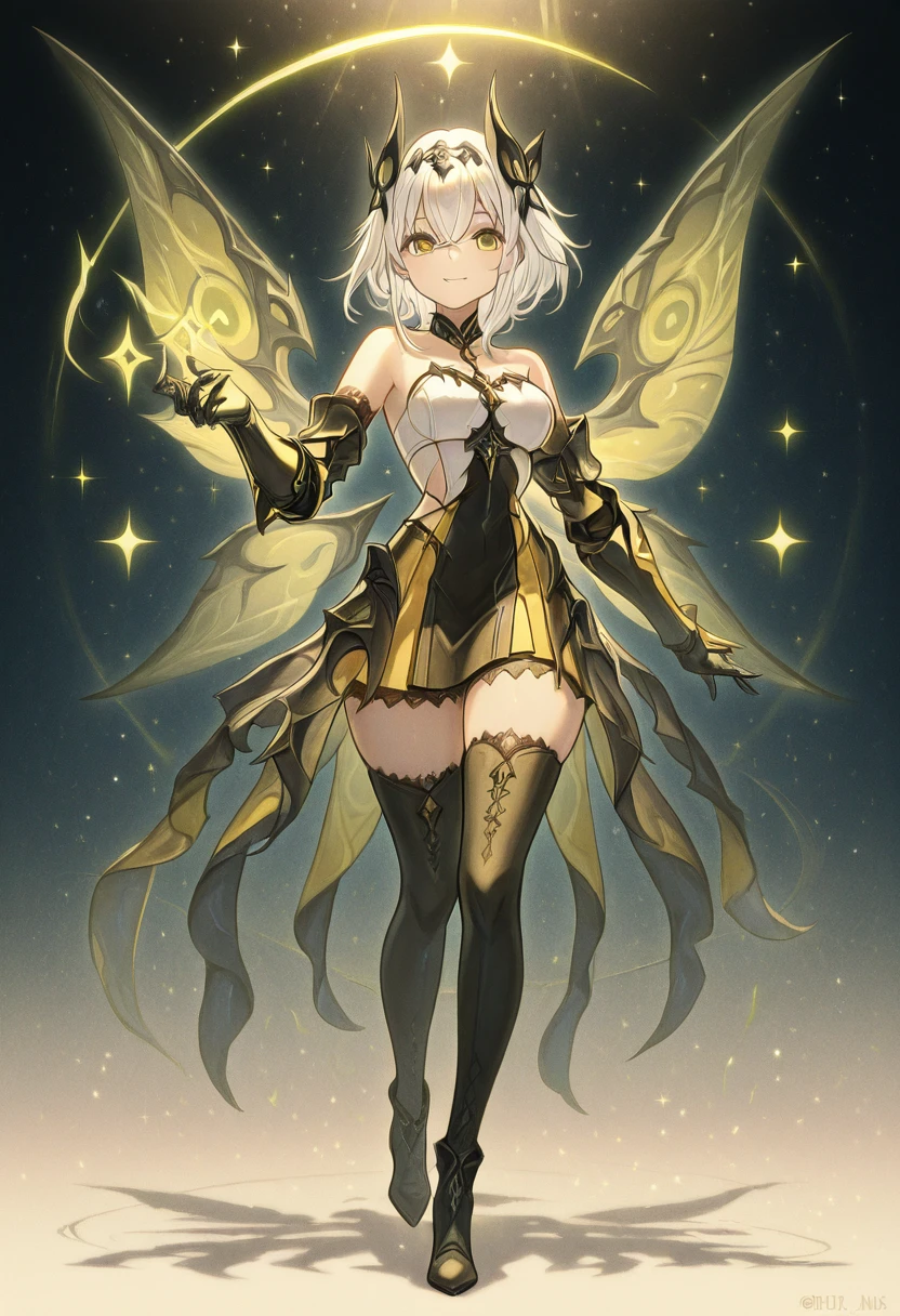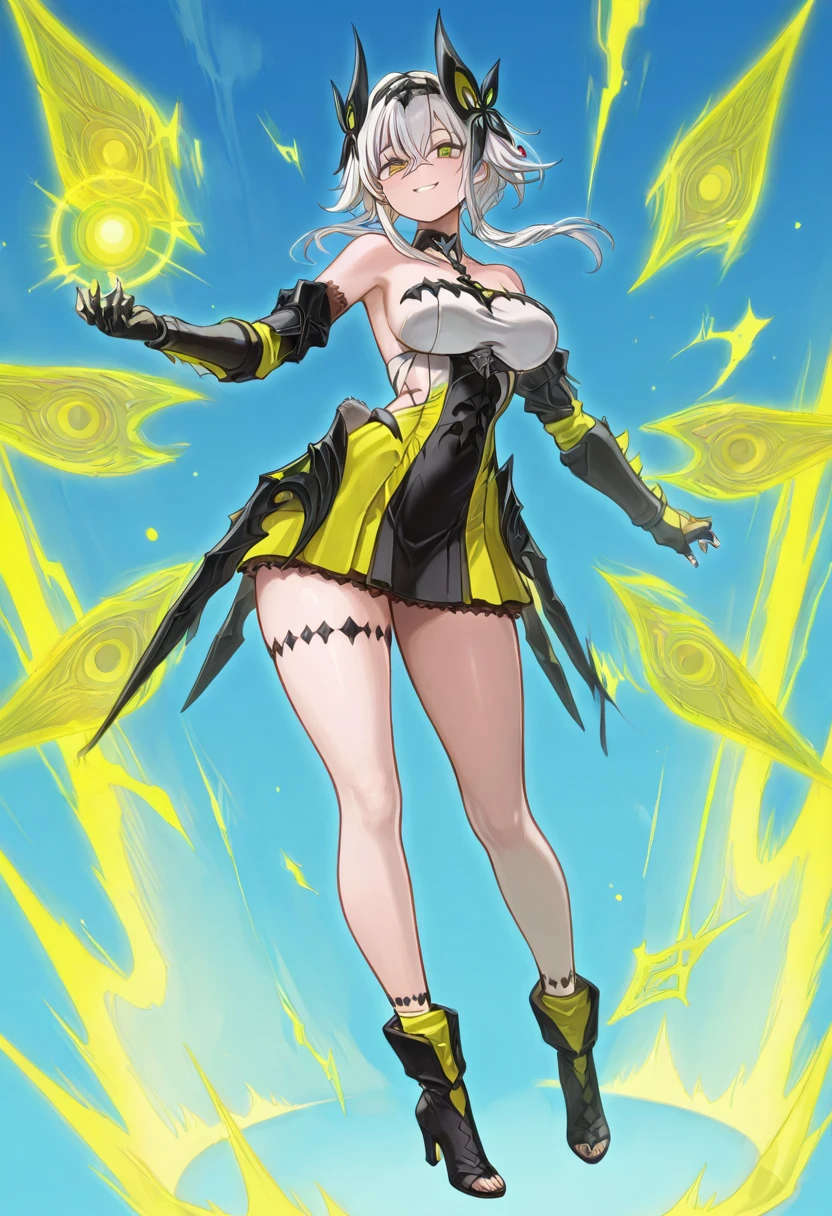 zzPsyche, yellow eyes, green eyes, white hair, medium hair, bangs, hair ornament, hair between eyes, yellow dress, shoulders, boots, wings, elbow gloves, high heels, gauntlets,