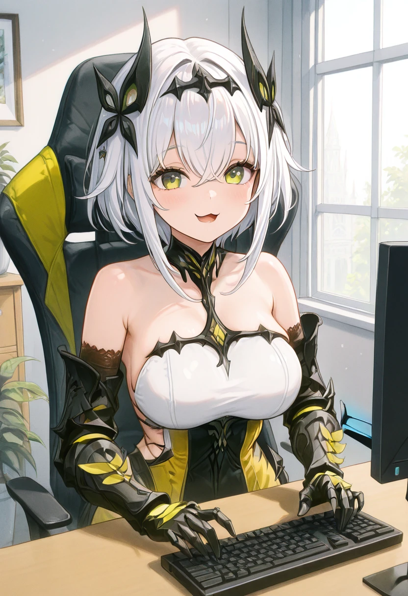 zzPsyche, yellow eyes, green eyes, white hair, medium hair, bangs, hair ornament, hair between eyes,