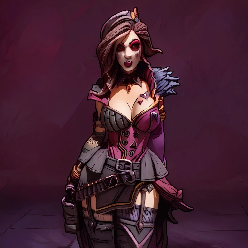 1girl, makeup, heart tattoo on breast, long hair, single braid, tophat, collar, thighhigh boots, garter strap, asymmetrical legwear, asymmetrical sleeves, belt, skirt, collared shirt,