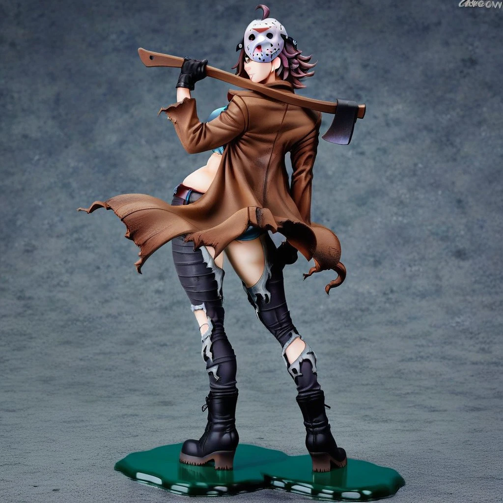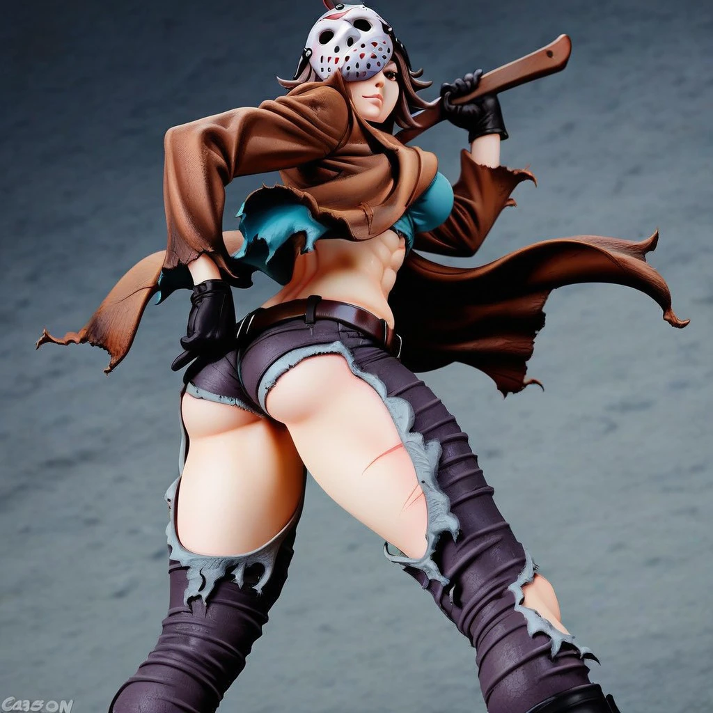midriff, torn clothes, brown jacket, mask on head, gloves, belt, torn pants, black boots, denim, underwear, hockey mask,