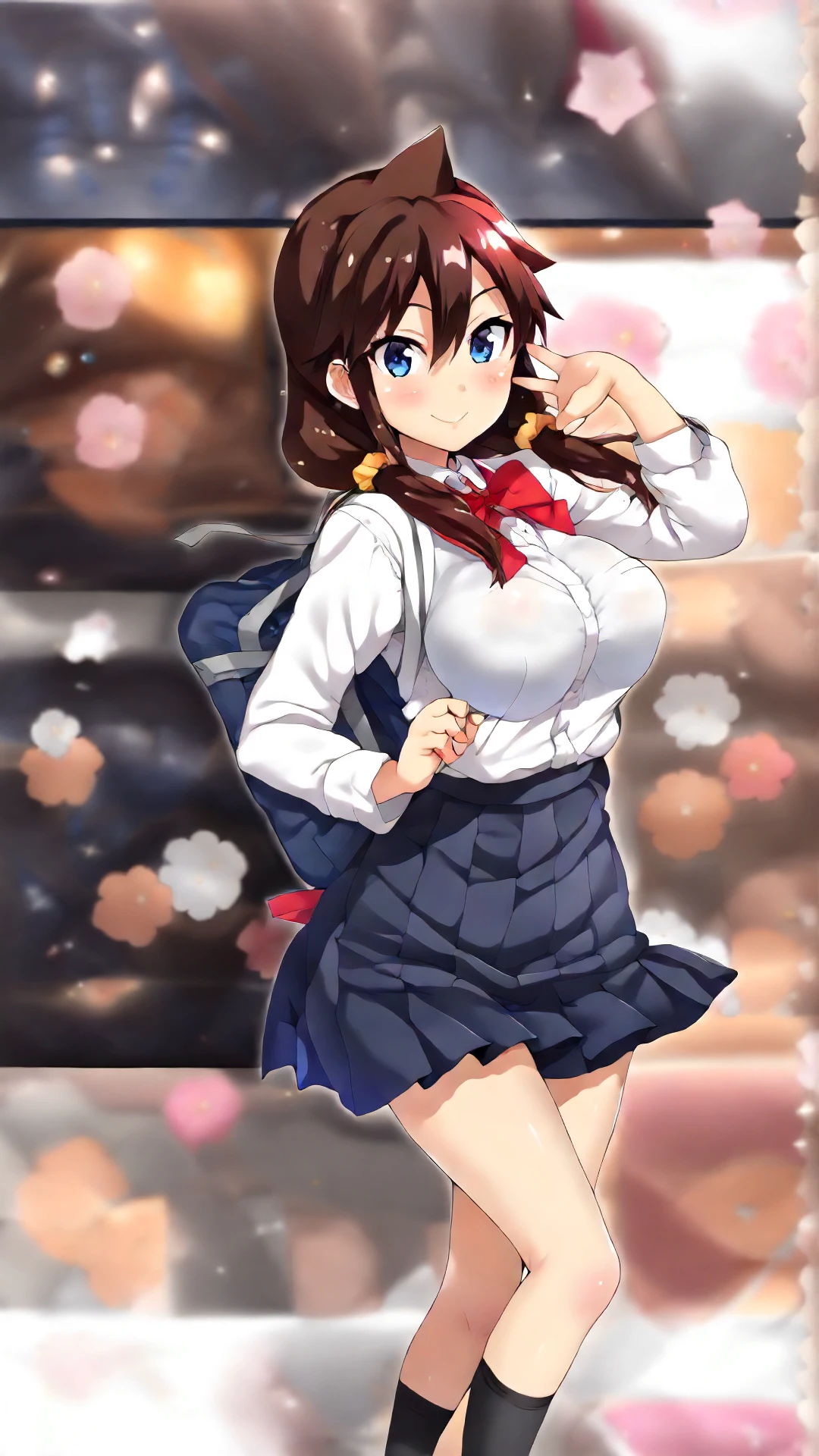 amano_megumi, an anime girl, 1girl, solo, breasts, looking at viewer, smile, blue eyes, skirt, large breasts, brown hair, white background, school uniform, pleated skirt, kneehighs,
