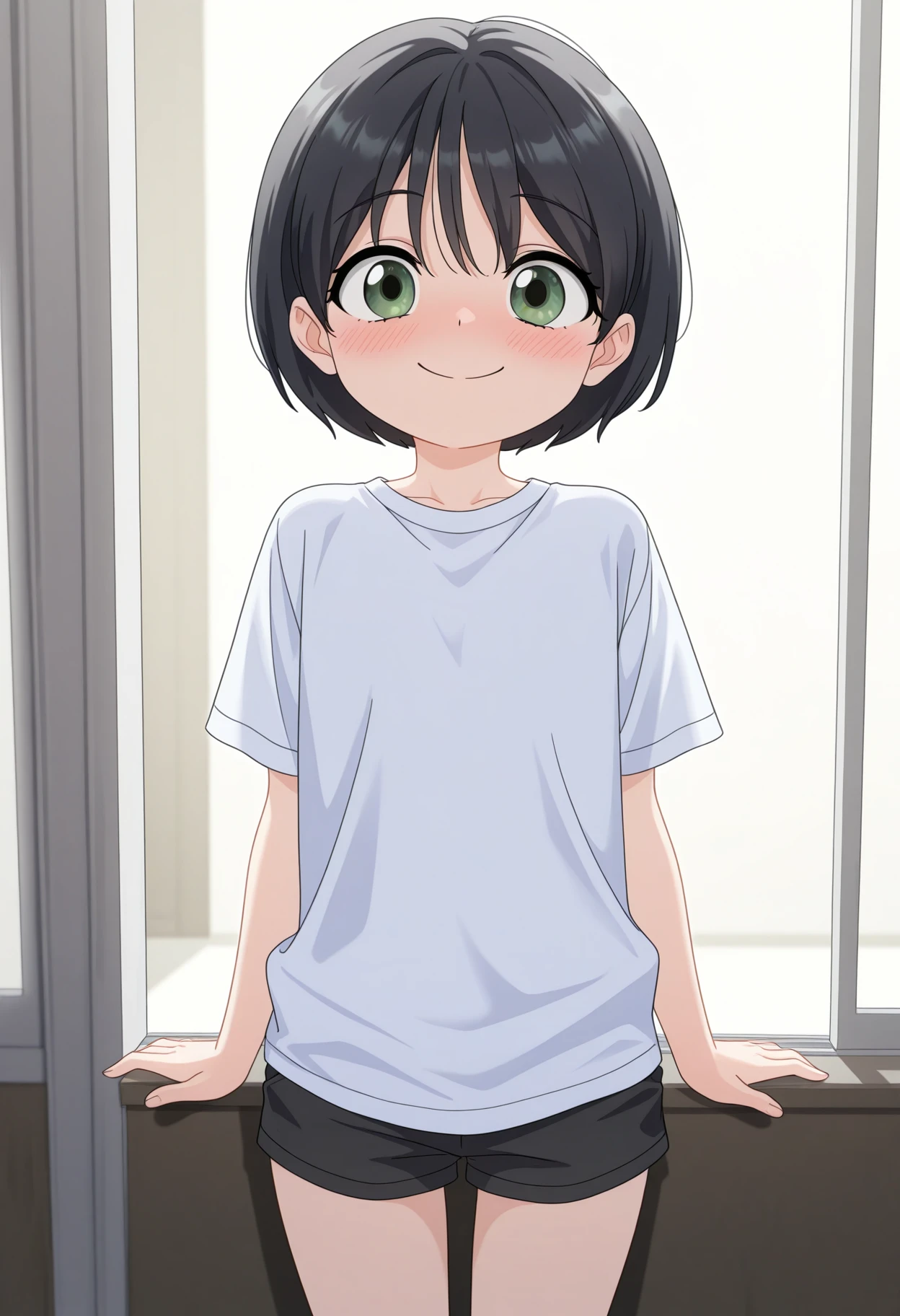 sejin, green eyes, black hair, short hair, shirt, shorts