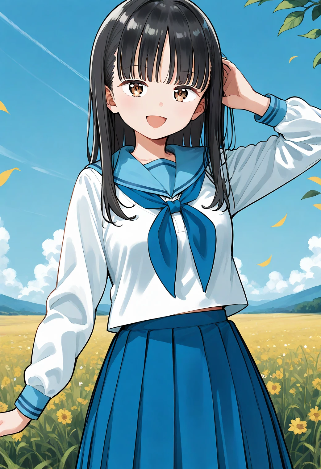 costume1: school uniform, serafuku, white shirt, long sleeves, blue skirt,