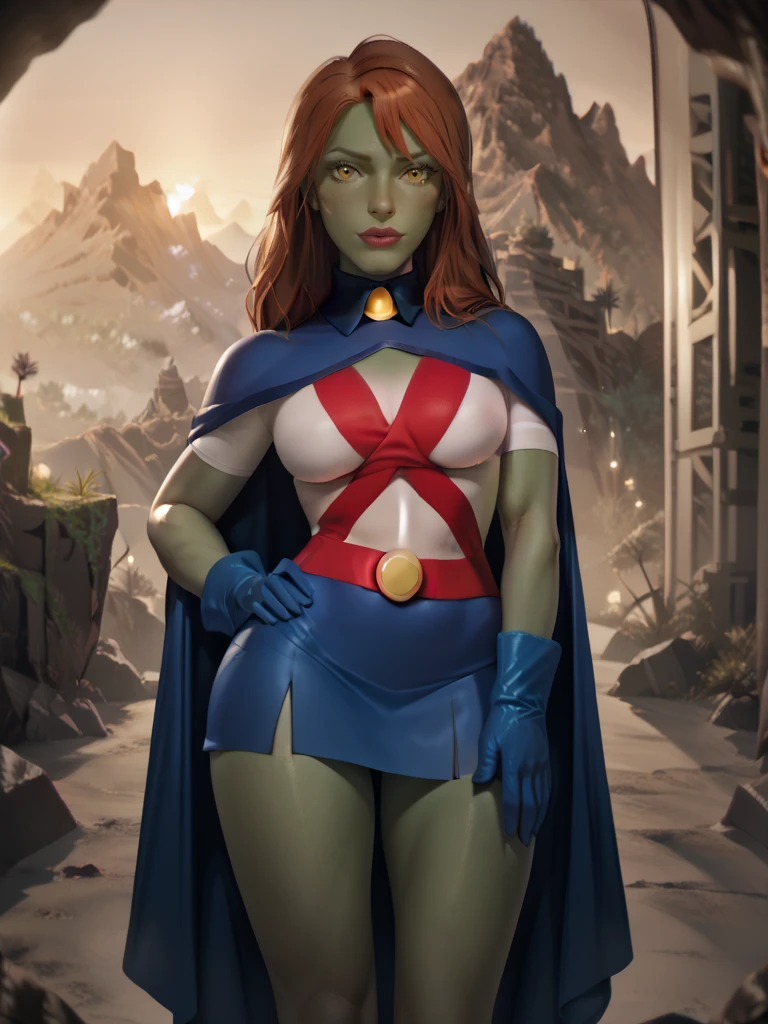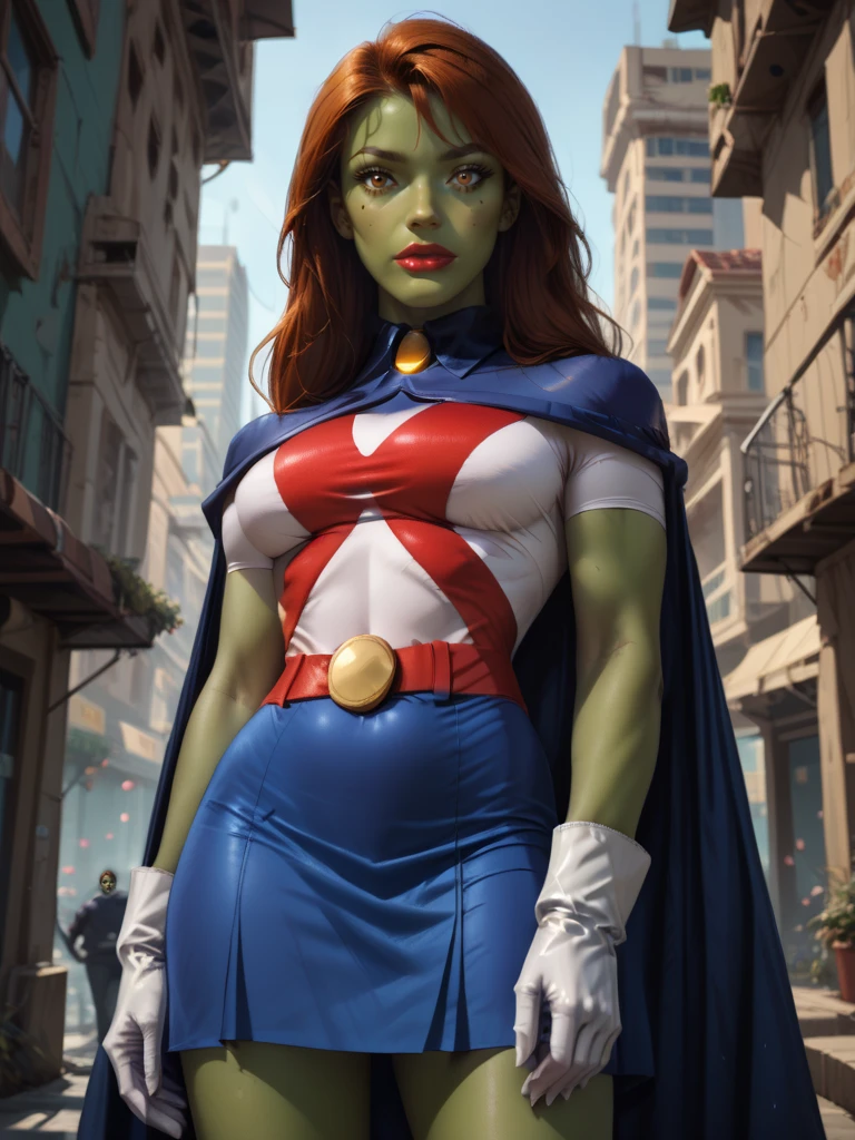 Hero Outfit: Megan, 1girl, green skin, brown hair, long hair, brown eyes, lips, gloves, cape, blue skirt, belt, lipstick,