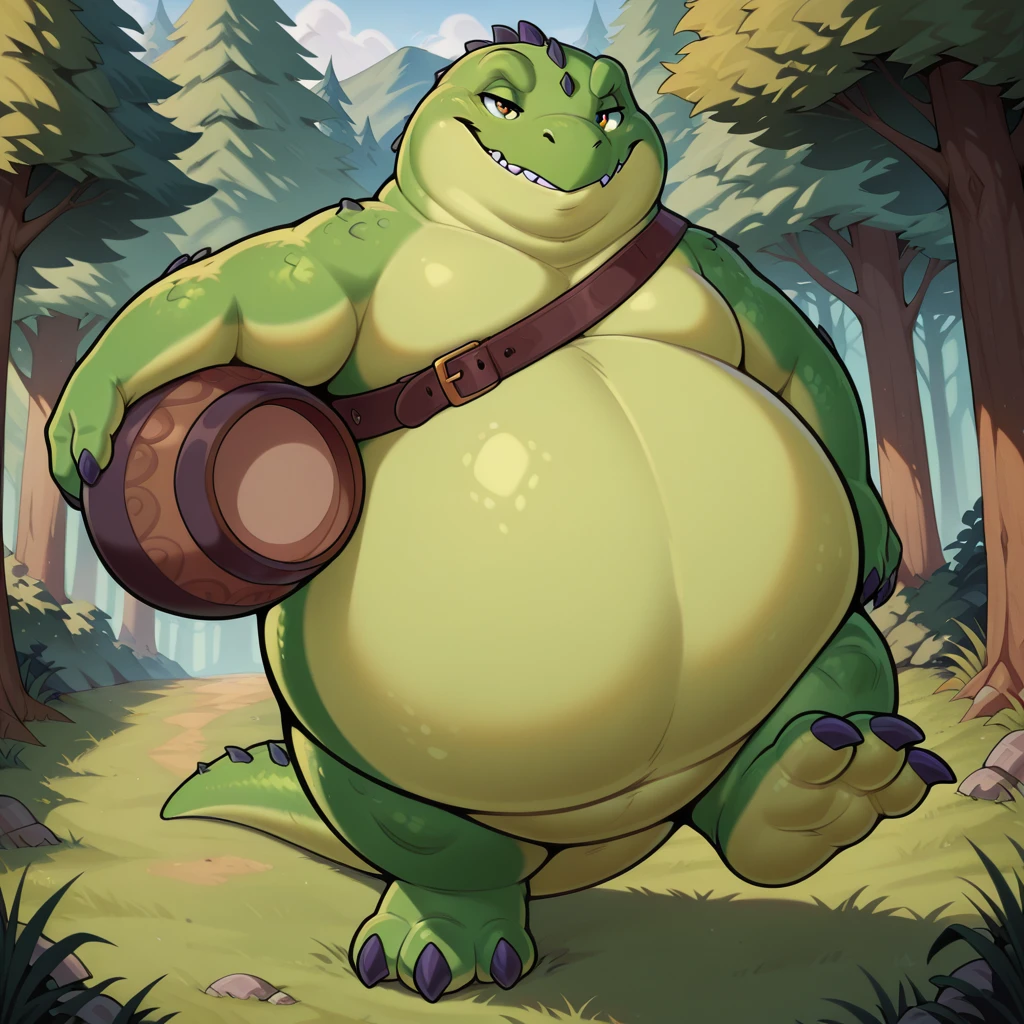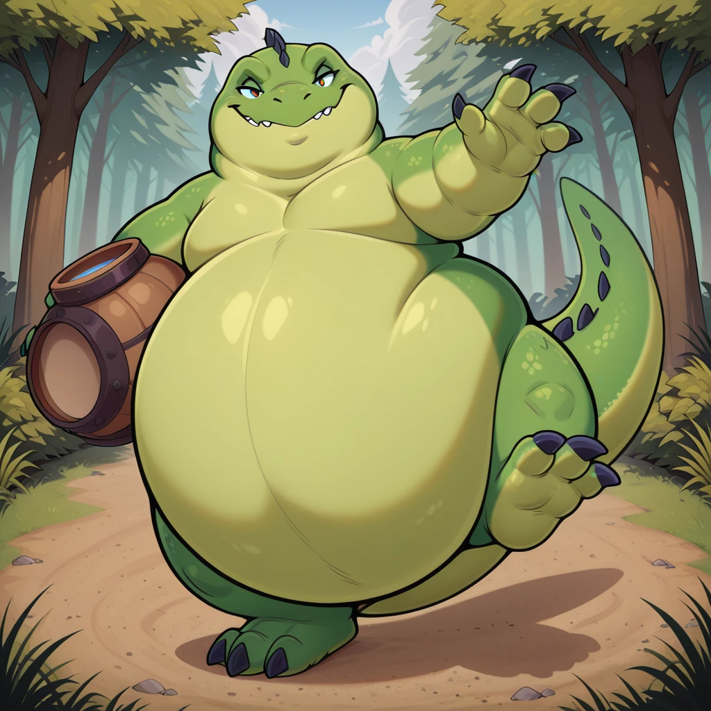 Dragurn: (dragurn, green skin, dragon, fat, obese, carrying jar, spikes, stubby, pudgy, three toes)