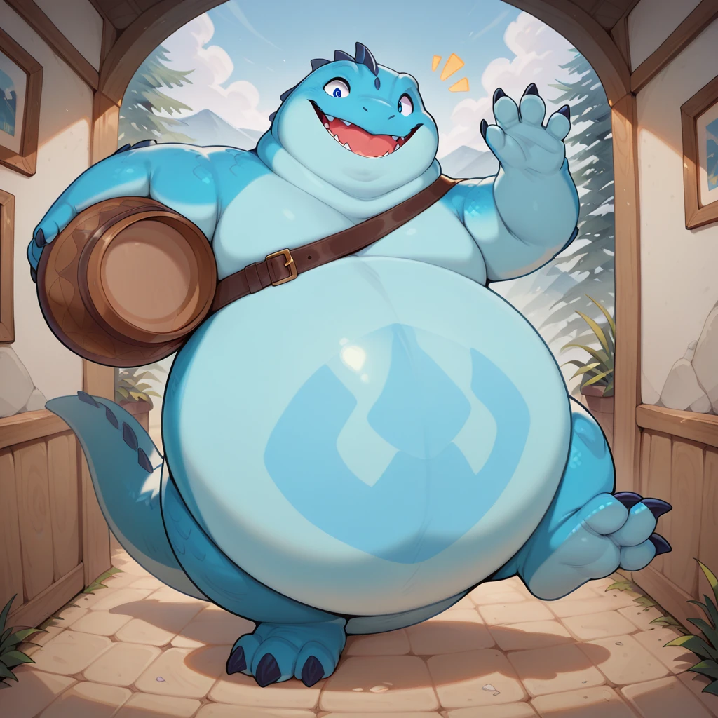Jarvis: (jarvis, blue skin, symbol on belly, dragon, fat, obese, carrying jar, spikes, stubby, pudgy, three toes)