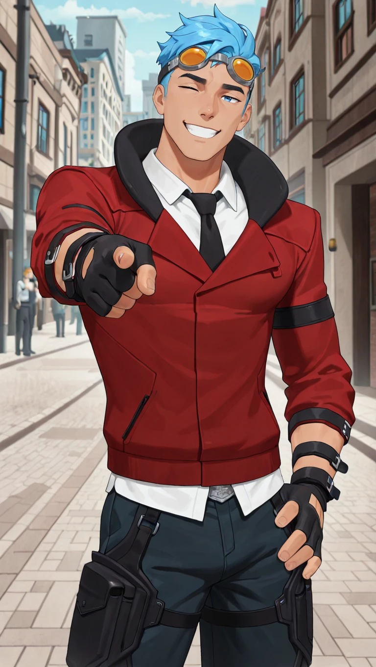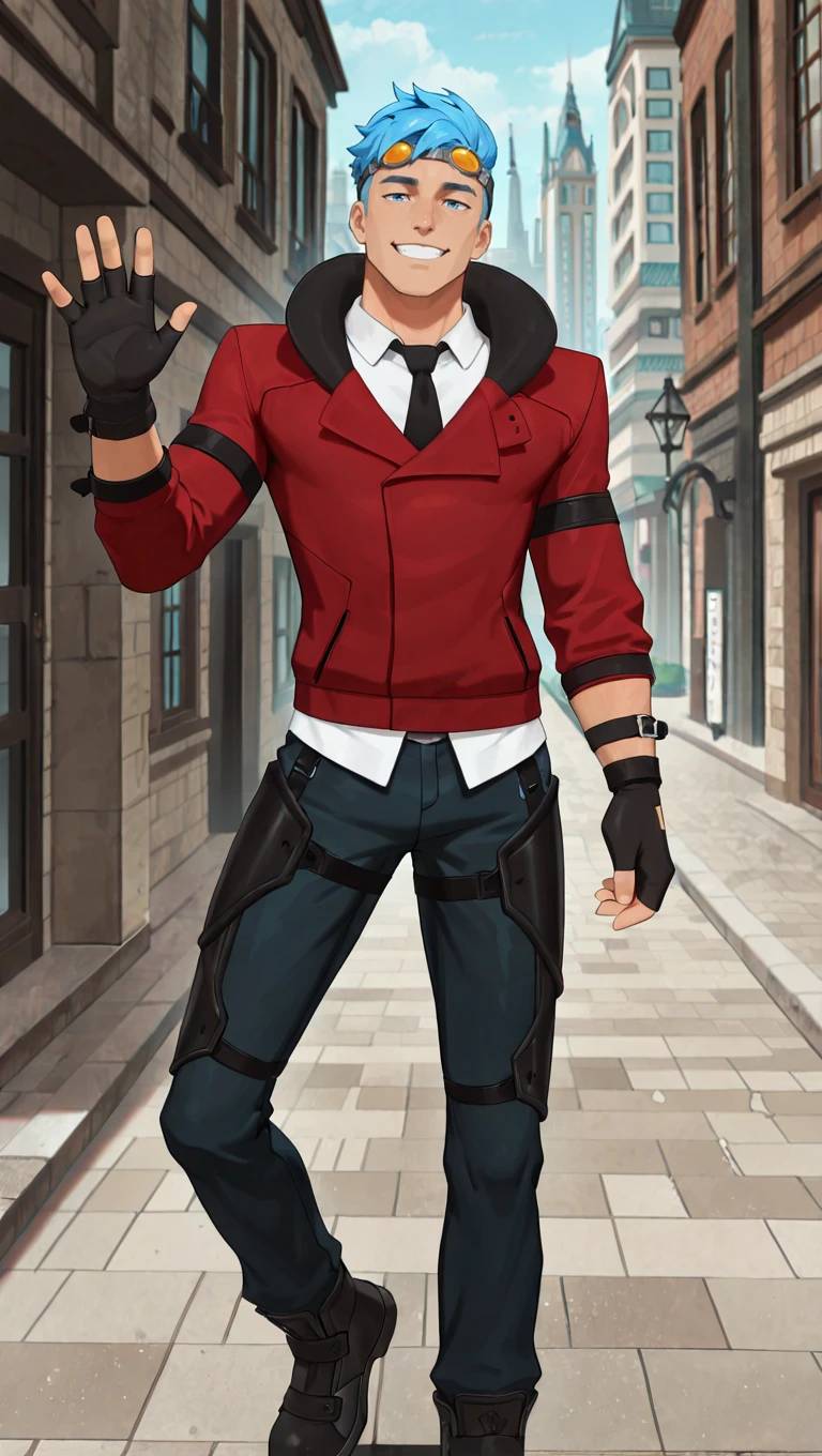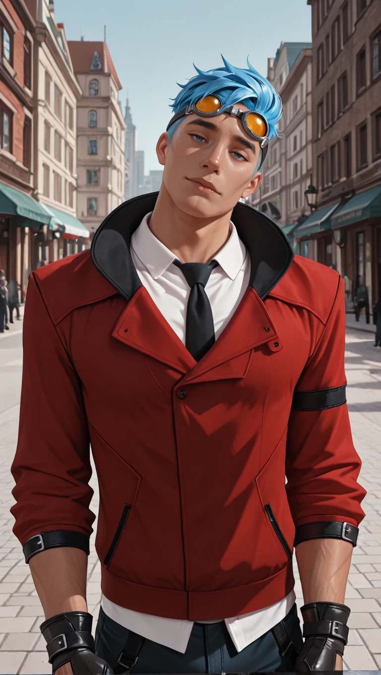 goggles on head, red jacket, white collared shirt, black necktie, black gloves, dark blue pants, black footwear