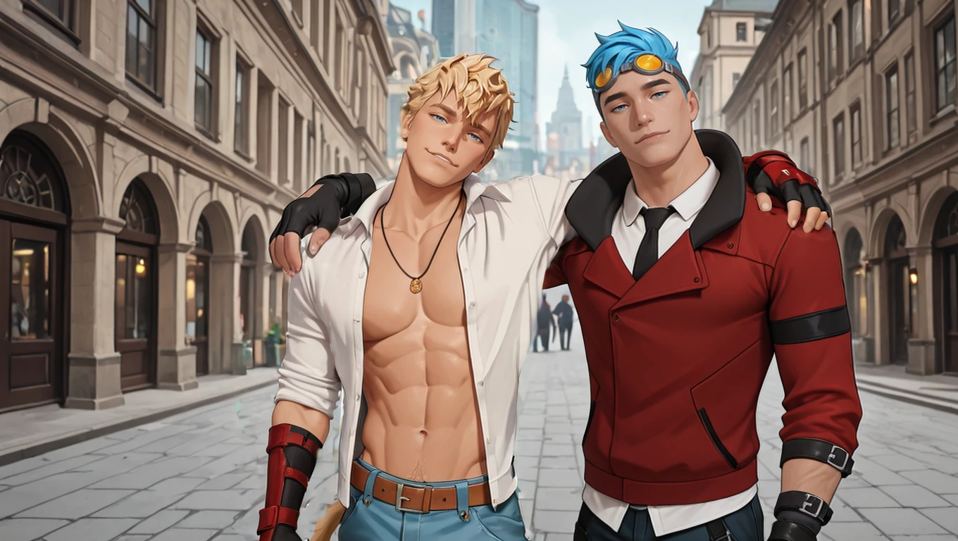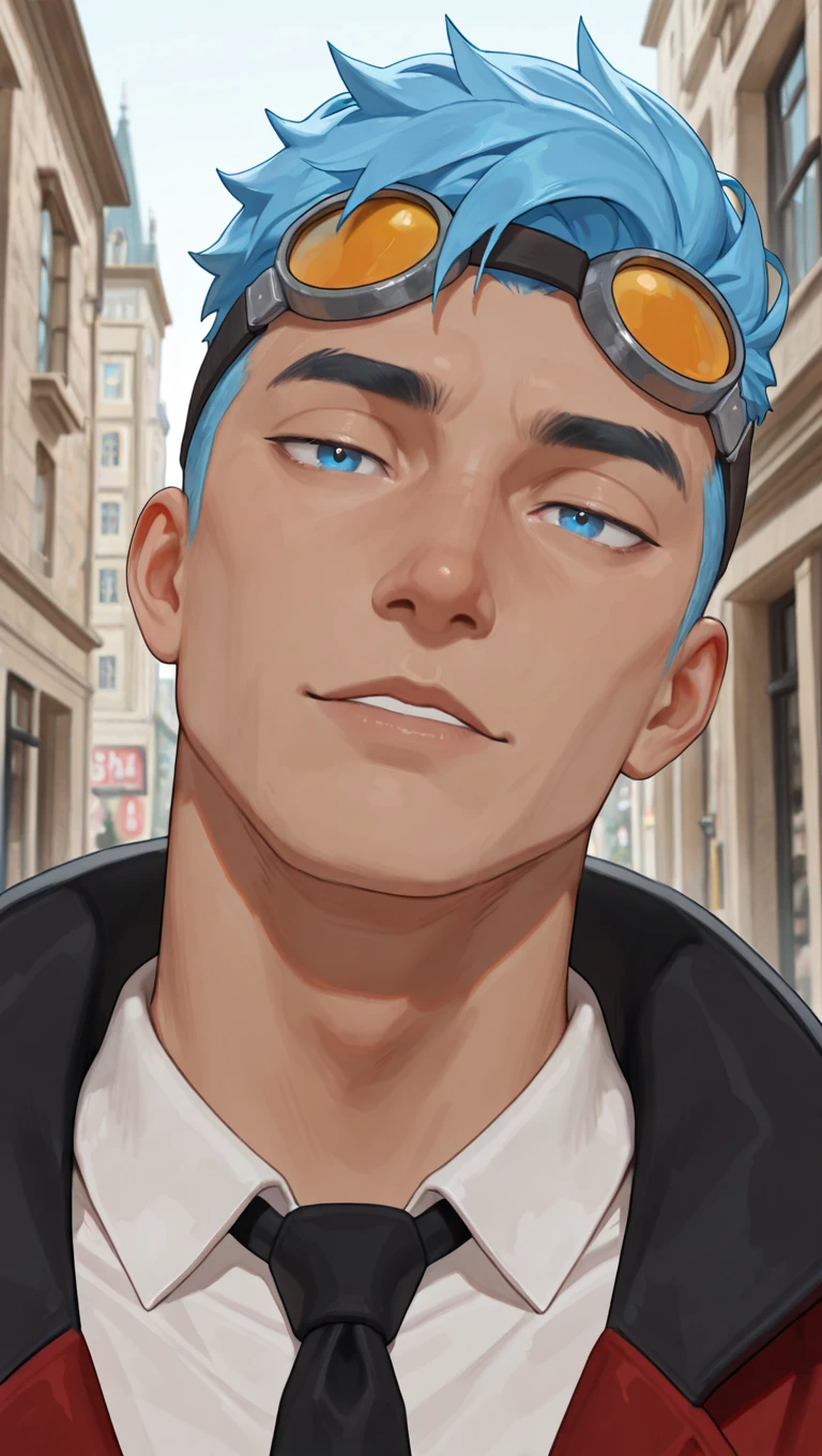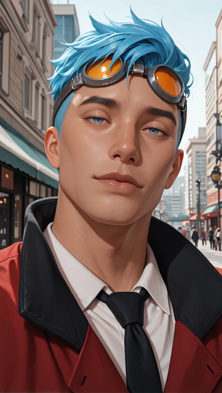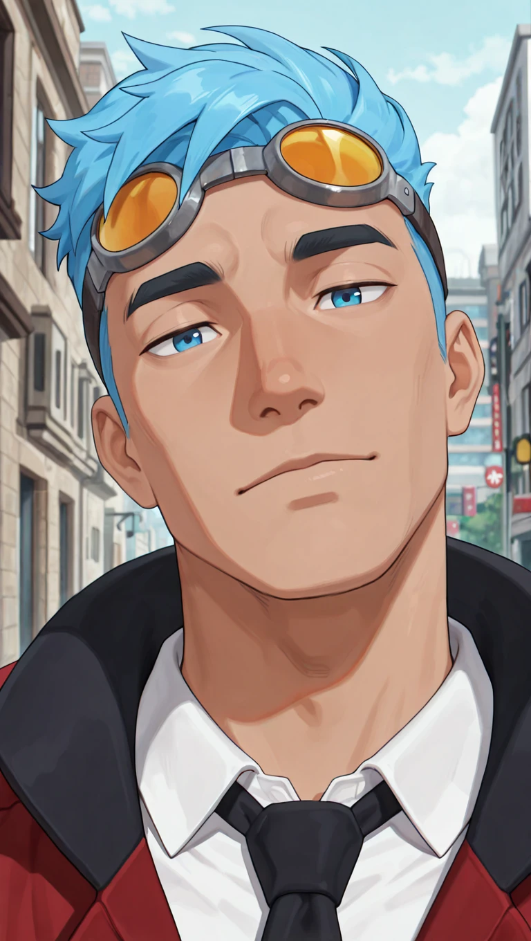 goggles on head, red jacket, white collared shirt, black necktie, black gloves, dark blue pants, black footwear