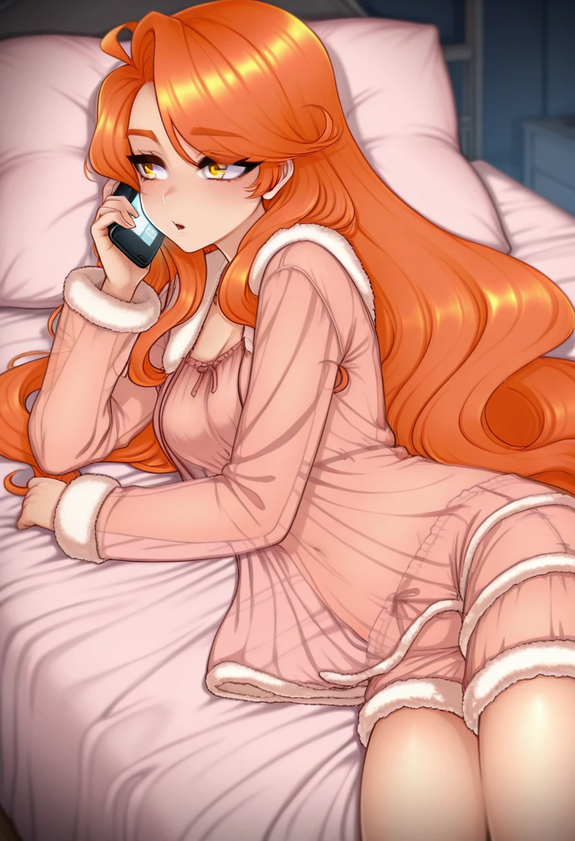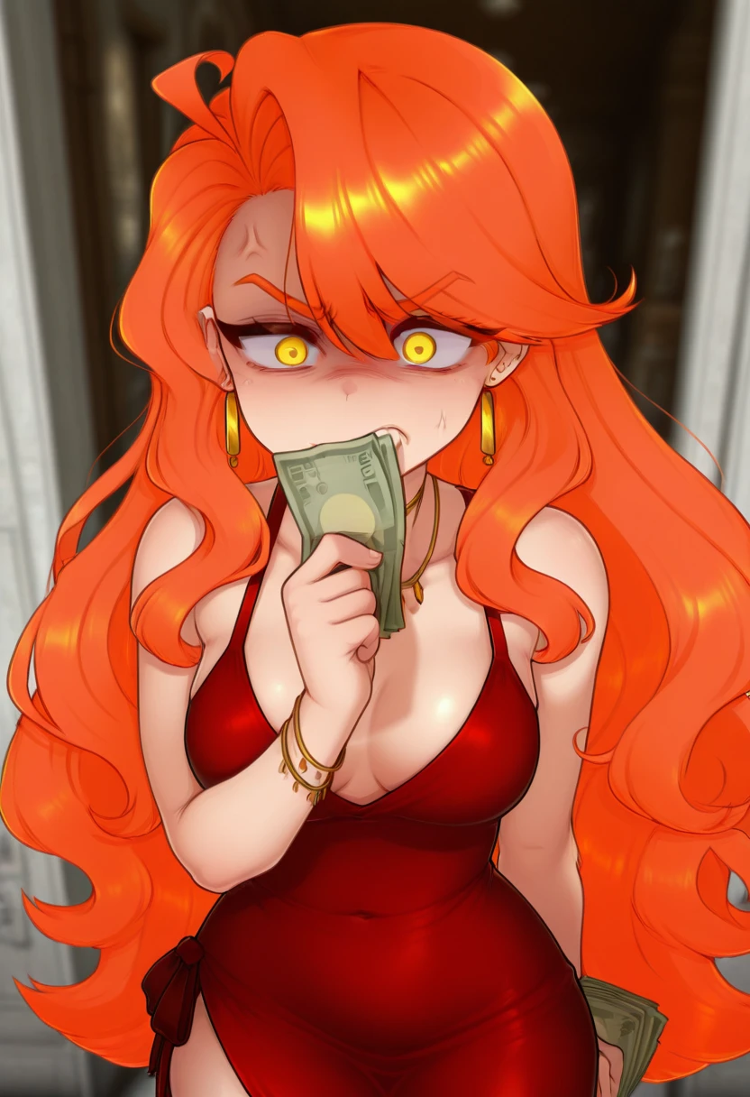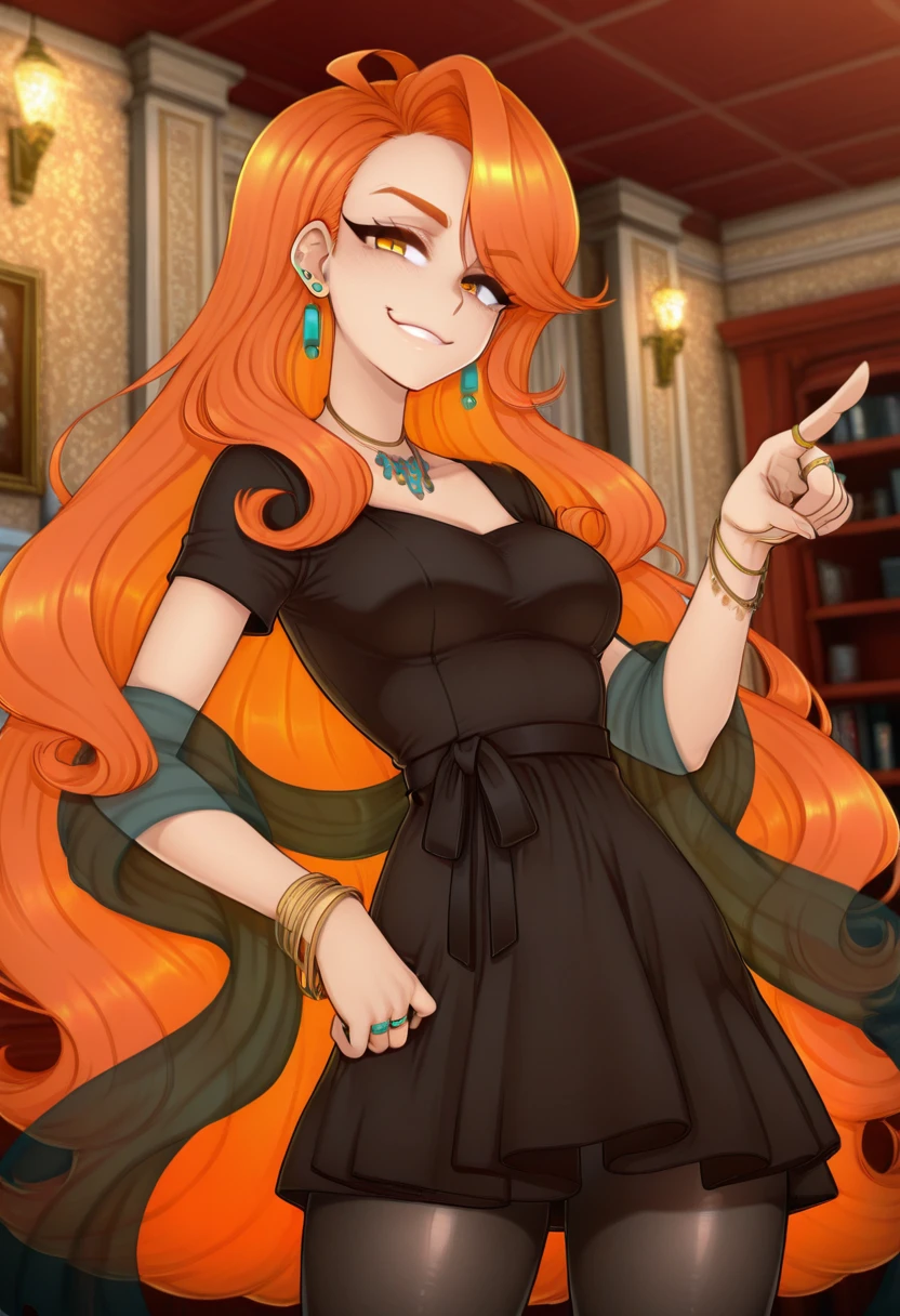 stacey_lugame, orange hair, yellow eyes, very long hair, medium breasts,I attempted to tag her outfits in the game as follows: