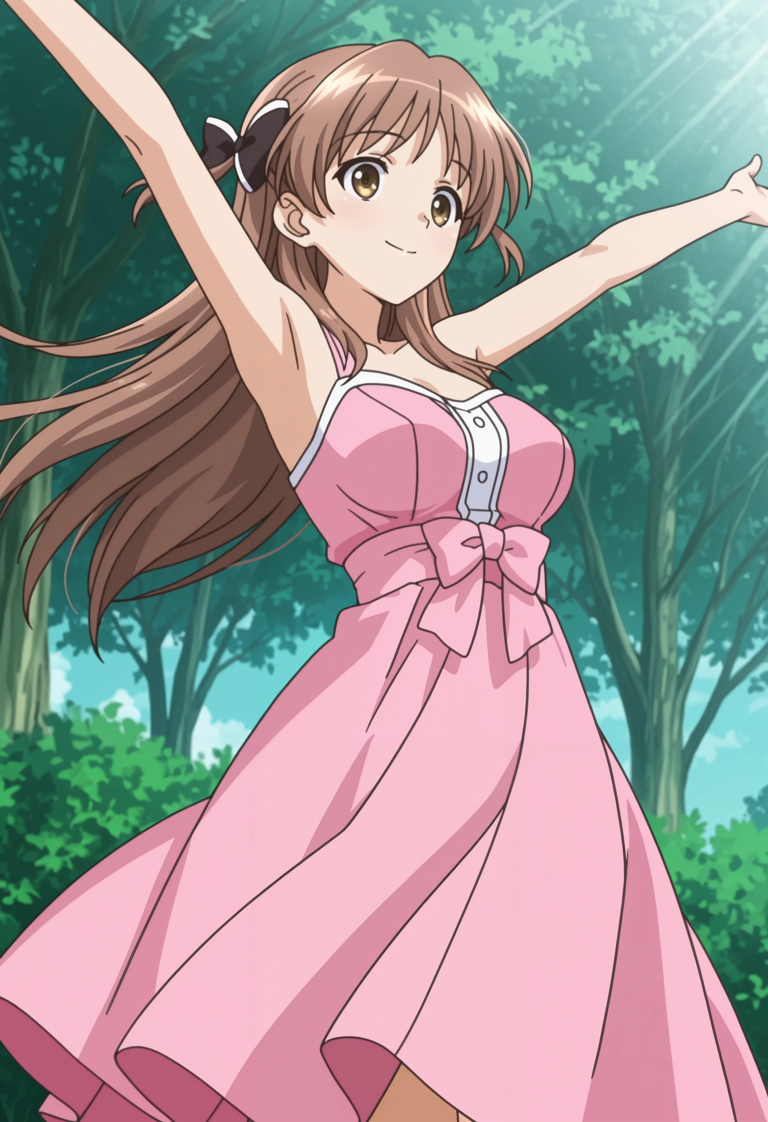 black hair bow, pink dress, bare shoulders,