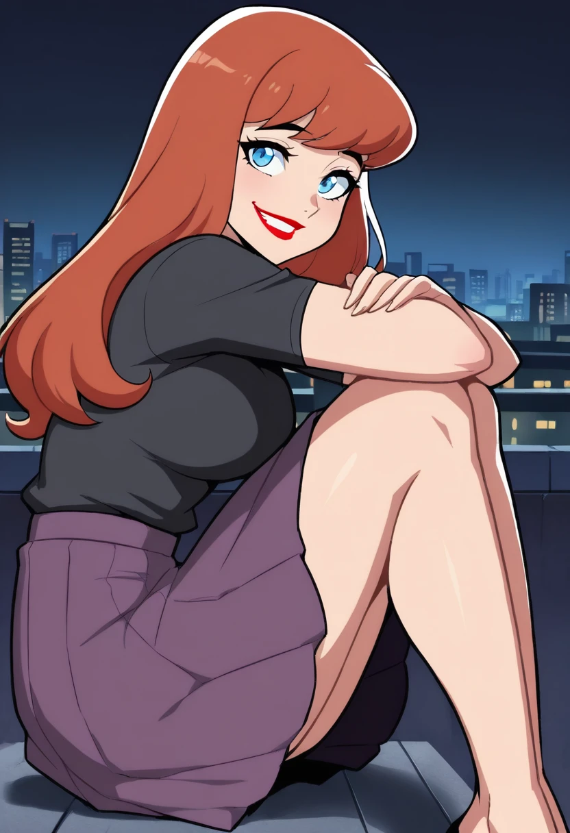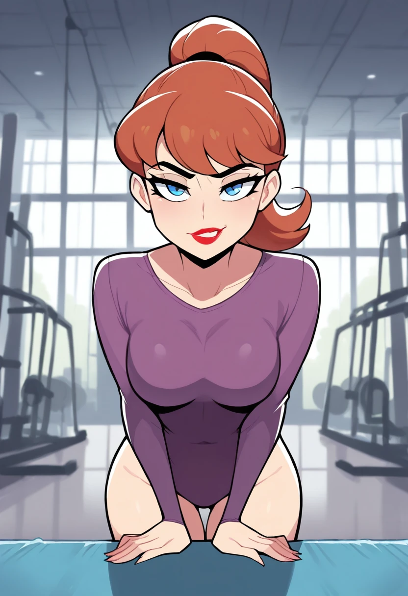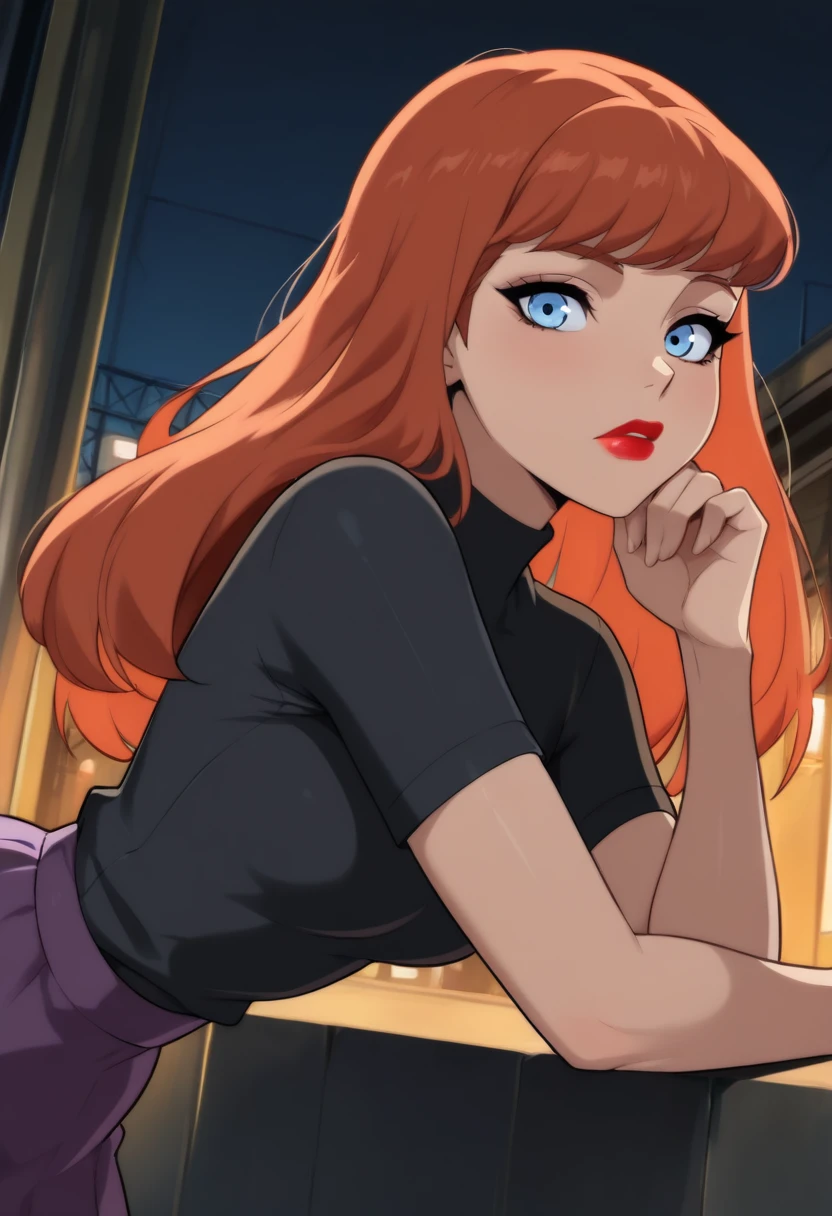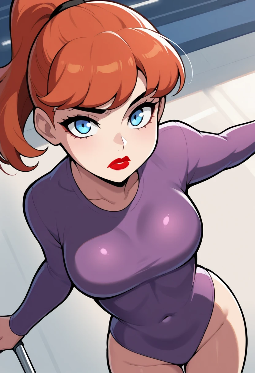 barbara gordon,orange hair,red lips,blue eyes,high ponytail