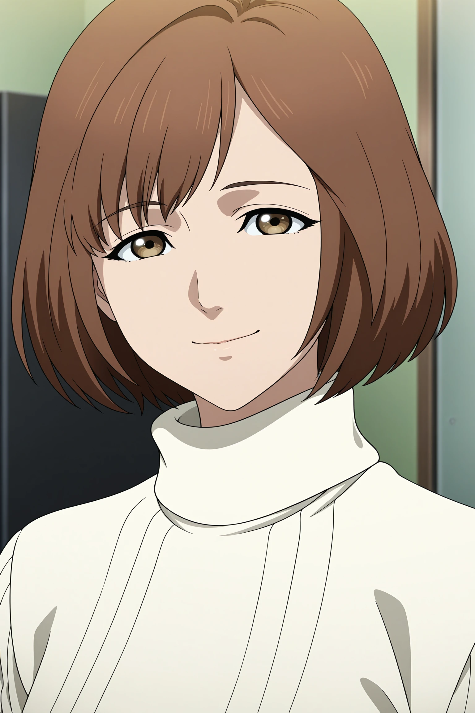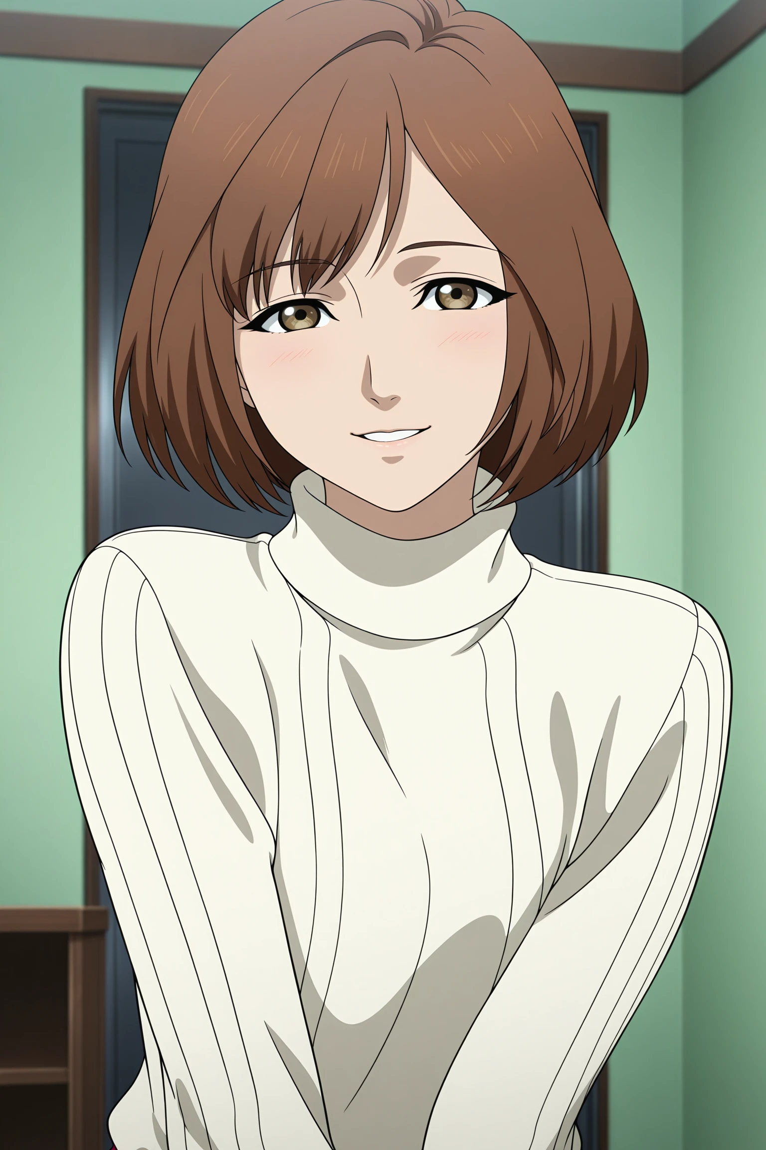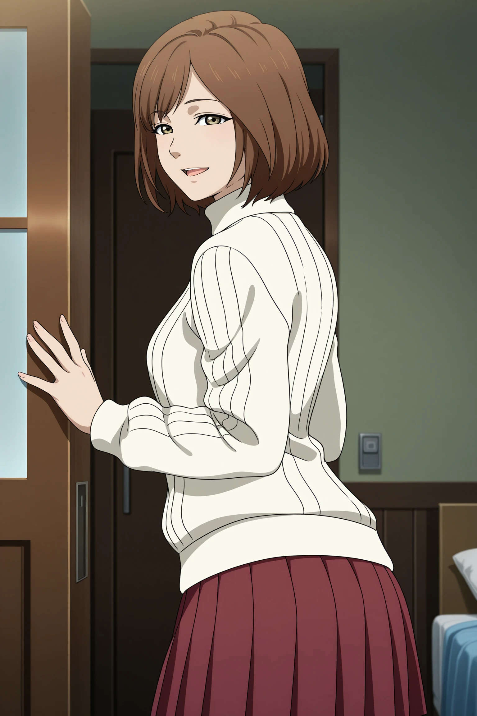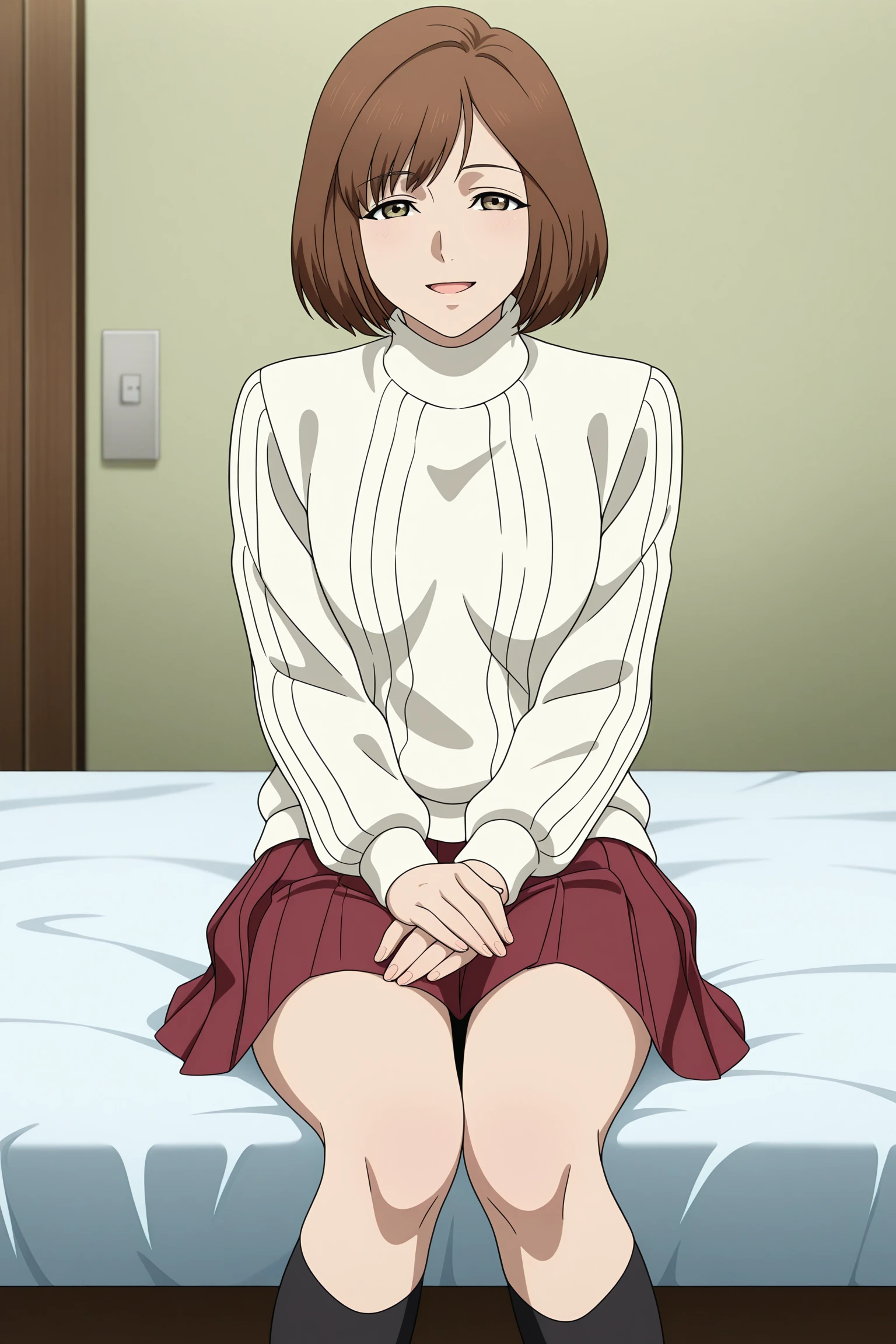 harasaki nozomi, short hair, brown hair, parted bangs, brown eyes, long sleeves, white sweater, aran sweater, turtleneck, untucked shirt, red skirt, pleated skirt, black socks, kneehighs, brown footwear, loafersBrown Jacket