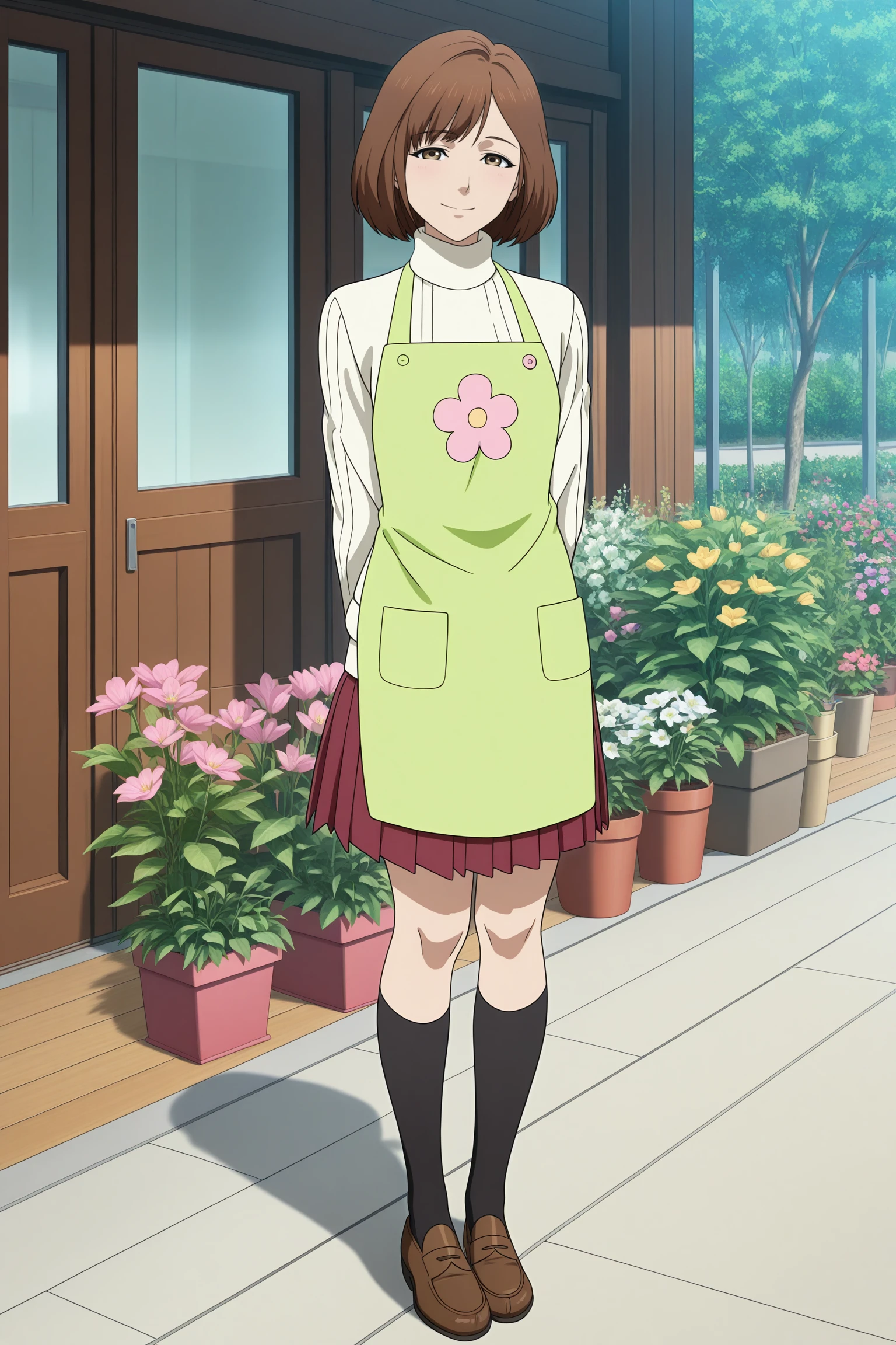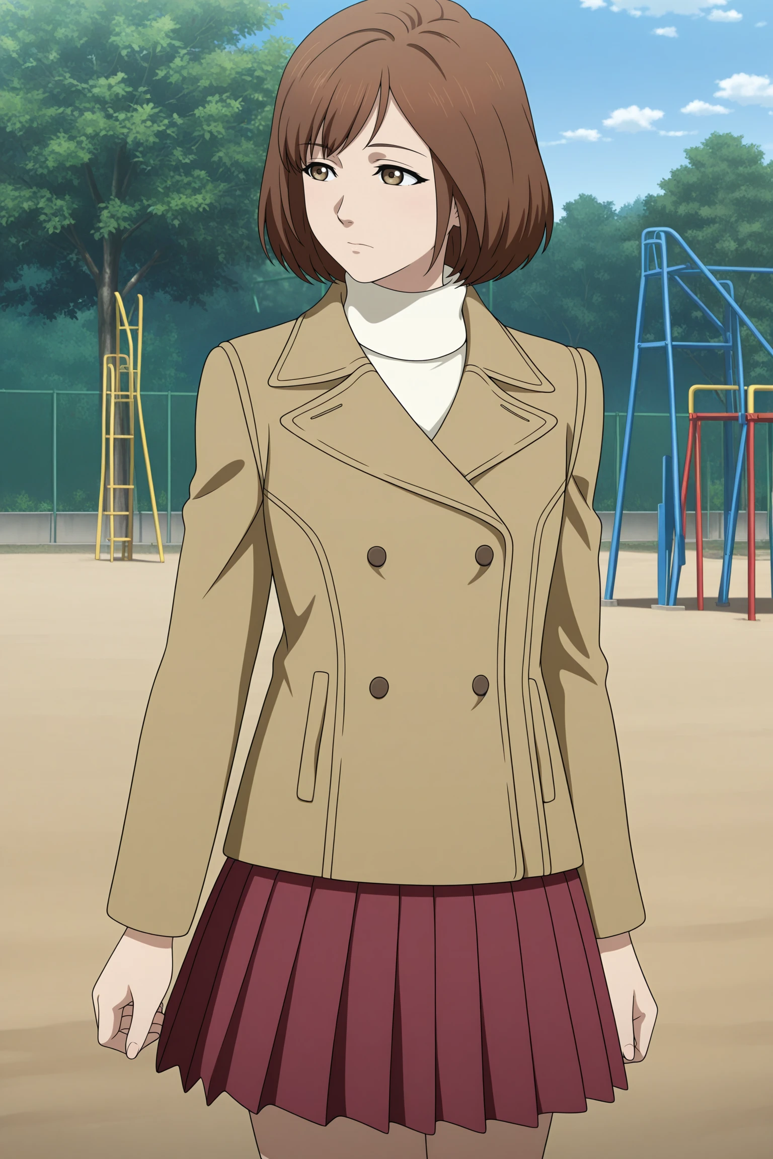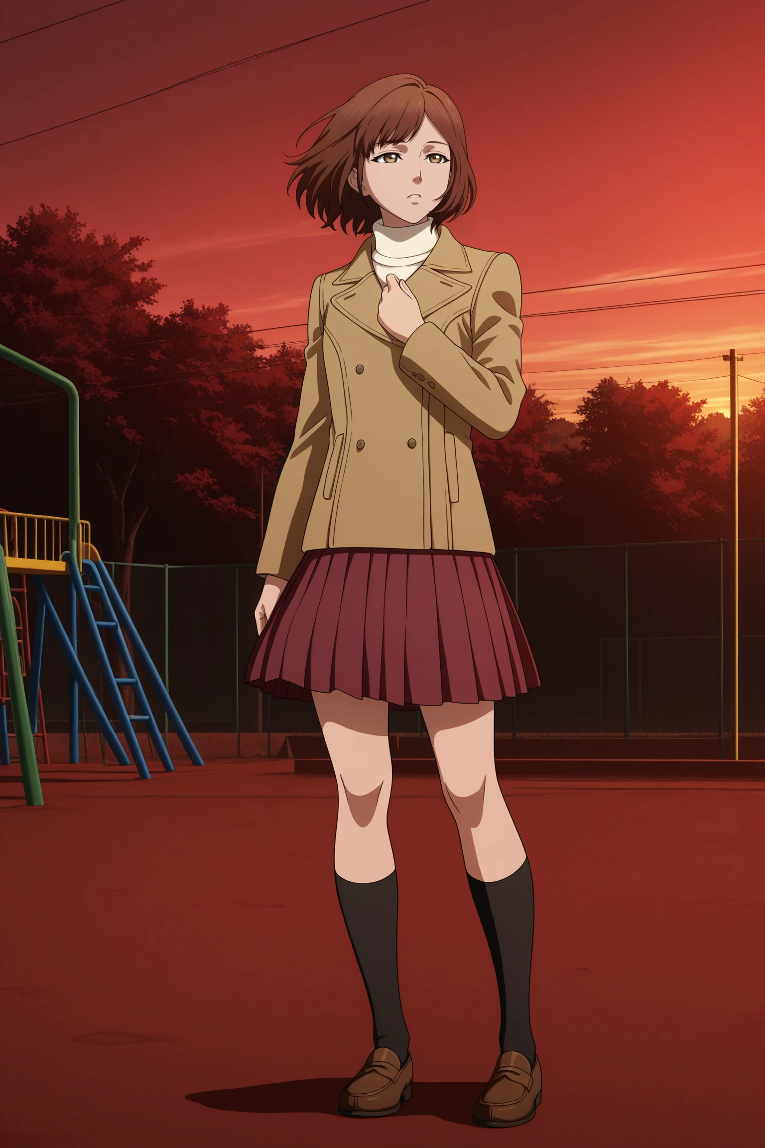 harasaki nozomi, short hair, brown hair, parted bangs, brown eyes, long sleeves, brown jacket, double-breasted, white sweater, aran sweater, turtleneck, red skirt, pleated skirt, black socks, kneehighs, brown footwear, loafersDescription