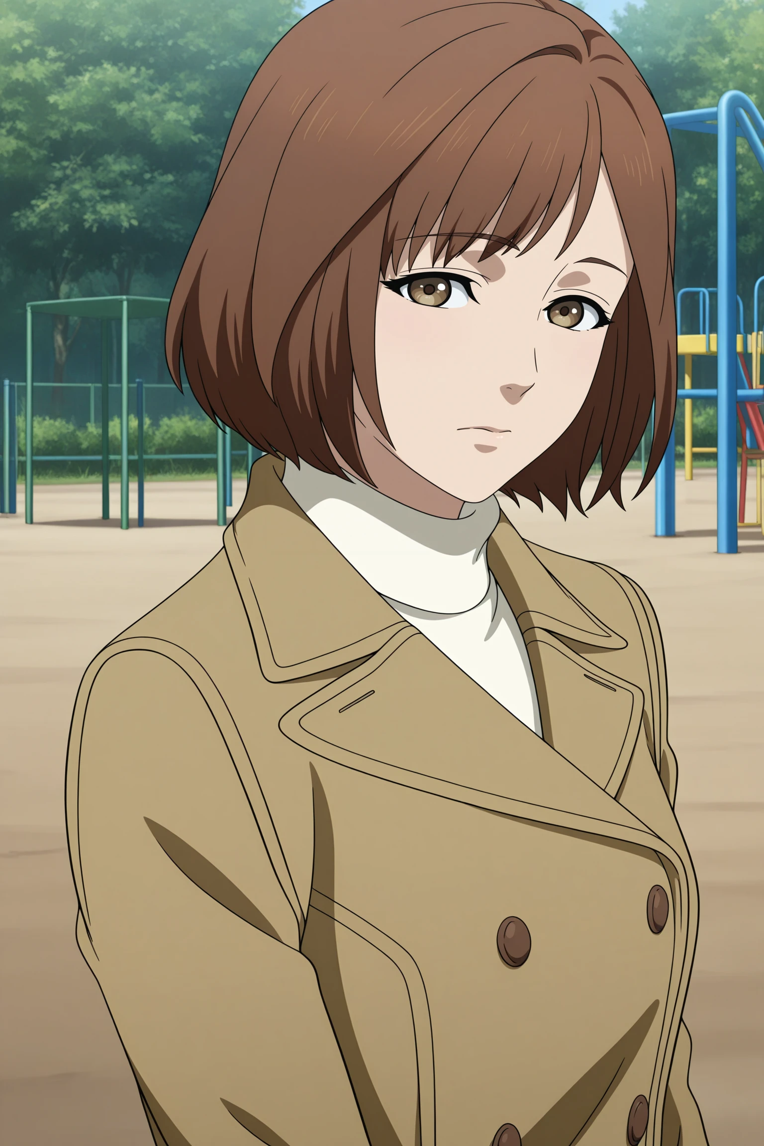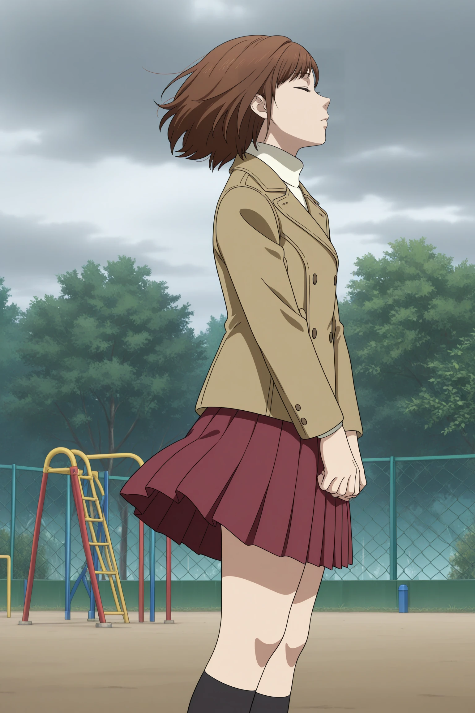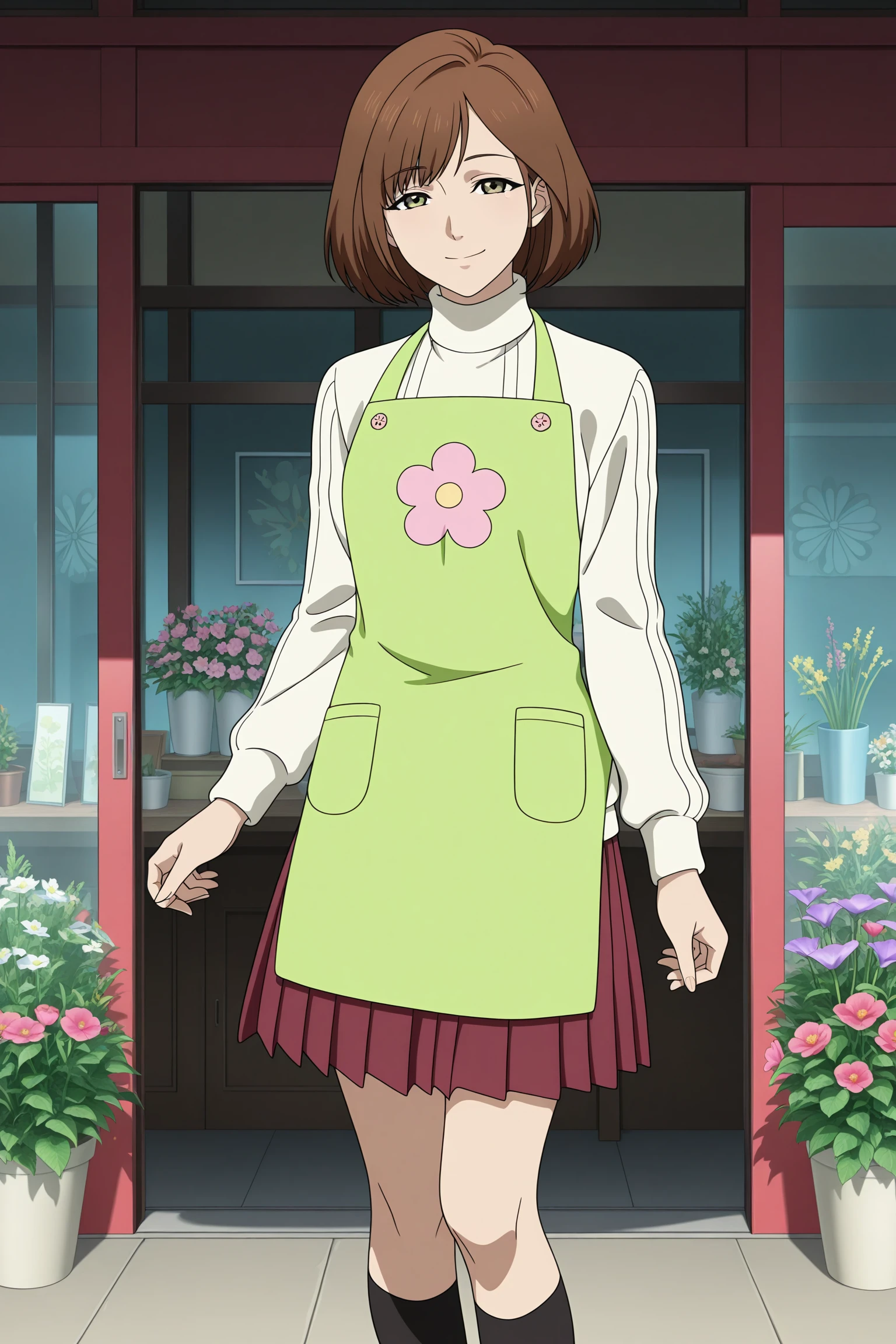 harasaki nozomi, short hair, brown hair, parted bangs, brown eyes, long sleeves, brown jacket, double-breasted, white sweater, aran sweater, turtleneck, red skirt, pleated skirt, black socks, kneehighs, brown footwear, loafersDescription