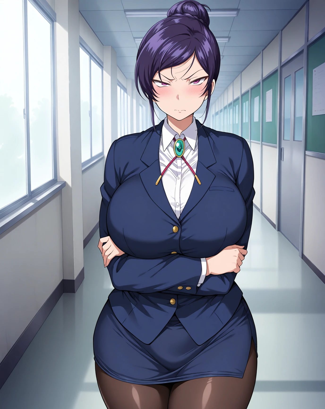 blue jacket,white shirt, brooch tie, blue pencil skirt,brown pantyhose