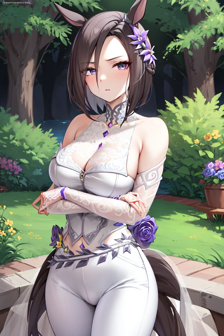 purple flower, wedding dress, white pants, cleavage, bare shoulders, purple rose, crossed arms, official alternate costume, parted lips, collarbone, shirt, parted bangs, hair flower, see-through