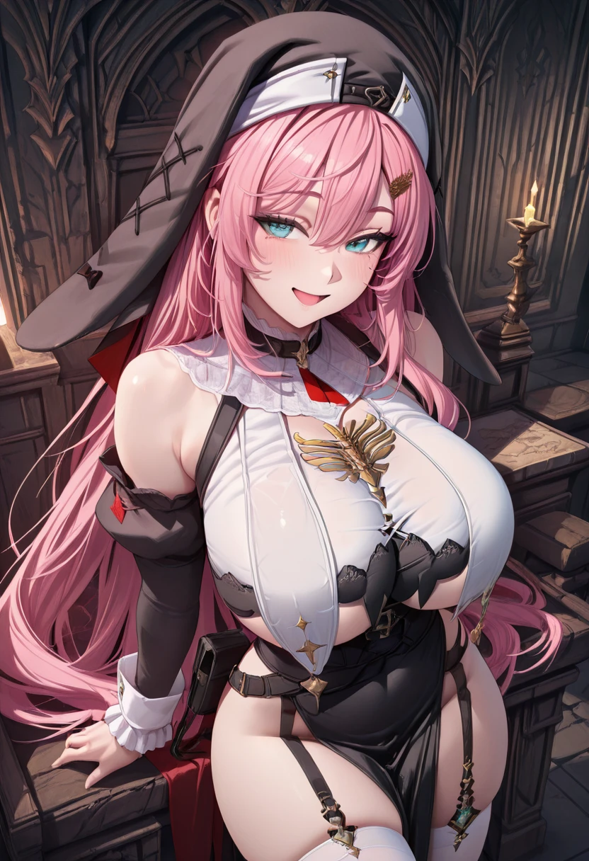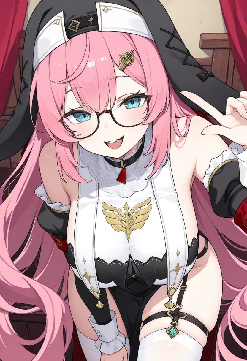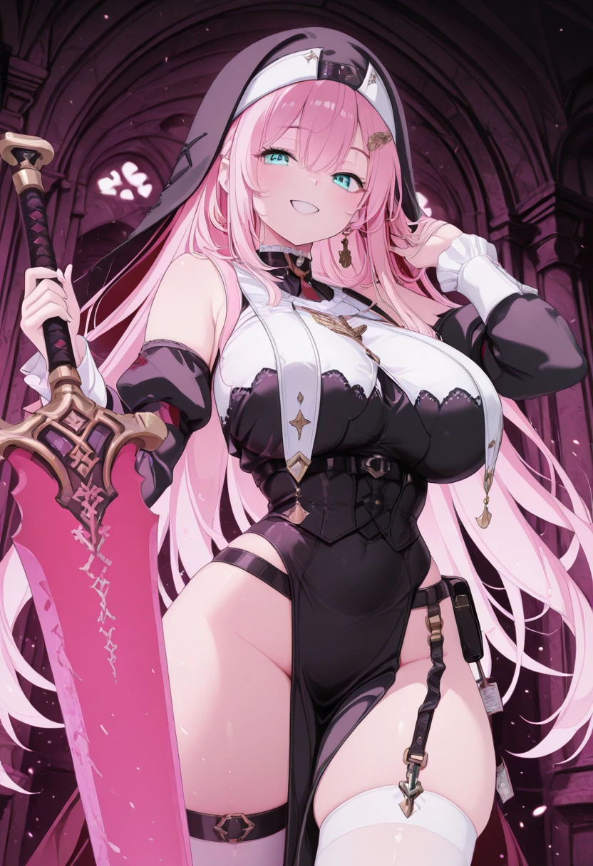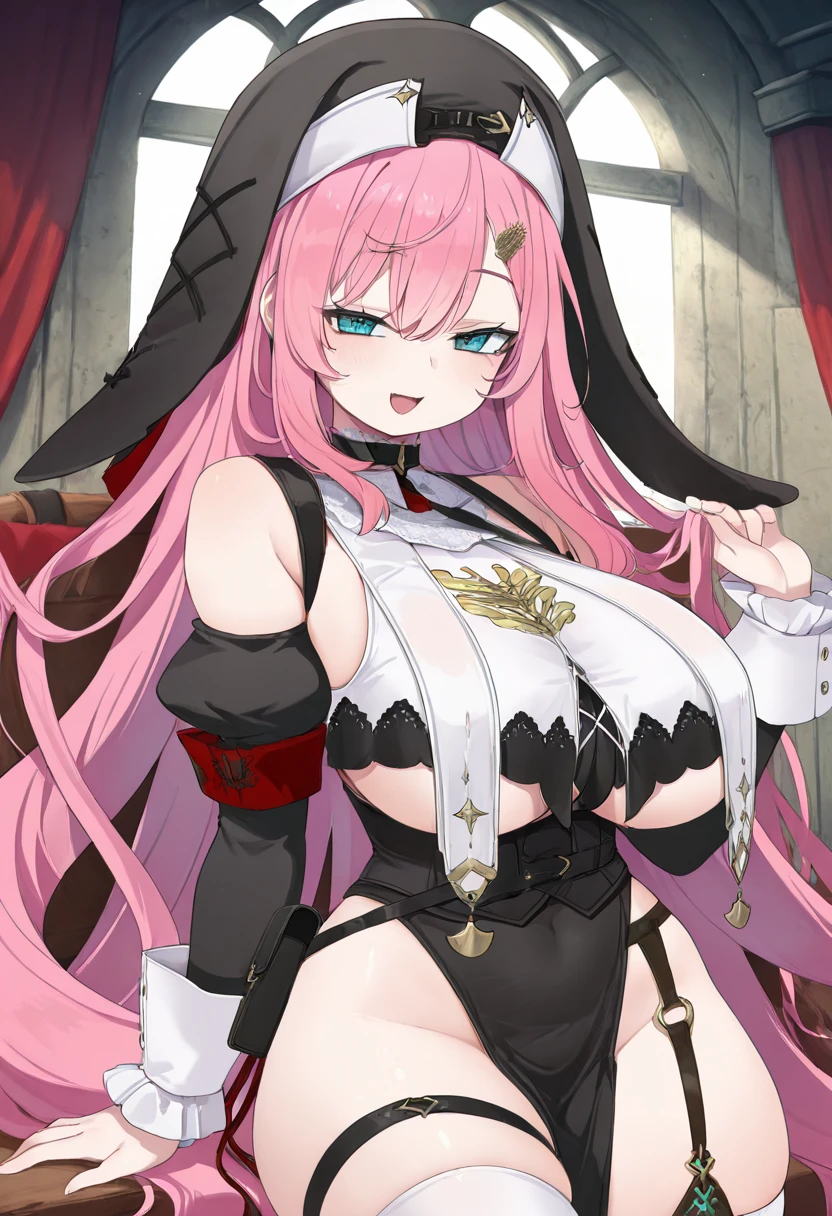 zzGerie, aqua eyes, pink hair, long hair, hair between eyes, nun, black headwear, white thighhighs, garter straps, reast curtains, detached sleeves, ,