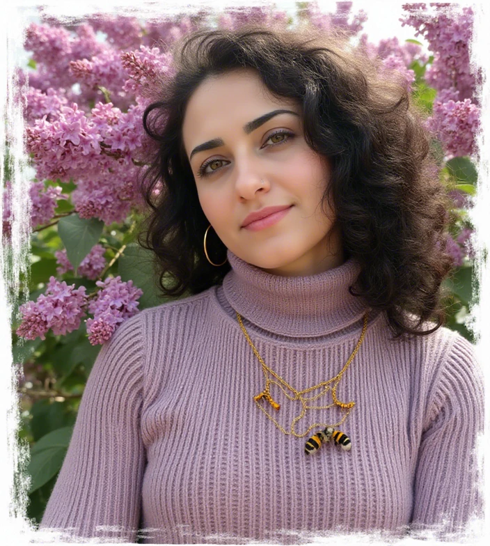 Example prompt: Portrait of a woman, Intricate jewel embellished turtleneck sweater, in a warm and vibrant outdoor background filled with nature, leaves, and soft bathed in golden sunlight. Enigmatic woman wearing a vintage turtleneck or a jacket with retro details over a T-shirt, adorned with Art Deco jewelry. The background is a blurred riverbank, with golden reflections in the water and reeds swaying in the wind