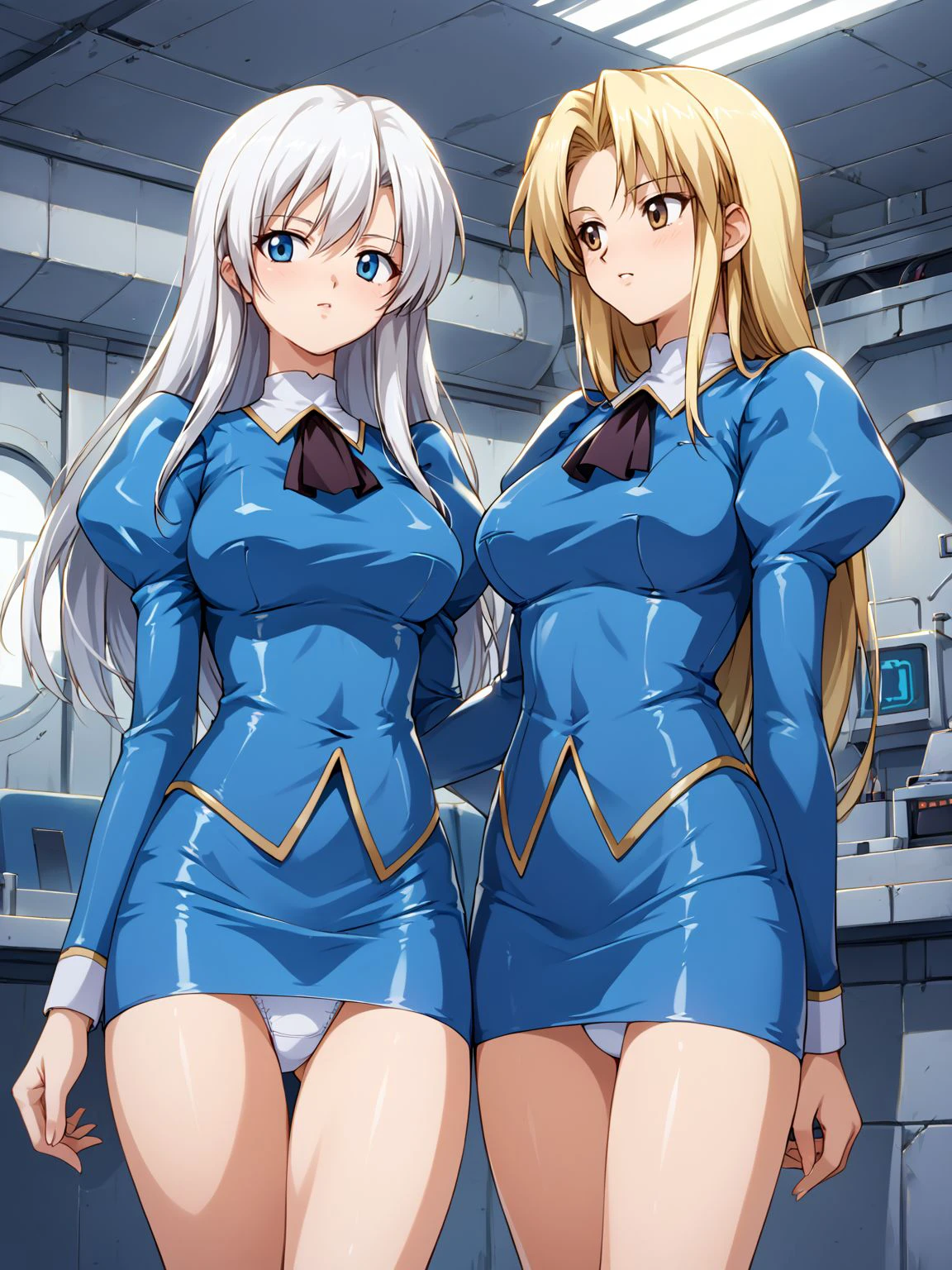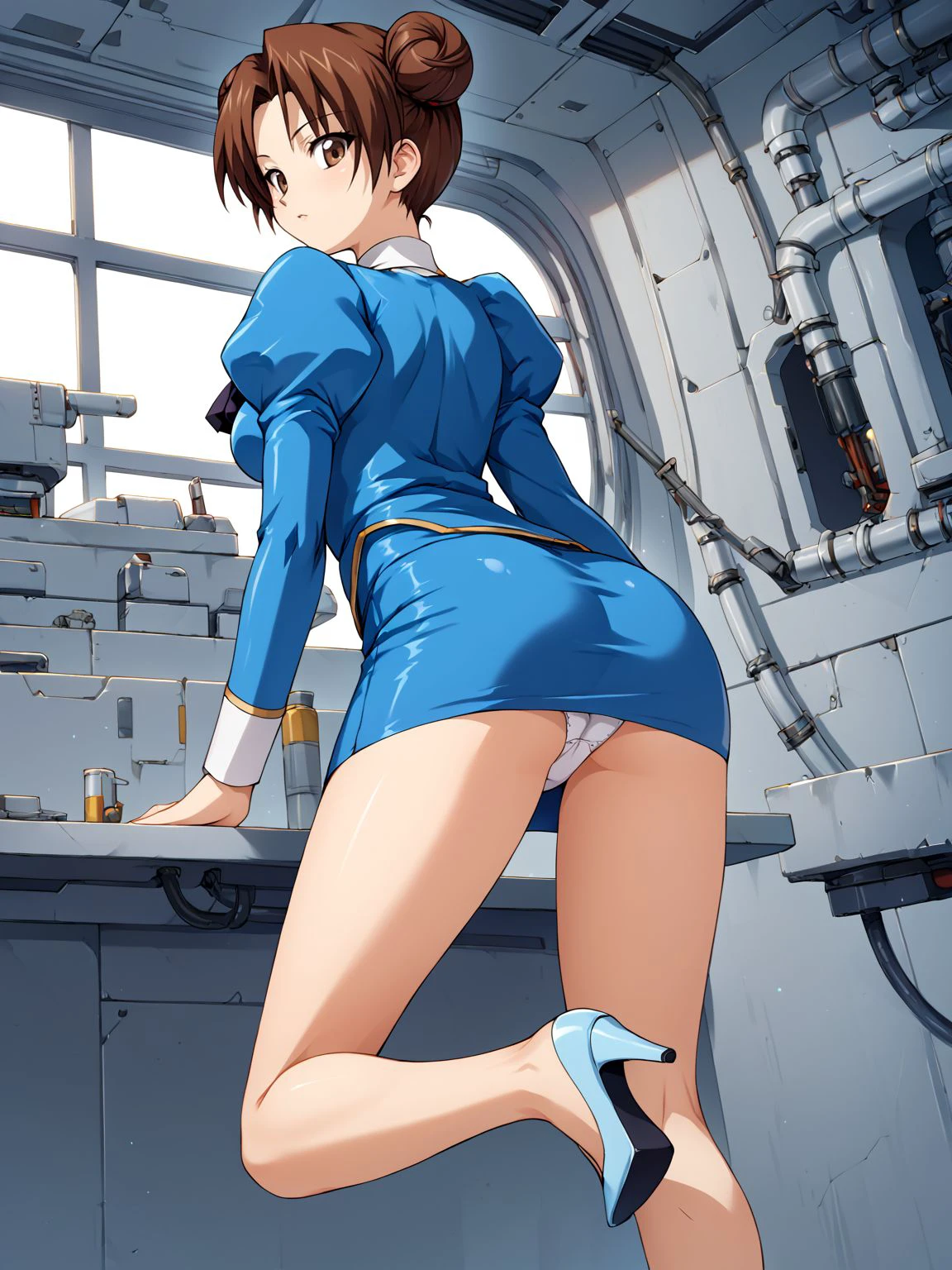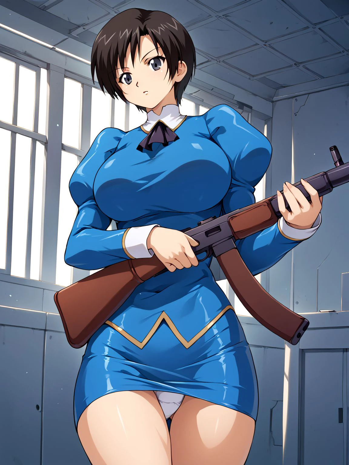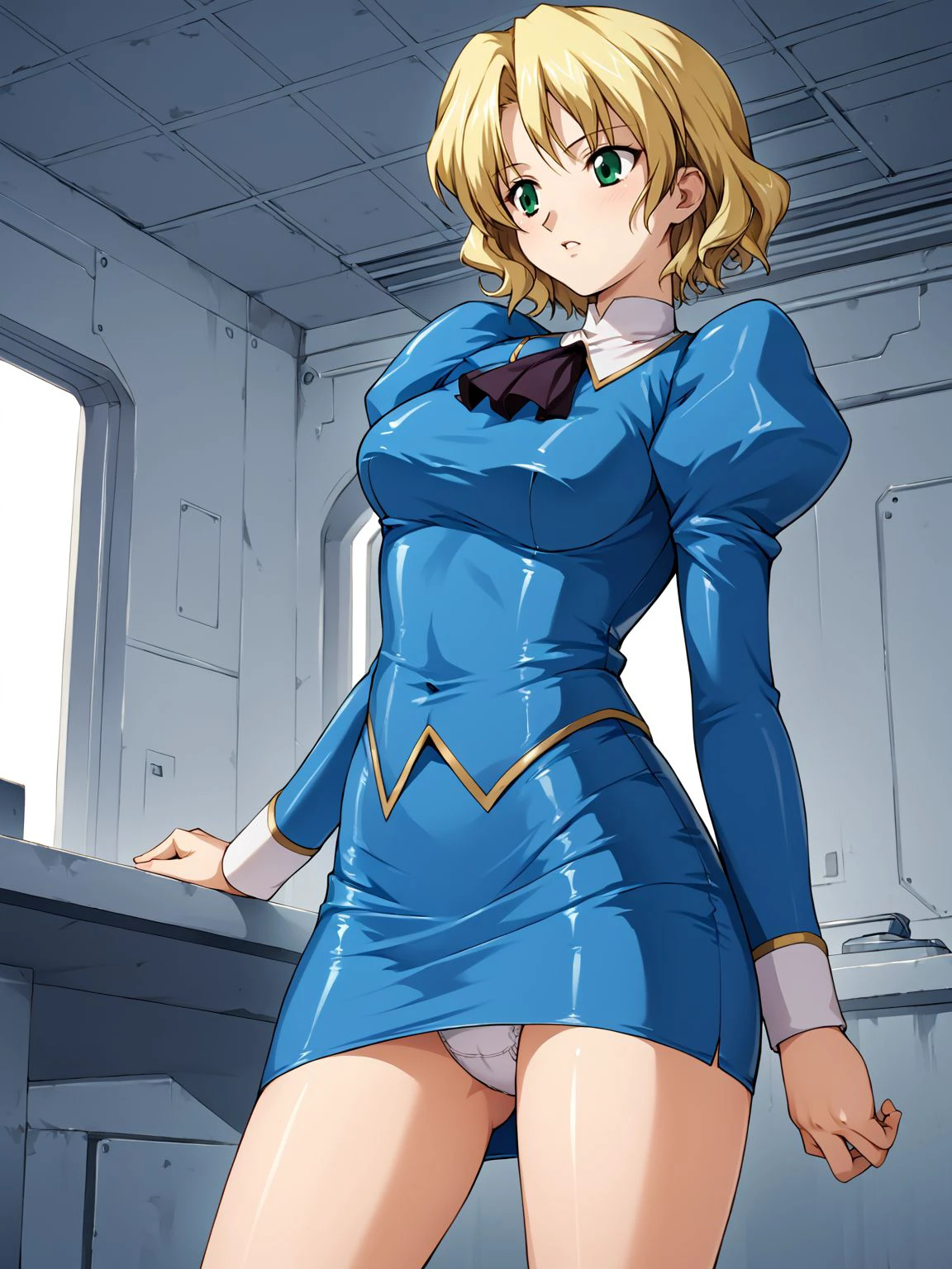 juliet sleeves,skirt,pencil skirt,blue skirt,miniskirt,uniform,long sleeves,puffy sleeves,jacket,blue jacket,ascot,black ascot,