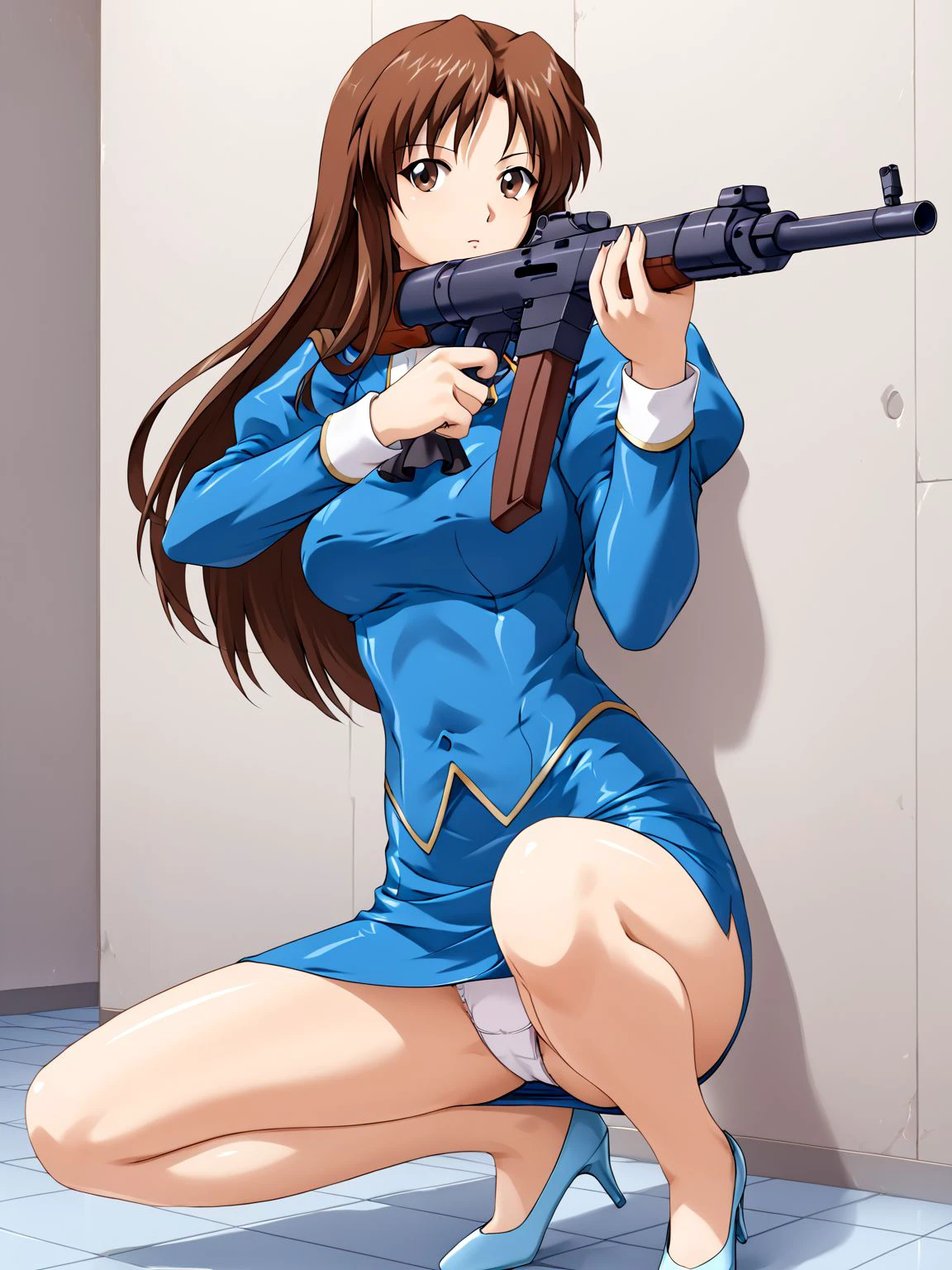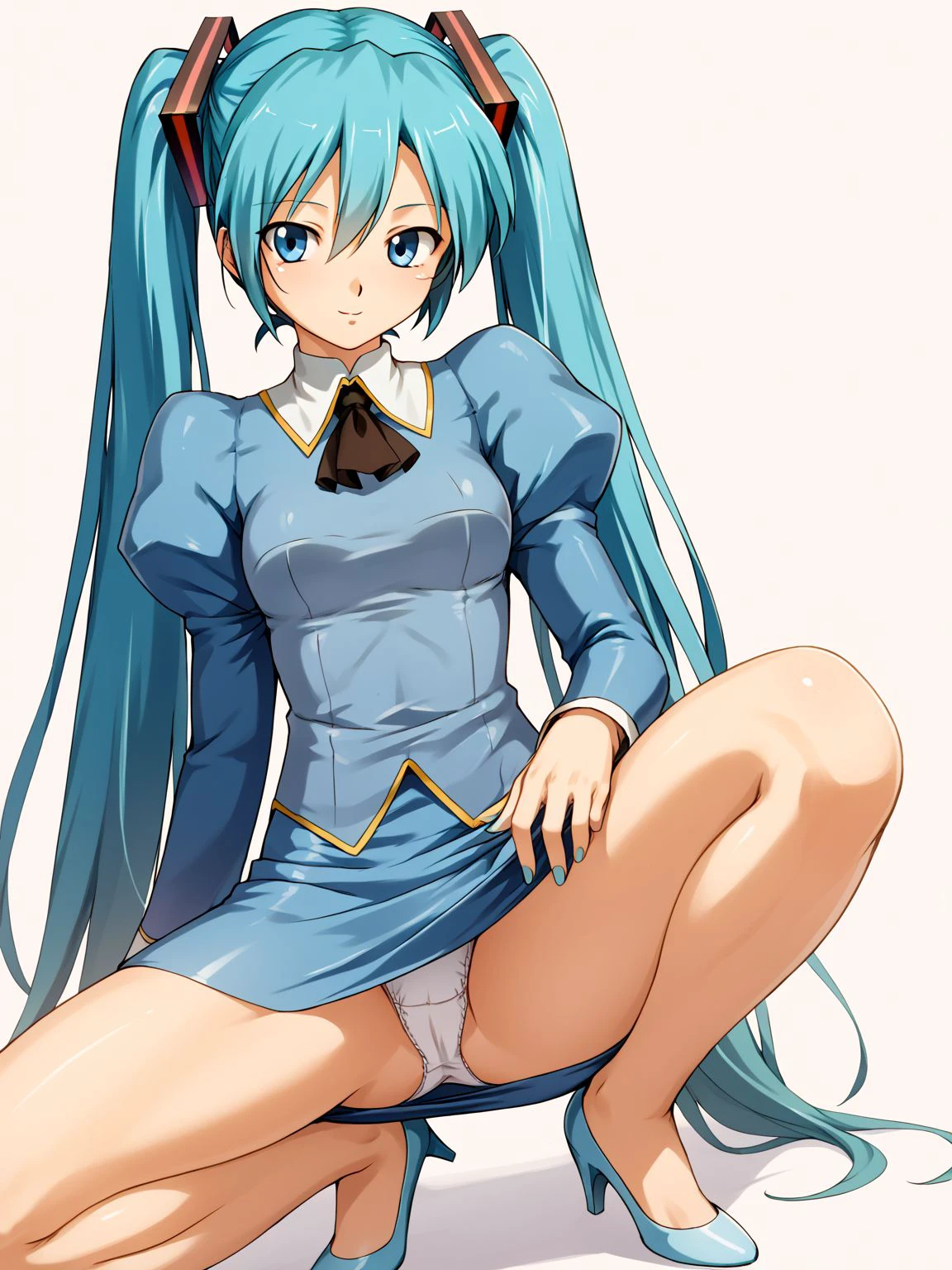 high heels,blue footwear,bare legs,