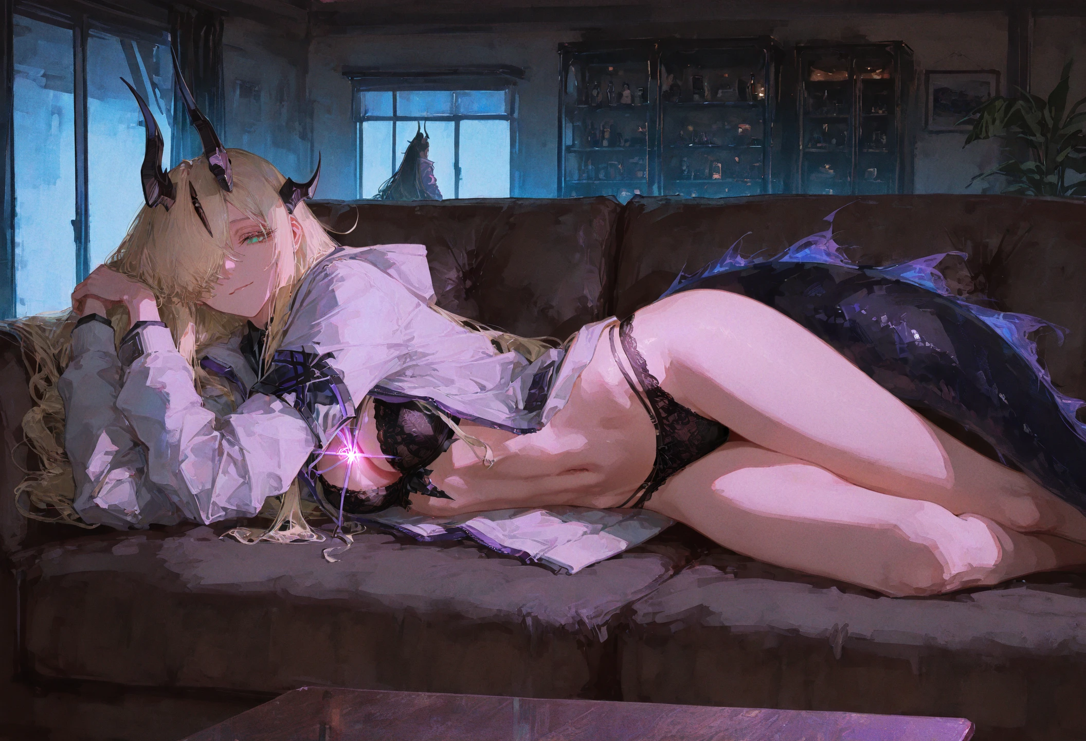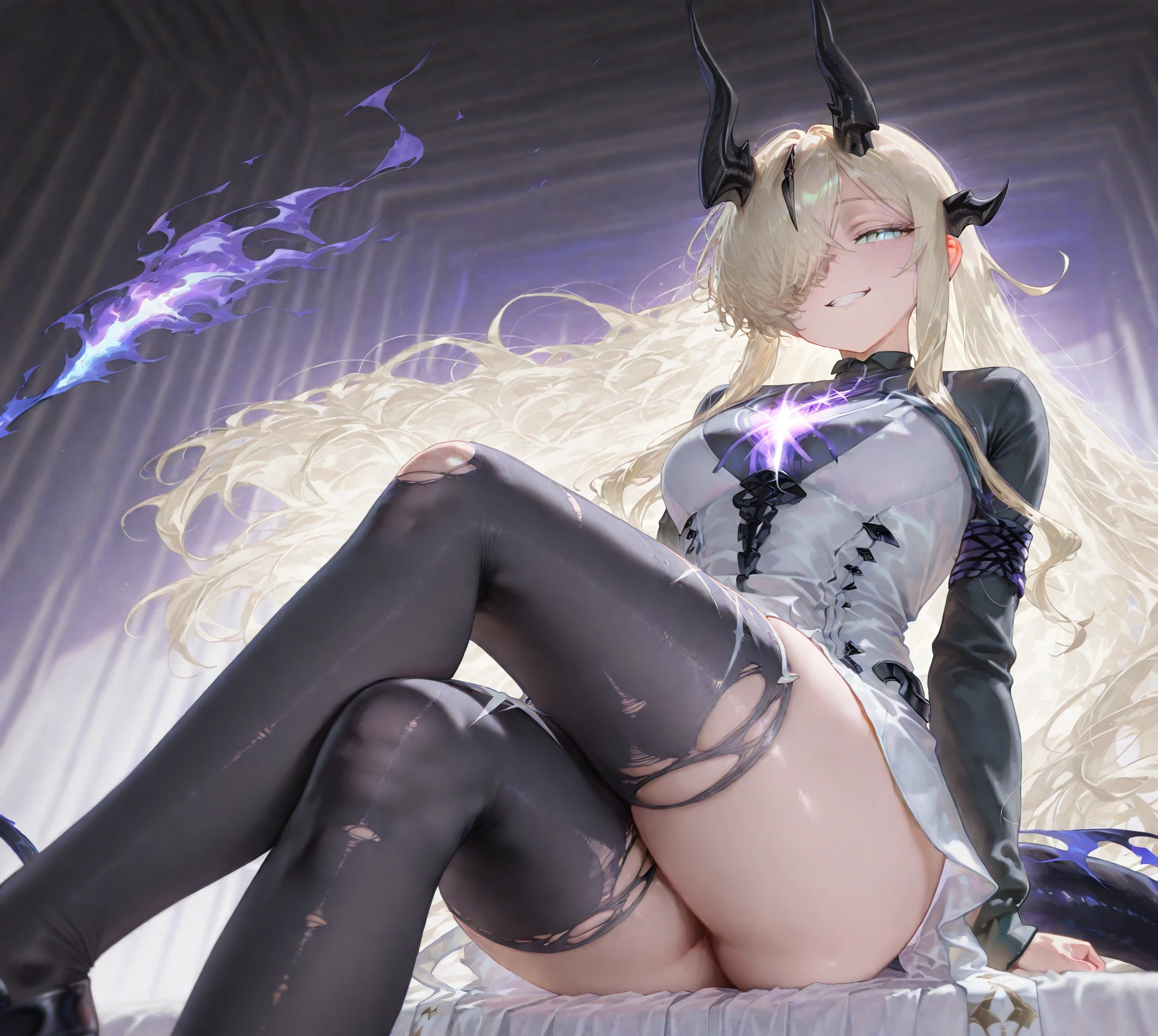 eblana, long hair, hair over one eye, horns, tail,