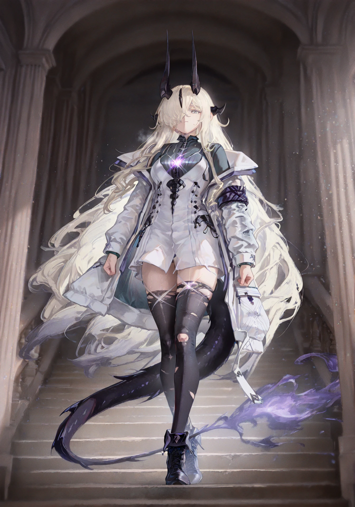 white dress, white jacket, black sweater, chest glint, torn thighhighs,