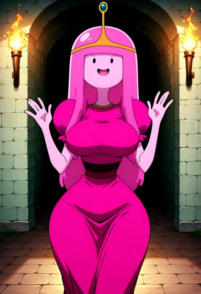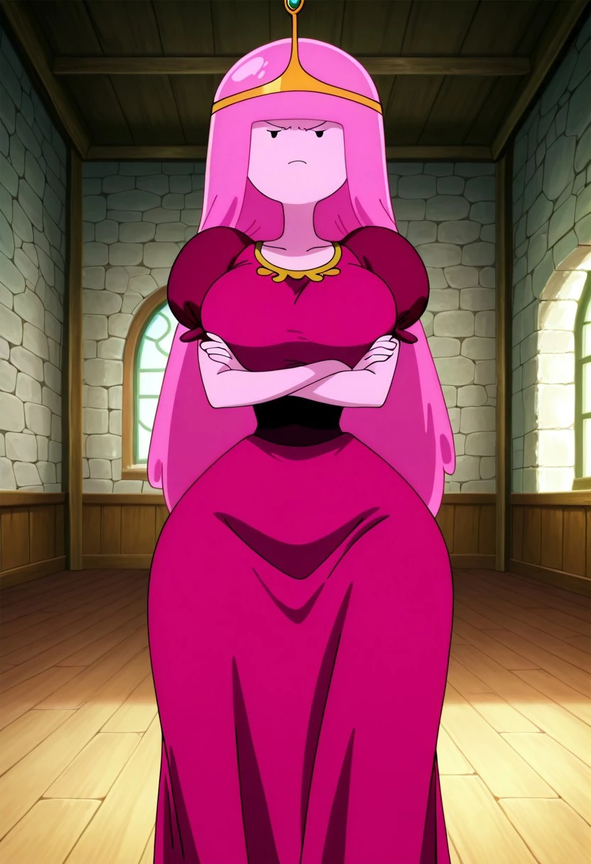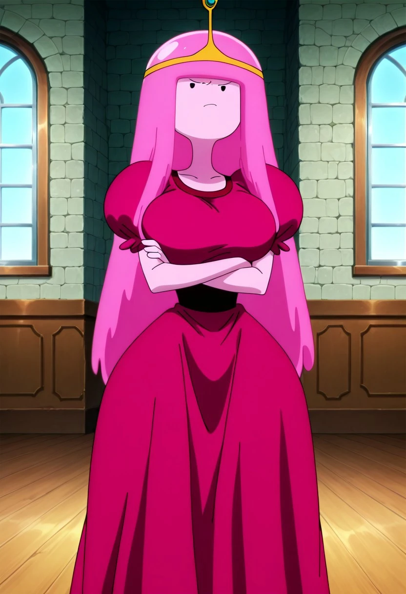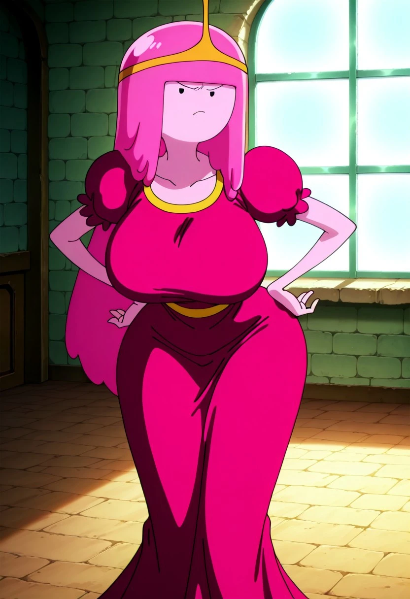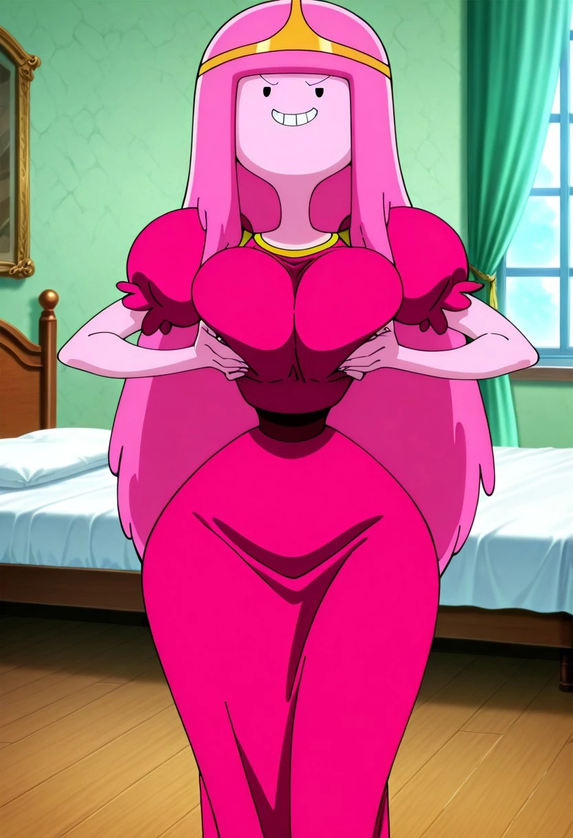 Peebs, pink hair, long hair, dot eyes, pink skin, huge breasts, round breasts, hourglass figure, bubble-butt, tiara,