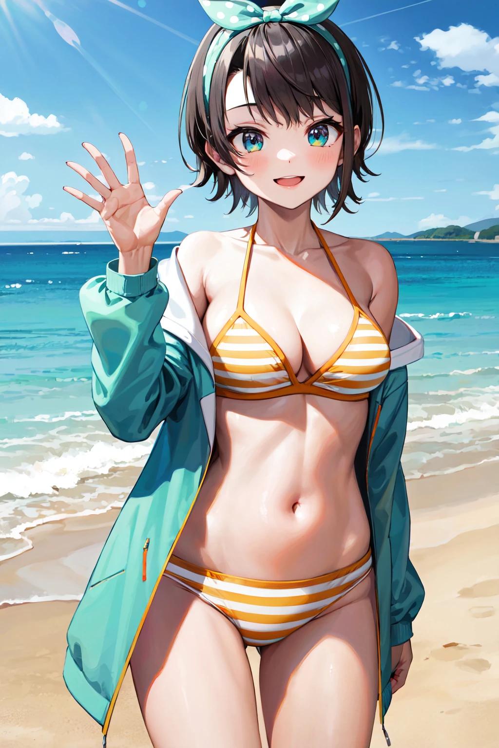 outfit7ggsubaru, short hair, bow hairband, polka dot, collarbone, cleavage, striped bikini, aqua jacket, open jacket, long sleeves