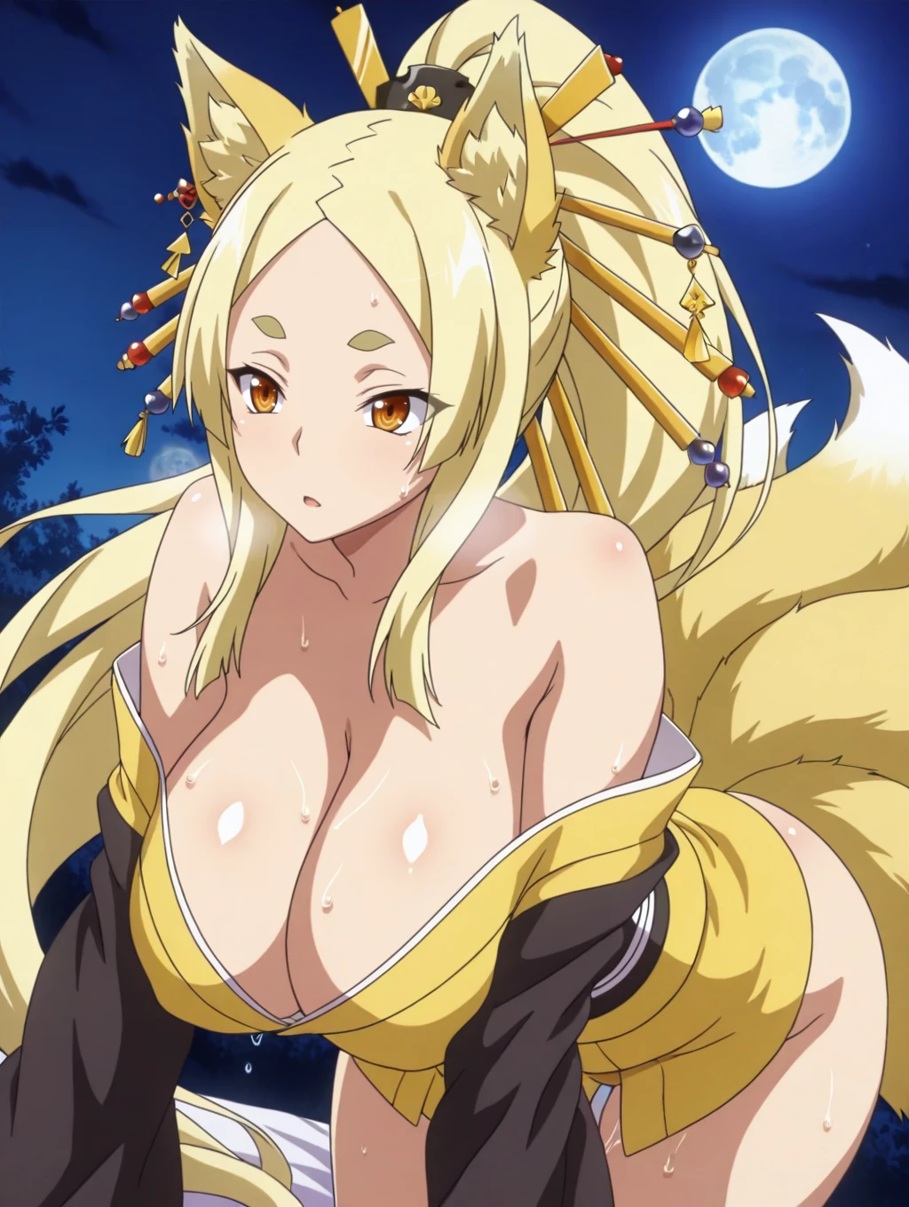 Recommended weight 7-1 appearance: yasaka, range eyes, thick eyebrow, blonde hair, very long hair, parted bangs,Black eyeliner, shinny body, shinny skin, ponytail, fox ears, fox tail, multiple tails, hair ornament, hair stick, huge breast, curvy, wide hips,