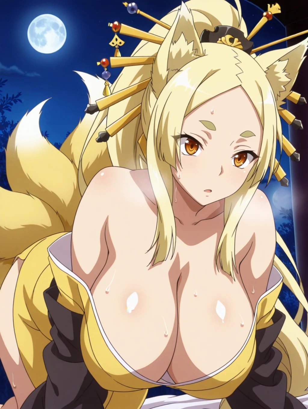yasaka, orange eyes, thick eyebrow, blonde hair, very long hair, parted bangs,Black eyeliner, shinny body, shinny skin, ponytail, fox ears, fox tail, multiple tails, hair ornament, hair stick, huge breast, curvy, wide hips,