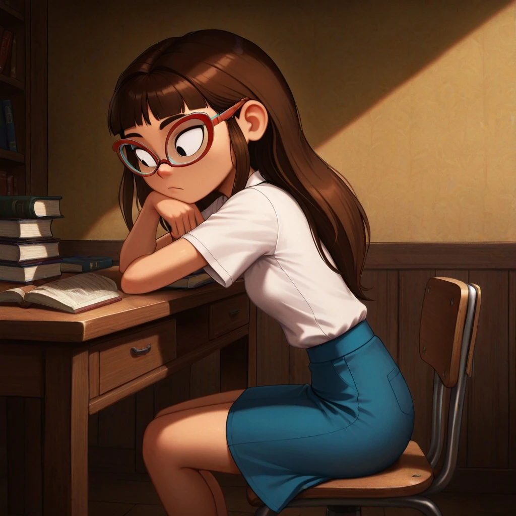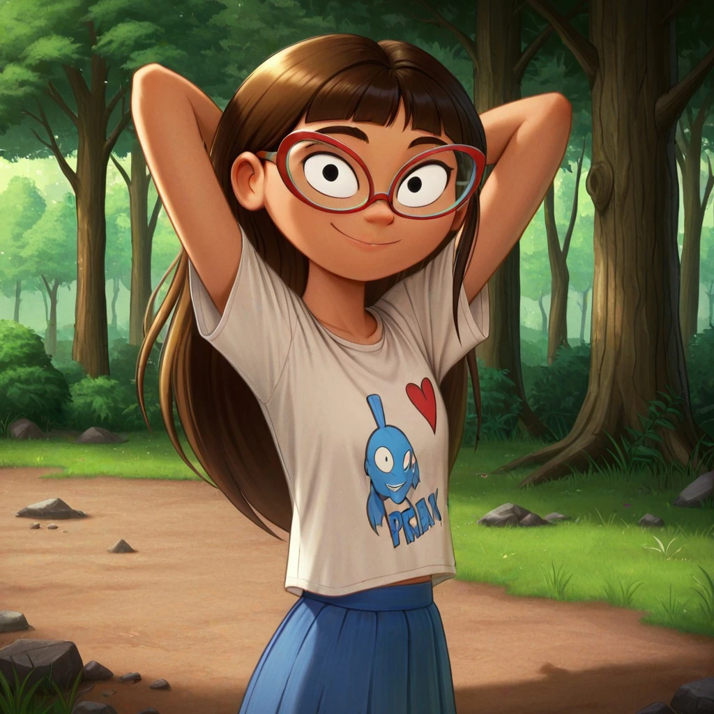 abbey_po, brown hair, long hair, black eyes, red-framed eyewear, shirt, blue skirt