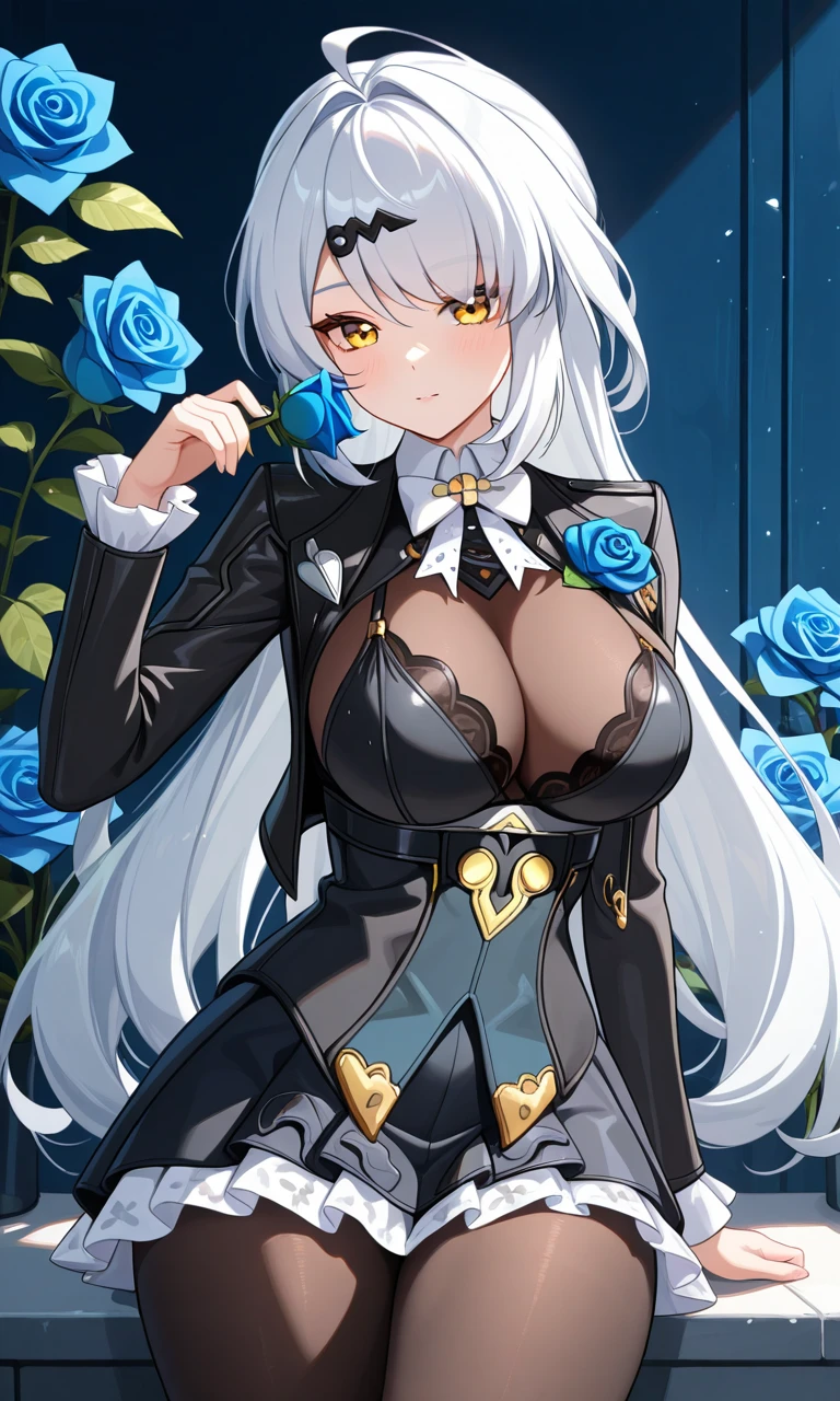 Yixuan (Zenless Zone Zero), yellow eyes, hair ornament, long hair, bangs, ahoge, large breasts, thighs, long sleeves, frills, black jacket, black pantyhose, blue rose, watson cross, white bowtie, cleavage, see-through cleavage, corsage, miniskirt, bodystocking
