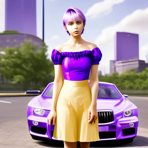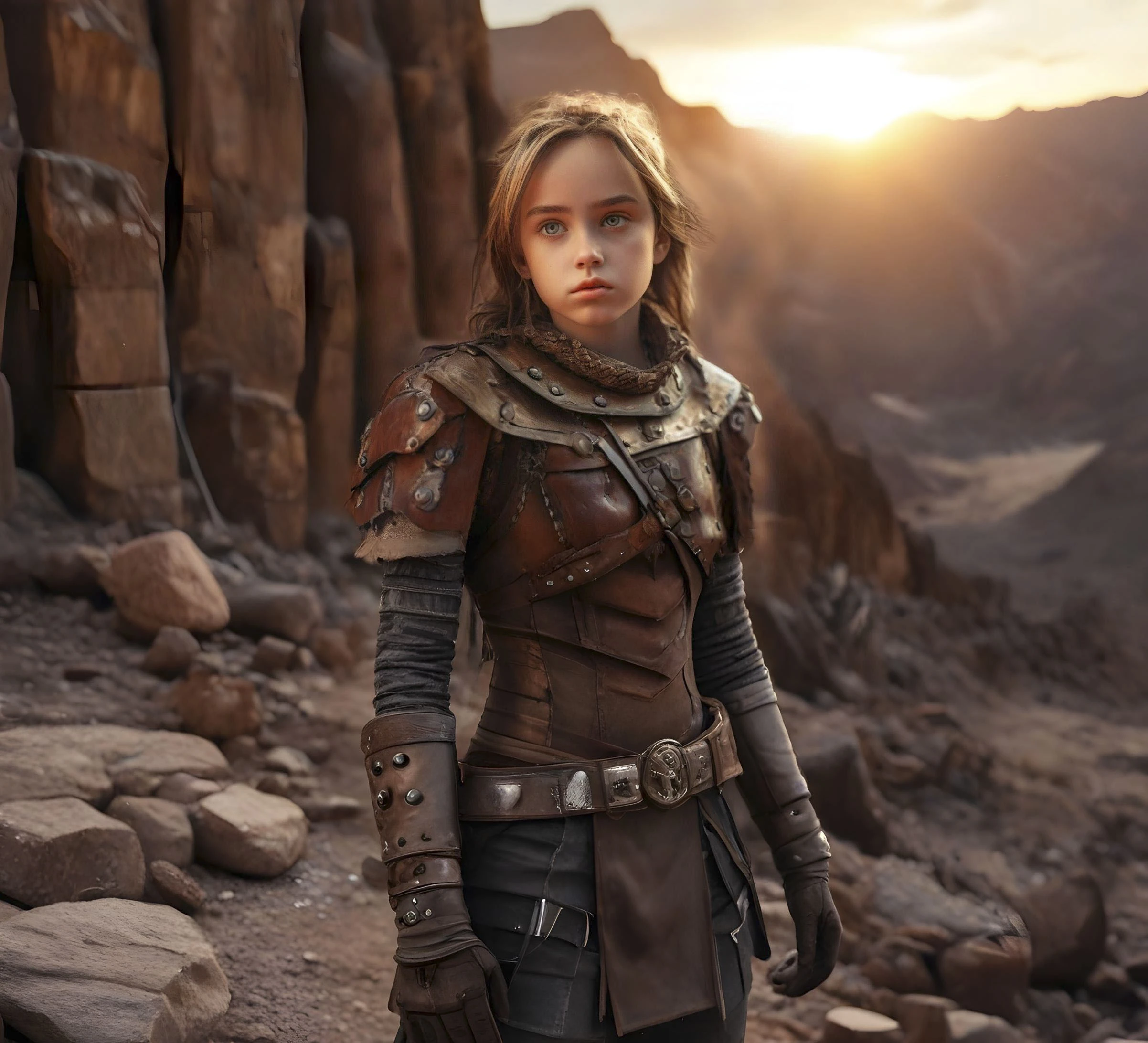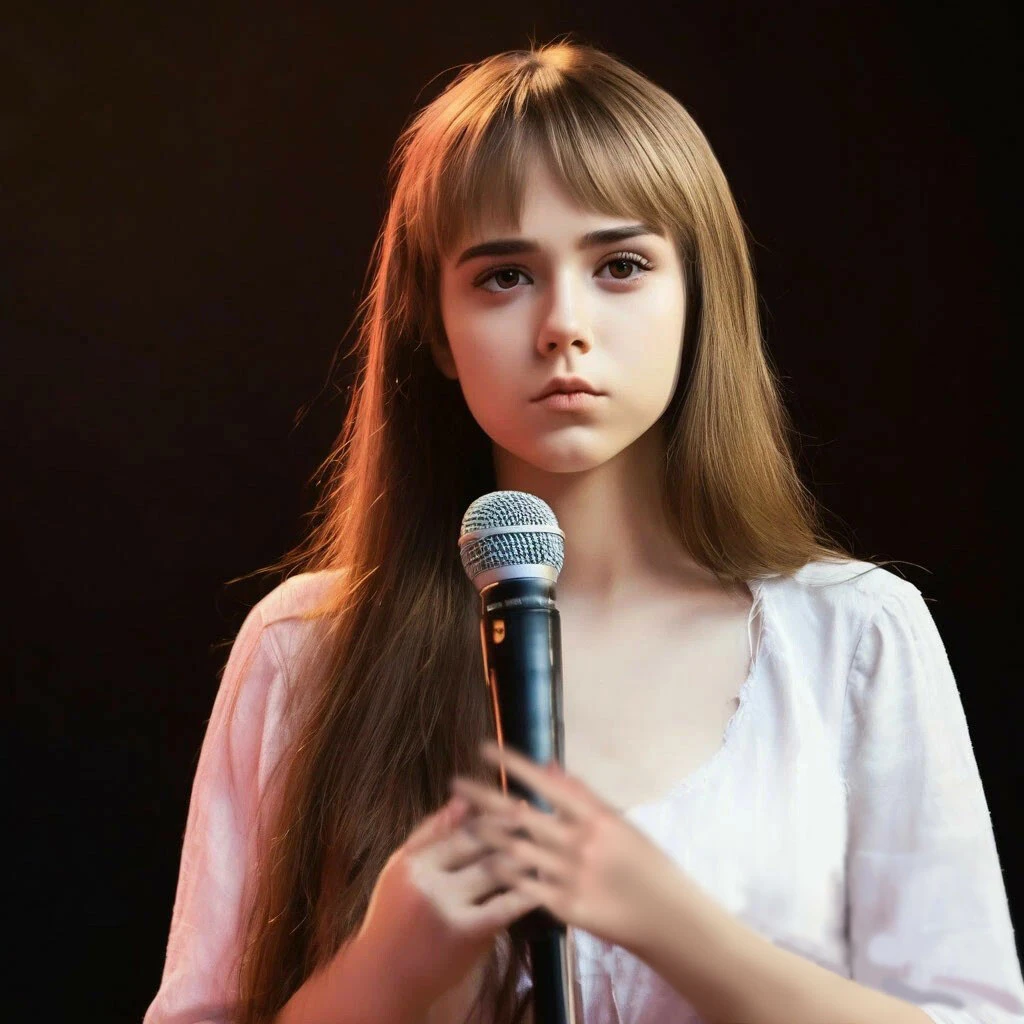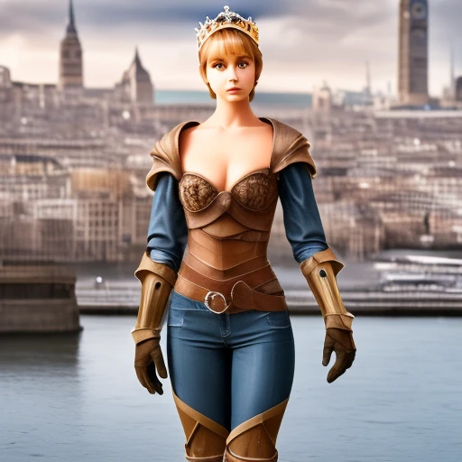 The model is represented by 1 young woman with long light brown hair and expressive light eyes, consistently presented in different scenarios. The images show her in a variety of settings and outfits, which speaks to the versatility of the story and the development of different characters. In some images, she is presented in fantasy-inspired looks, such as medieval armor, a golden dress, or elaborate crowns with royal jewelry against natural or epic landscapes. In other images, she is presented in a modern urban setting, wearing casual clothes, such as a purple shirt and shorts against a cityscape or in a dark coat by a river, with landmarks such as the Eiffel Tower or Big Ben in the background. She can also be seen in more artistic or performative situations, holding a microphone or with bright, glittery makeup on her face and neck, creating a futuristic look. In addition, there are images in elegant, form-fitting modern outfits in modern interiors. The repeated motif of crowns in several images further emphasizes the theme of royalty or high status.