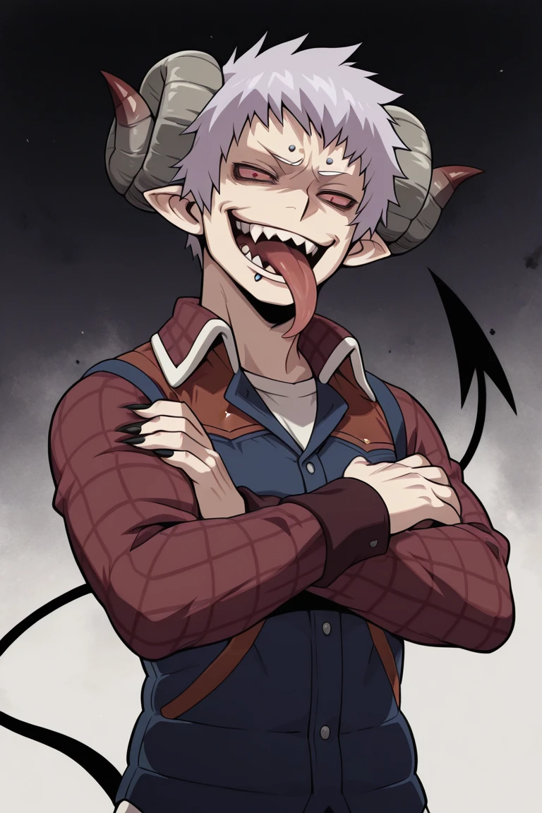 Astaroth, partial possessed, partial demonic possession, solo, 1boy, goat horns, black nail, sharp nails, sharp teeth, red sclera, black pupils, demon tail, long , pale purple hair, shaggy hair,face piercing, lip piercing, eyebrow piercing, lower lip piercing, long sleeve, red plaid shirt, white shirt underneath, dark blue body warmer with red shoulders, black skinny jeans, black shoes