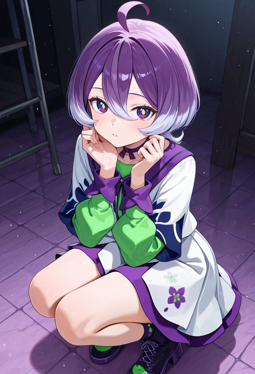 purple ribbon choker, green shirt, sailor collar, purple collar, long sleeve, layered sleeves, short over long sleeves, purple sleeve cuffs, layered skirt,patterned socks, lace-up boots, ankle boots,