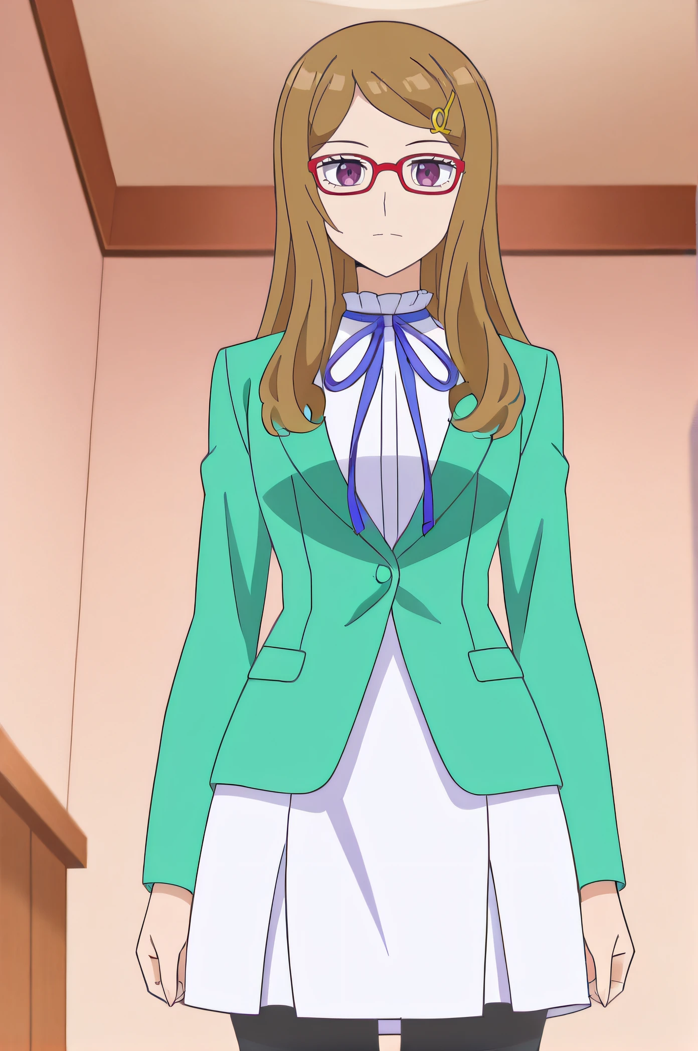 white dress, green jacket, buttoned, blue ribbon, black pantyhose