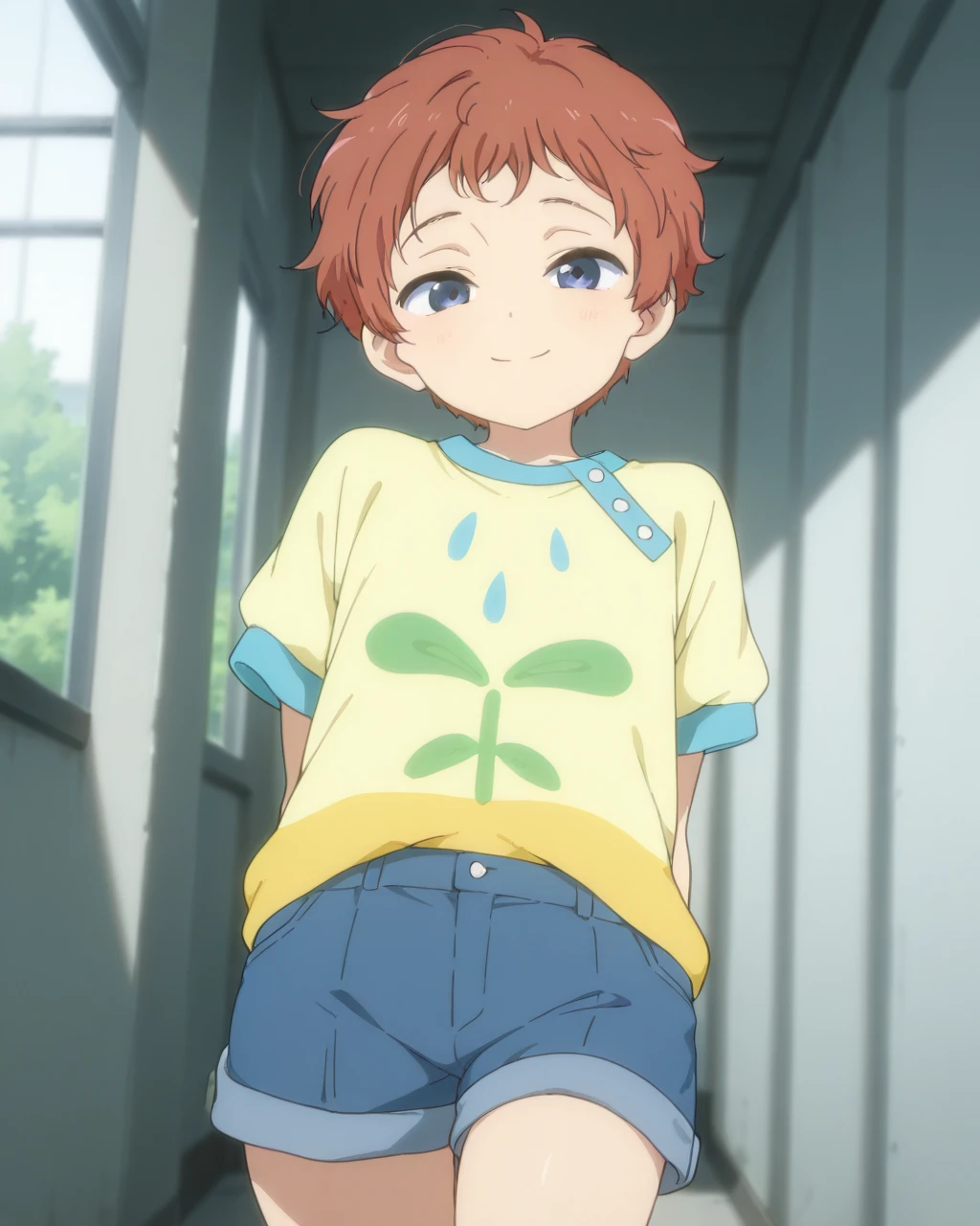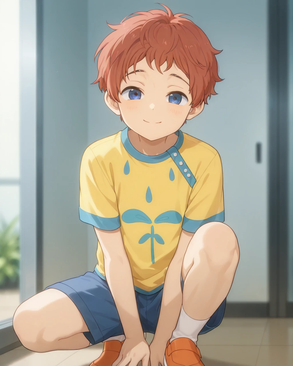 Clothes: print shirt, blue shorts, white socks, orange shoes