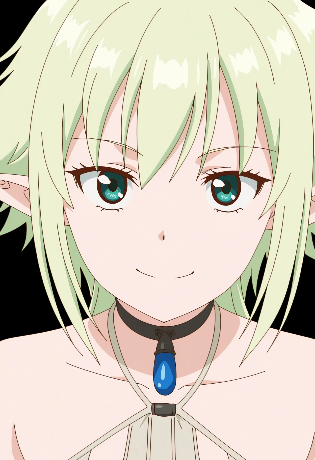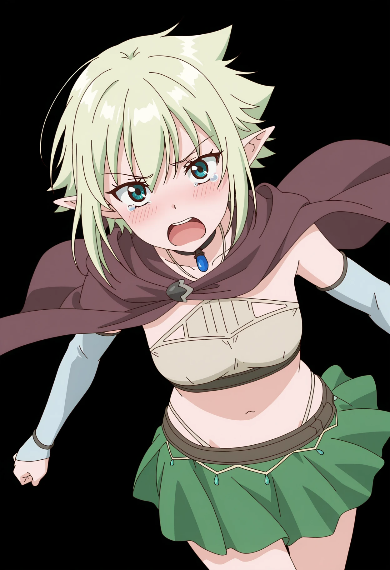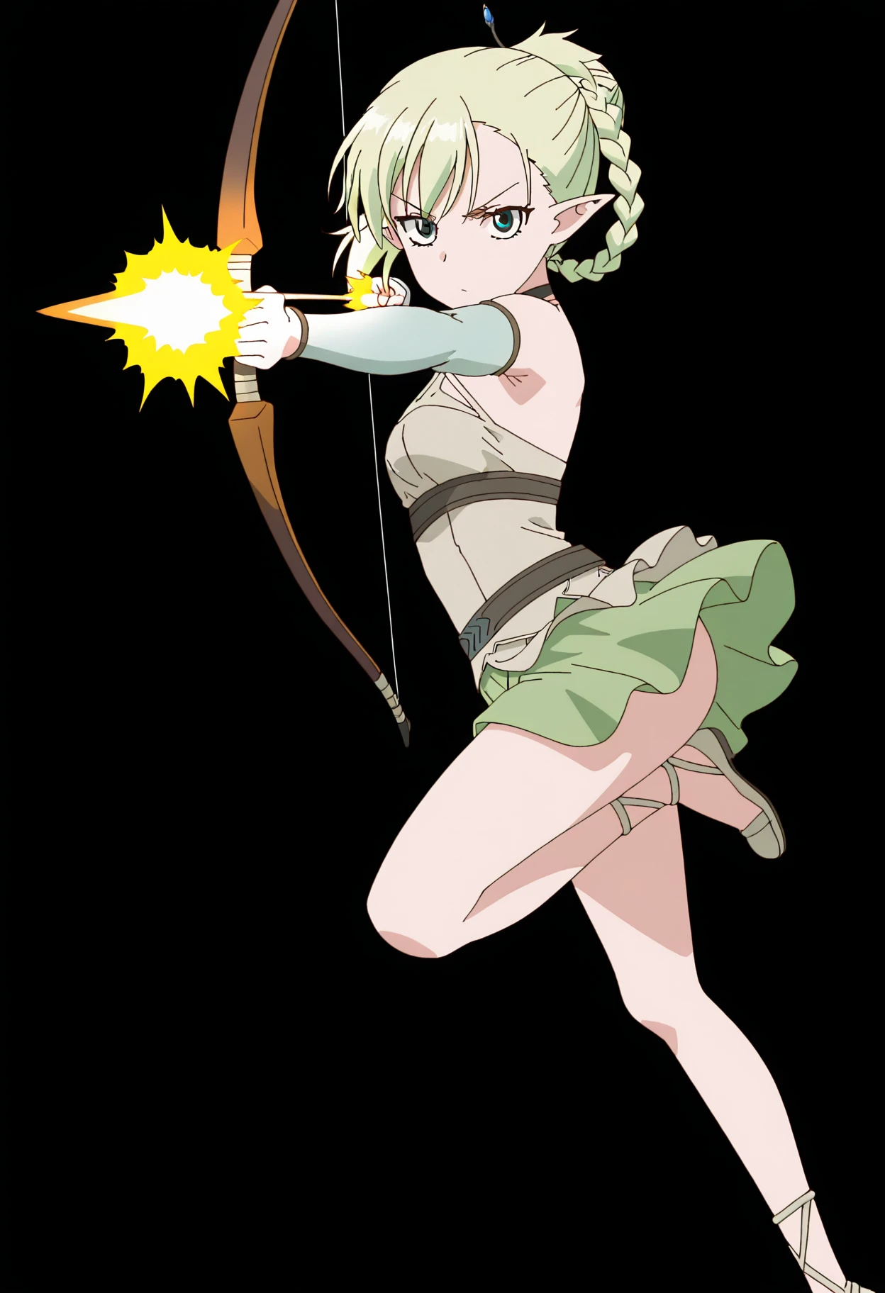1girl, solo, tirolilo lilili lou, elf, pointy ears, bangs, green eyes, blue eyes, short hair, braid