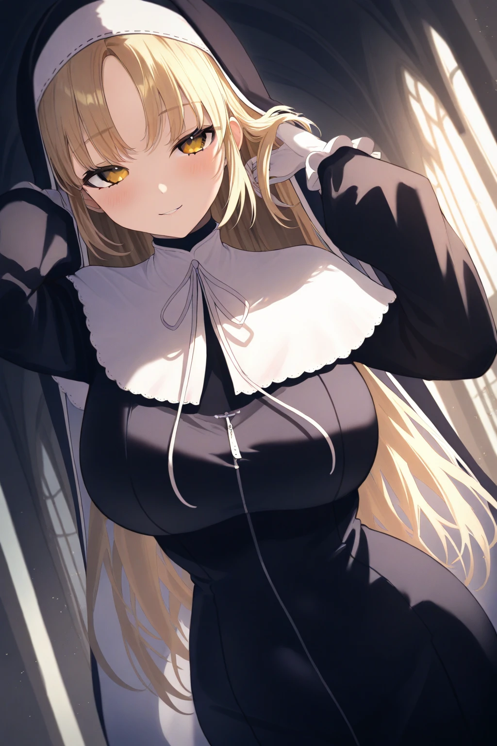 sister claire, long hair, blonde hair, straight hair, parted bangs, eyelashes, yellow eyes