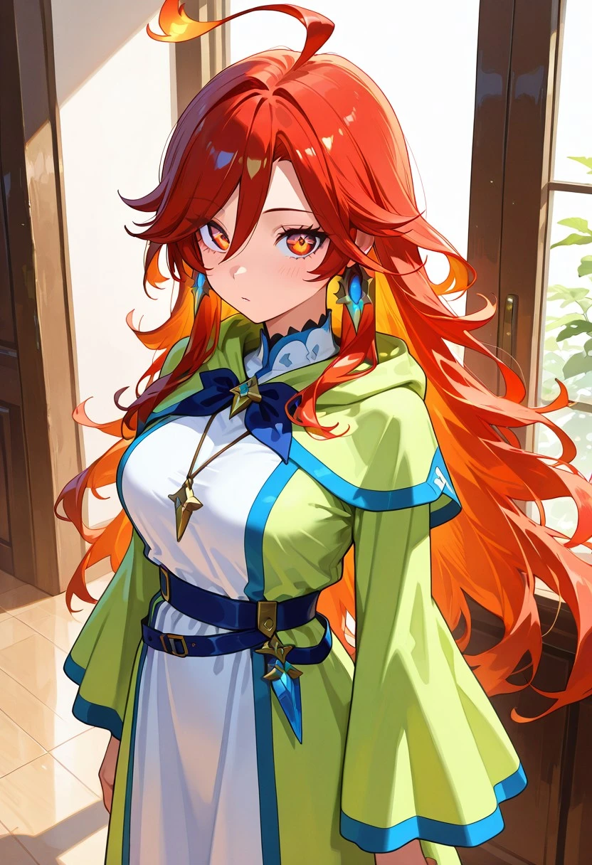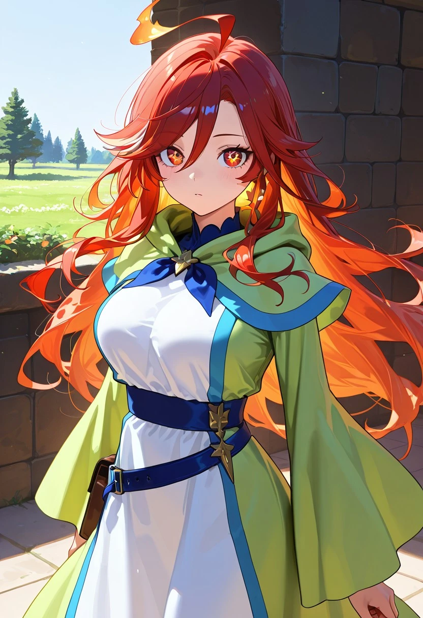 mage outfit, long dress, white dress, green outer robe, wide sleeves, layered clothing, blue trim, bow tie, blue waist belt,ankle boots,