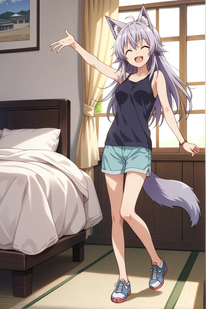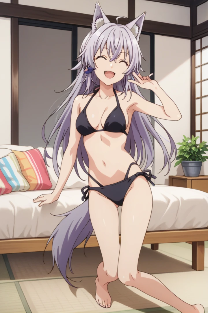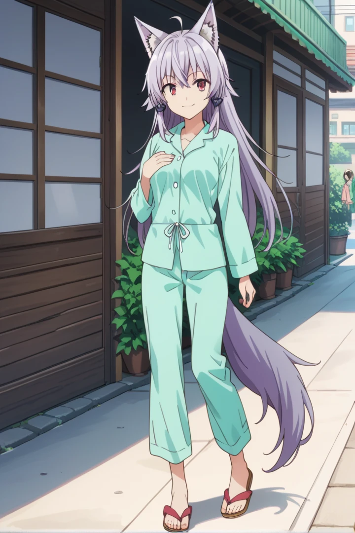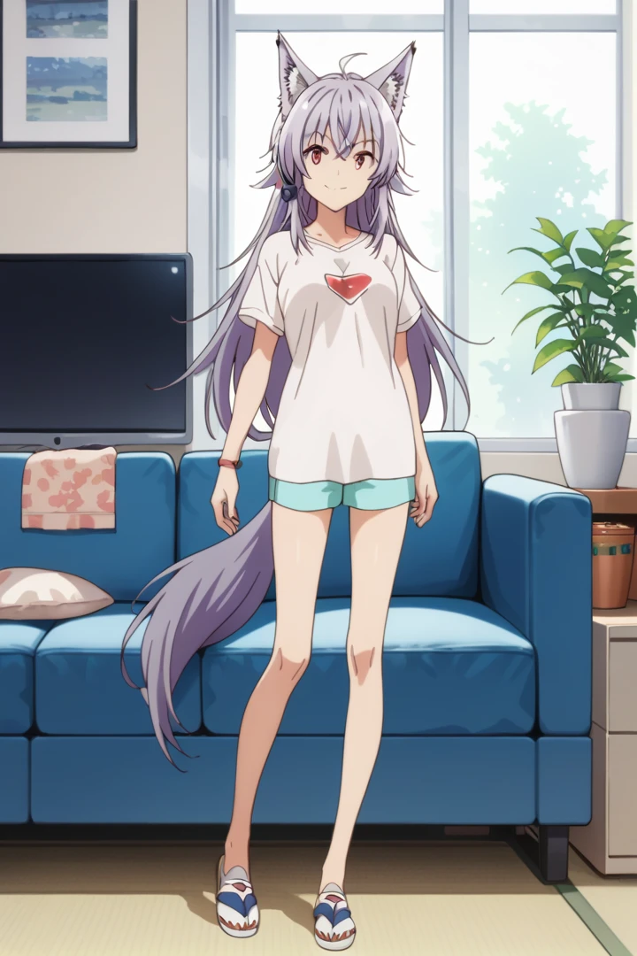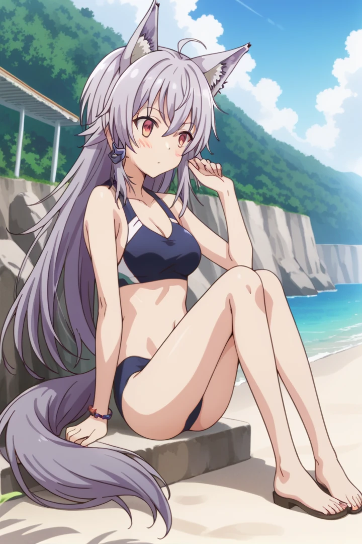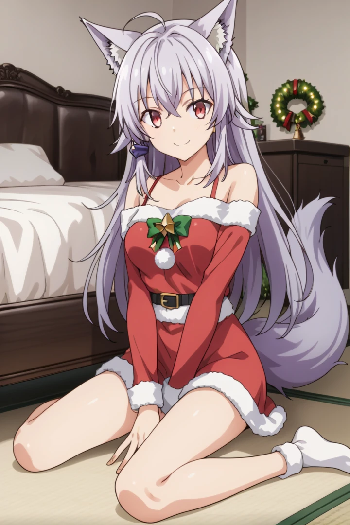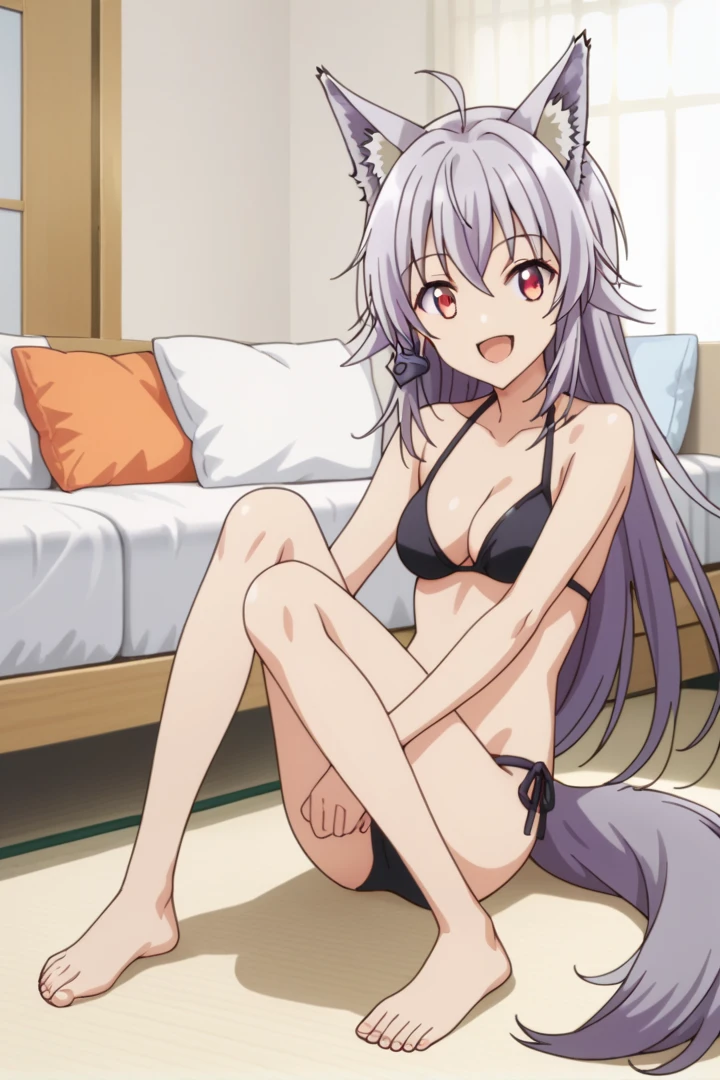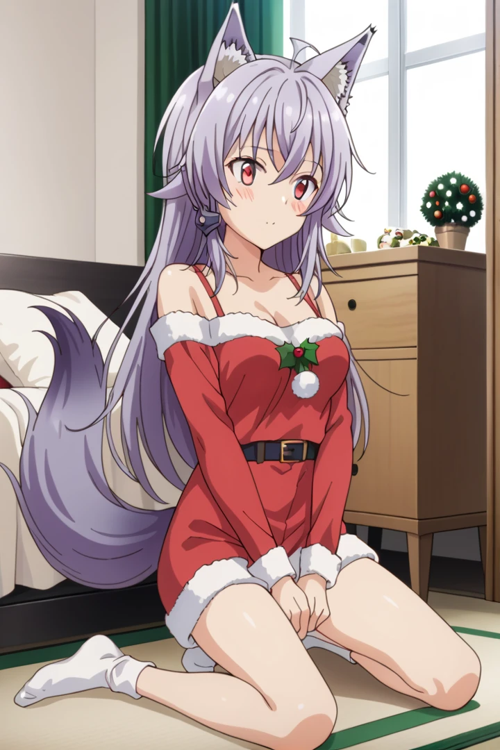 purple hair, wolf tail, wolf ears, red eyes, ahoge