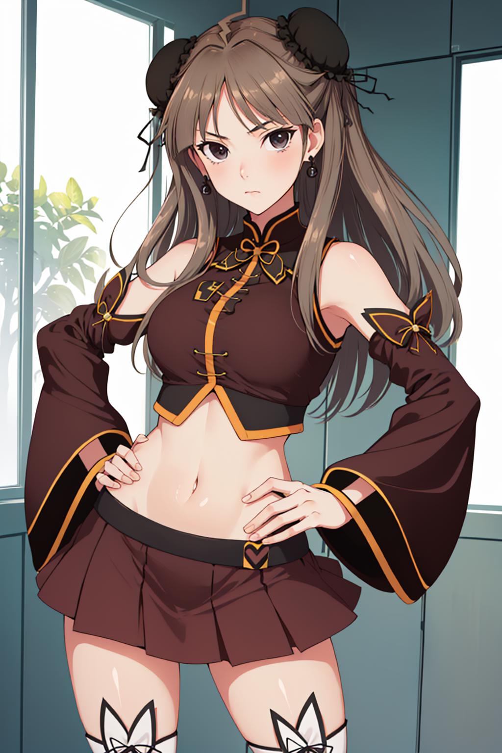 Default Outfit: detached sleeves, red skirt, thighhighs, jewelry, earrings, midriff