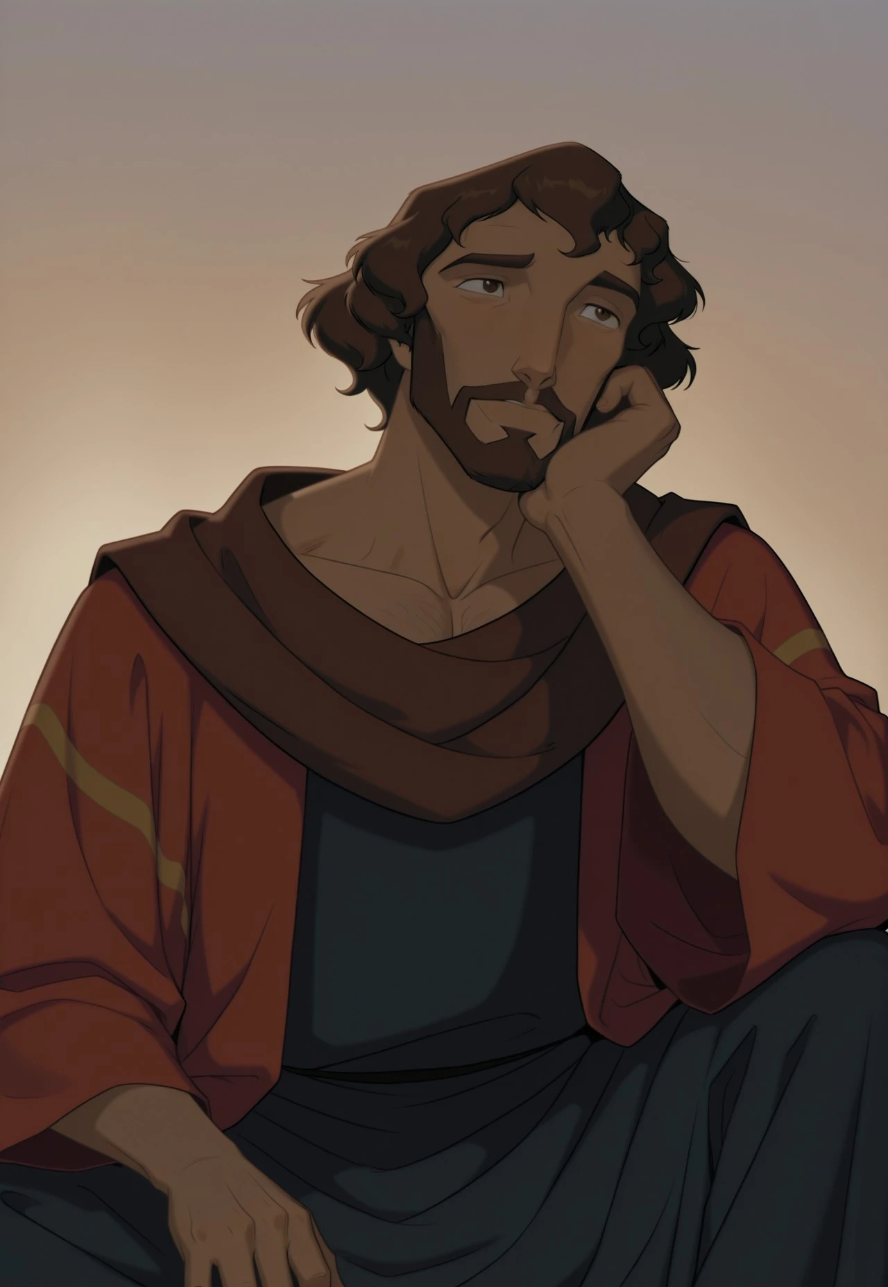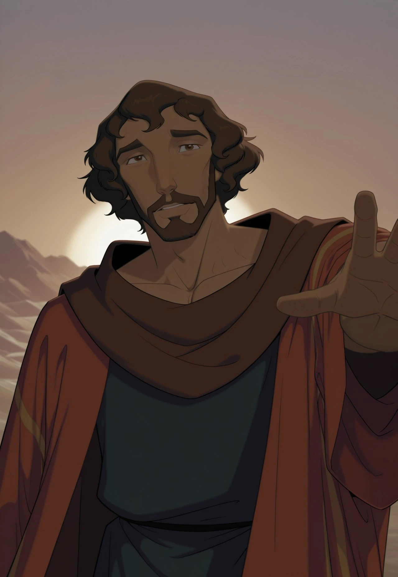 m0ses, brown wavy hair, brown eyes, beard