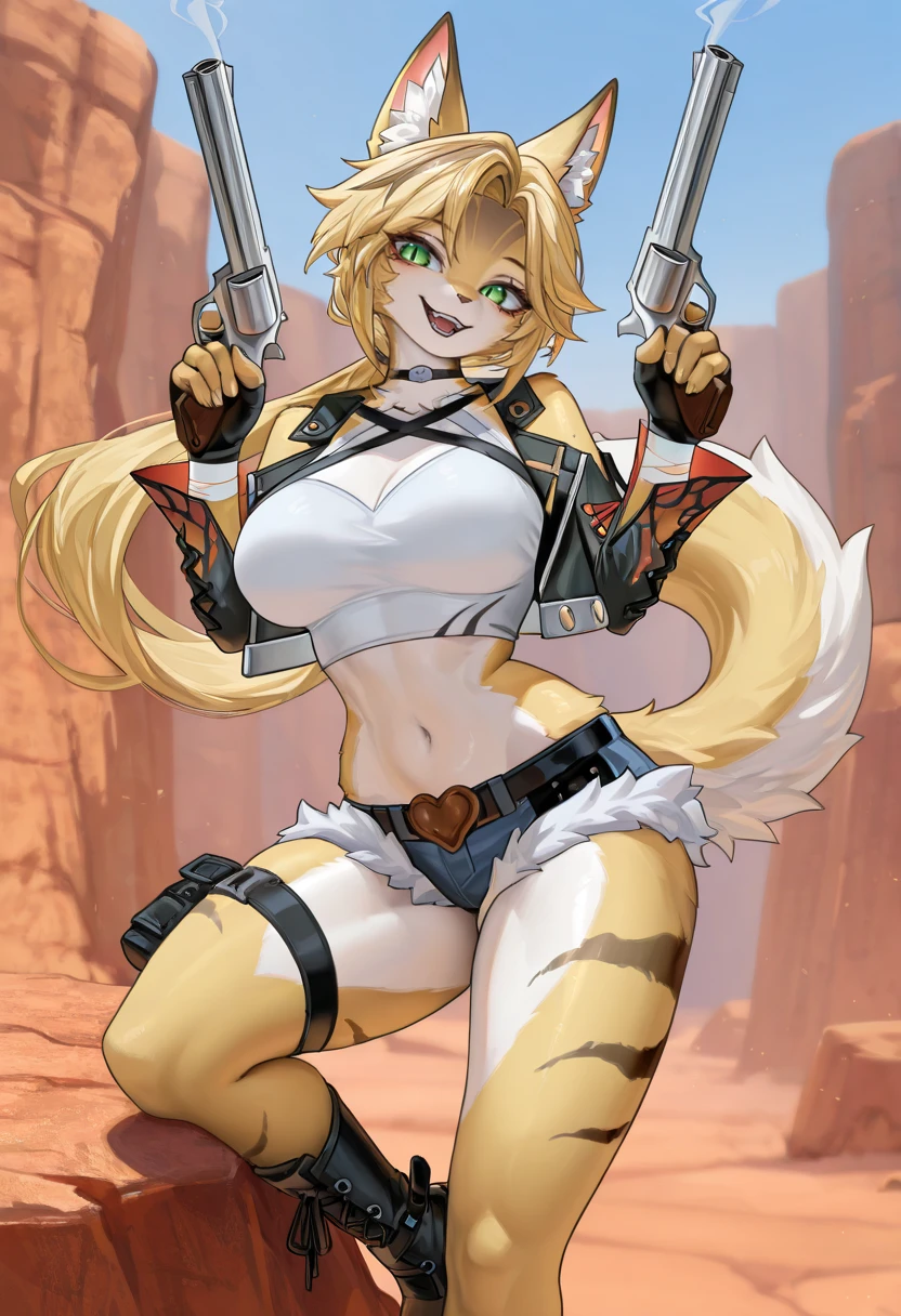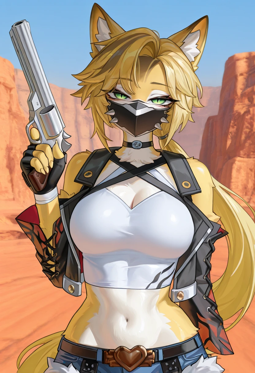 Outfit positives: mask, sleeveless jacket, crop top, hotpants, heart buckle, detached sleeves, leg pouch, open bootsDescription