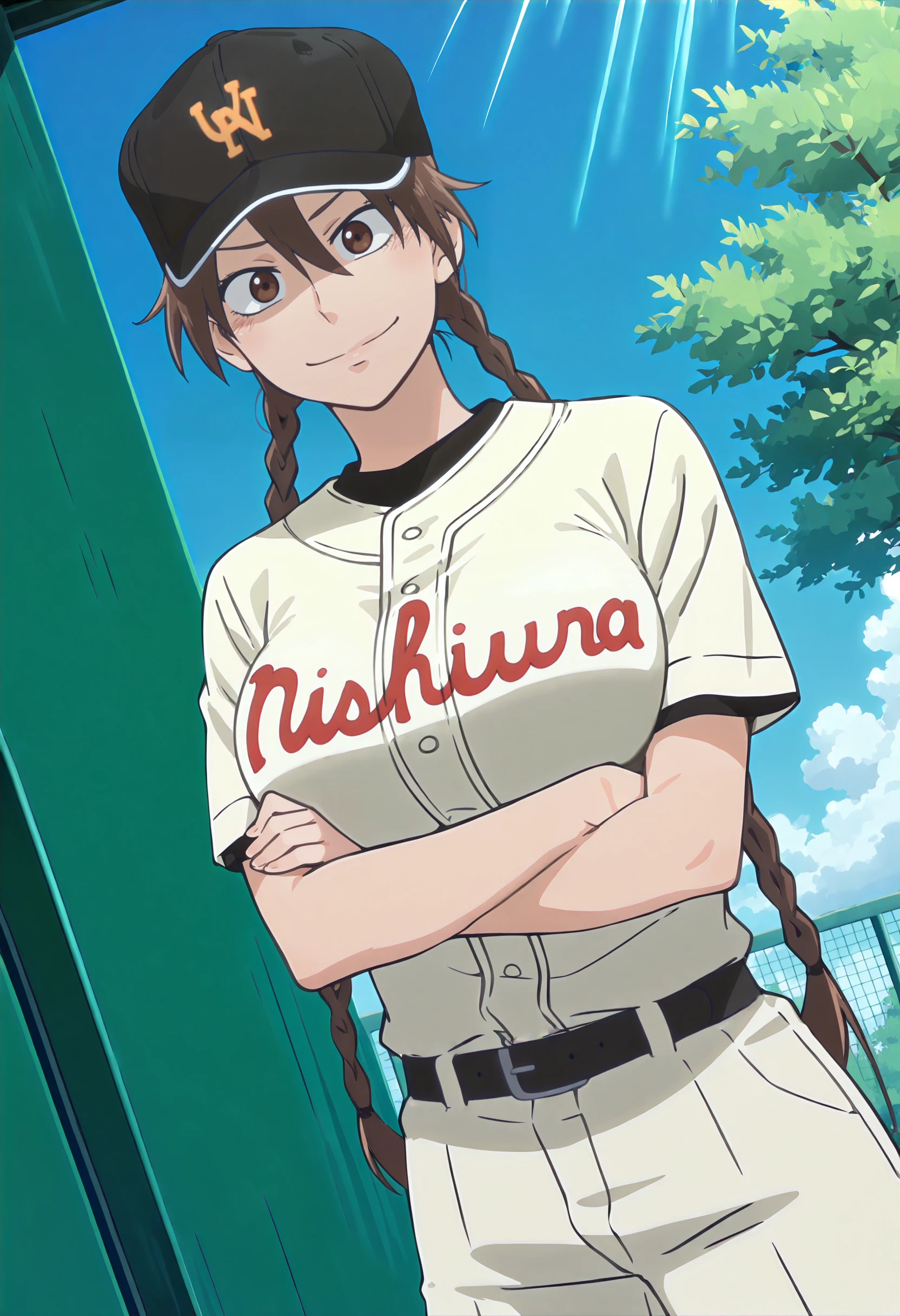 #1: baseball uniform, white shirt, clothes writing, black undershirt, short sleeves, black belt, white pants, black socks, socks over pants, black sneakers, black hat, baseball cap, print hat