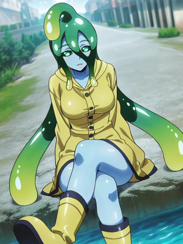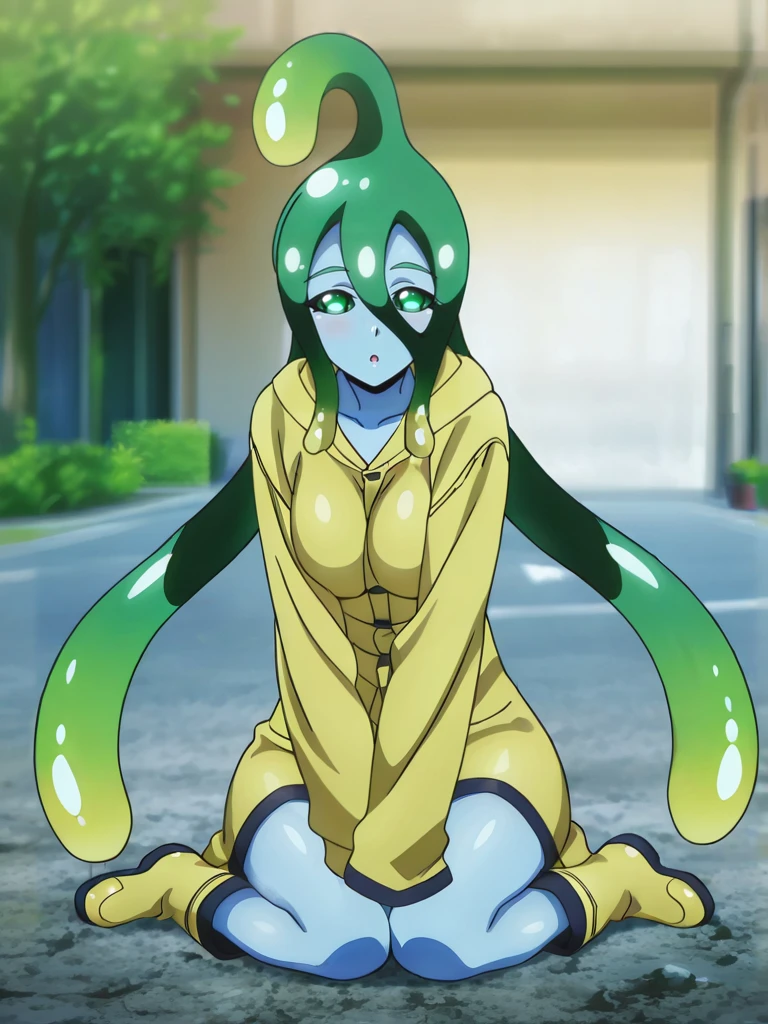 suu, no humans, slime girl, green hair, tentacle hair, bangs, blue skin,colored sclera, green sclera, green eyes,anime screenshot,