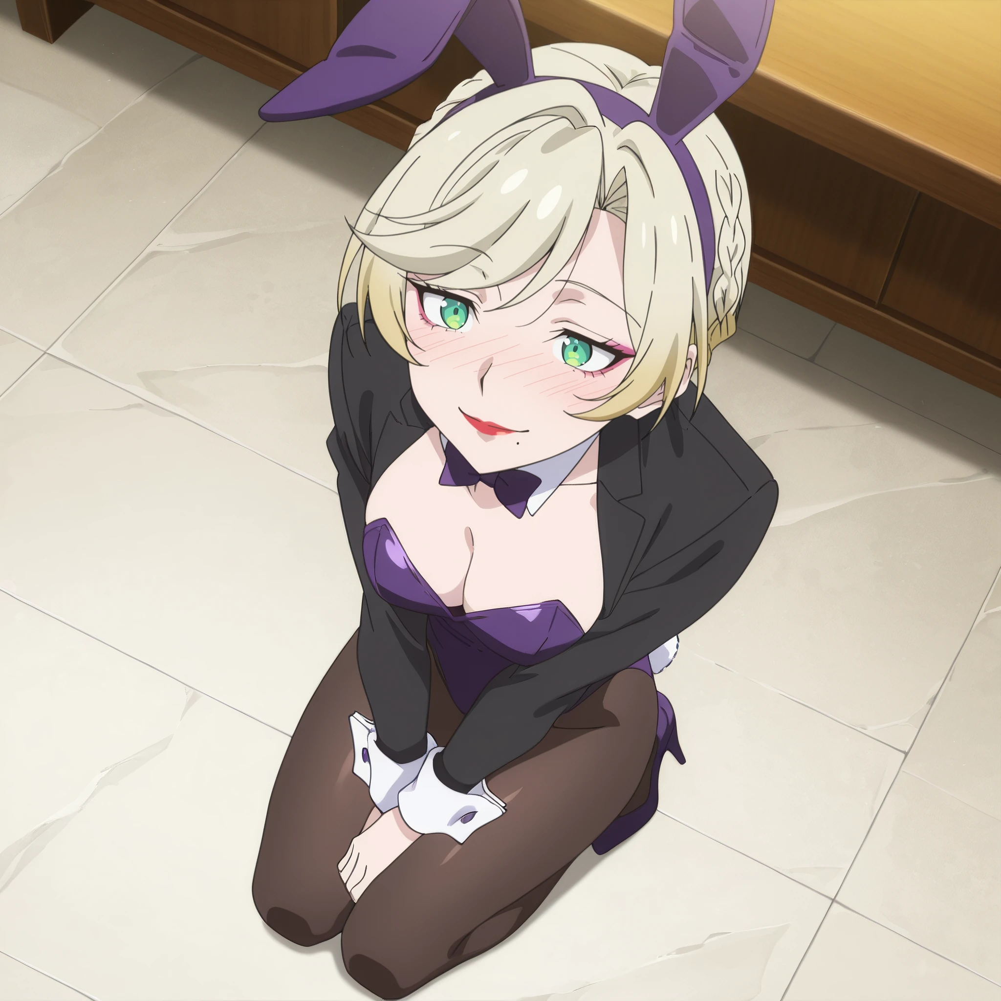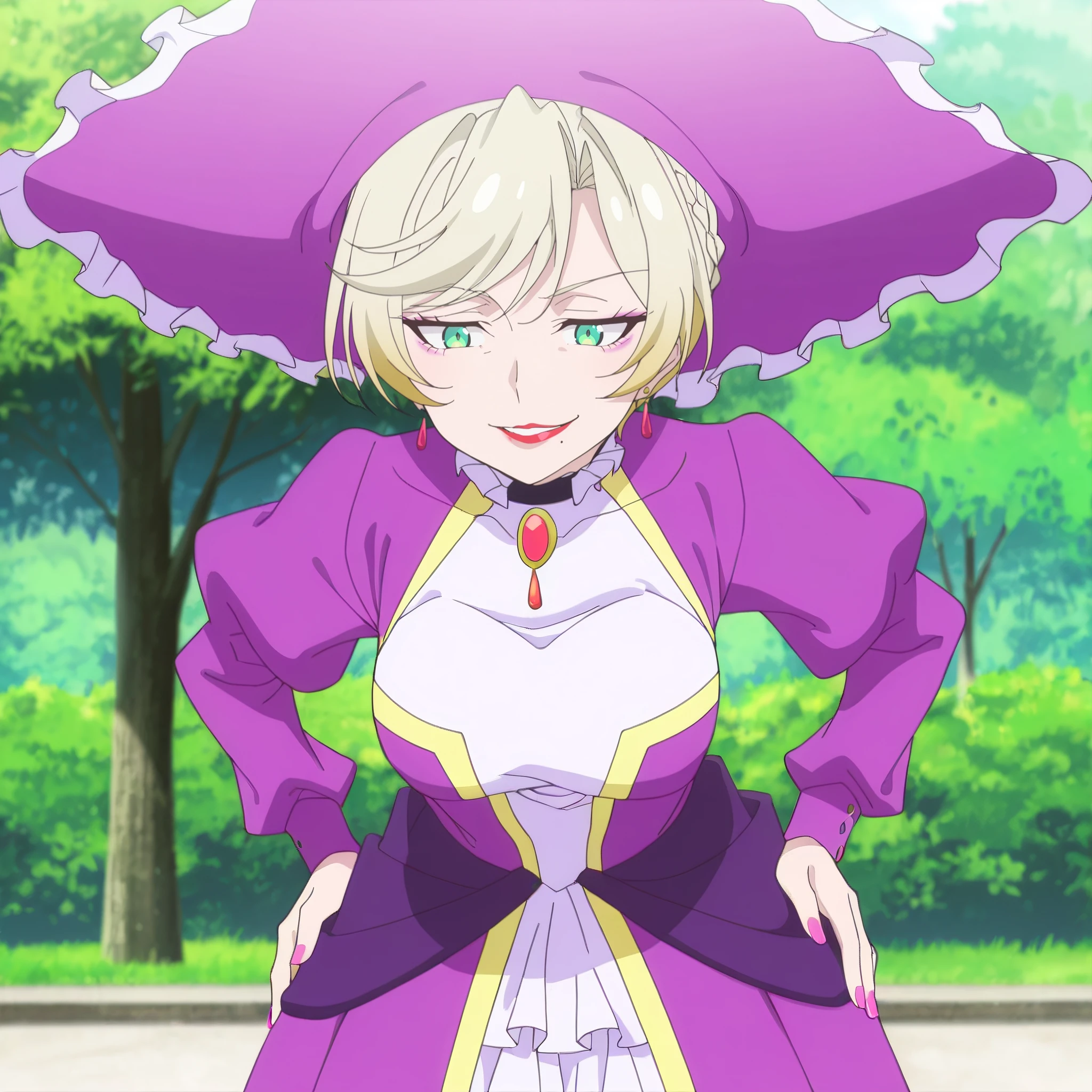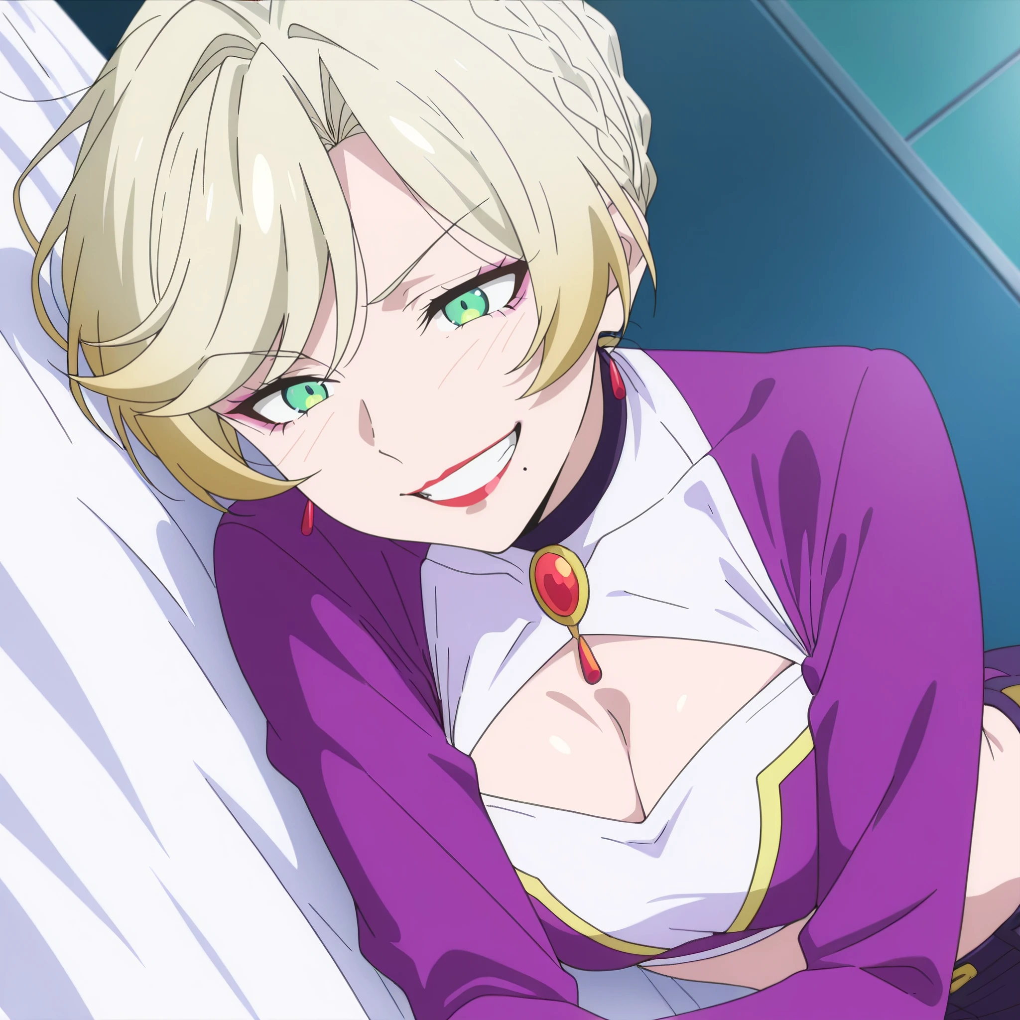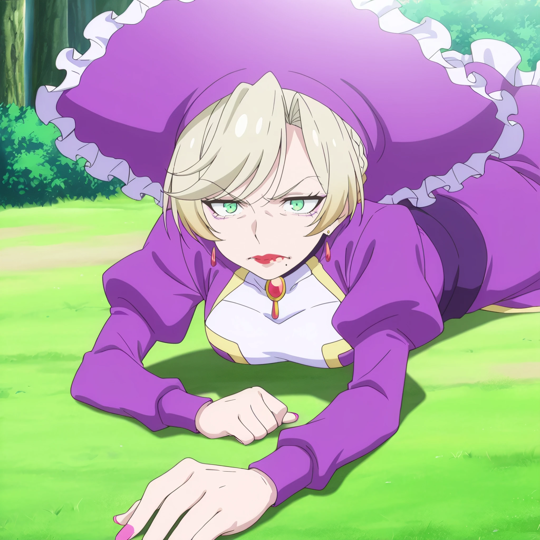 SRANoble, green eyes, blonde hair, short hair, french braid, makeup, red lipstick, mole under mouth,