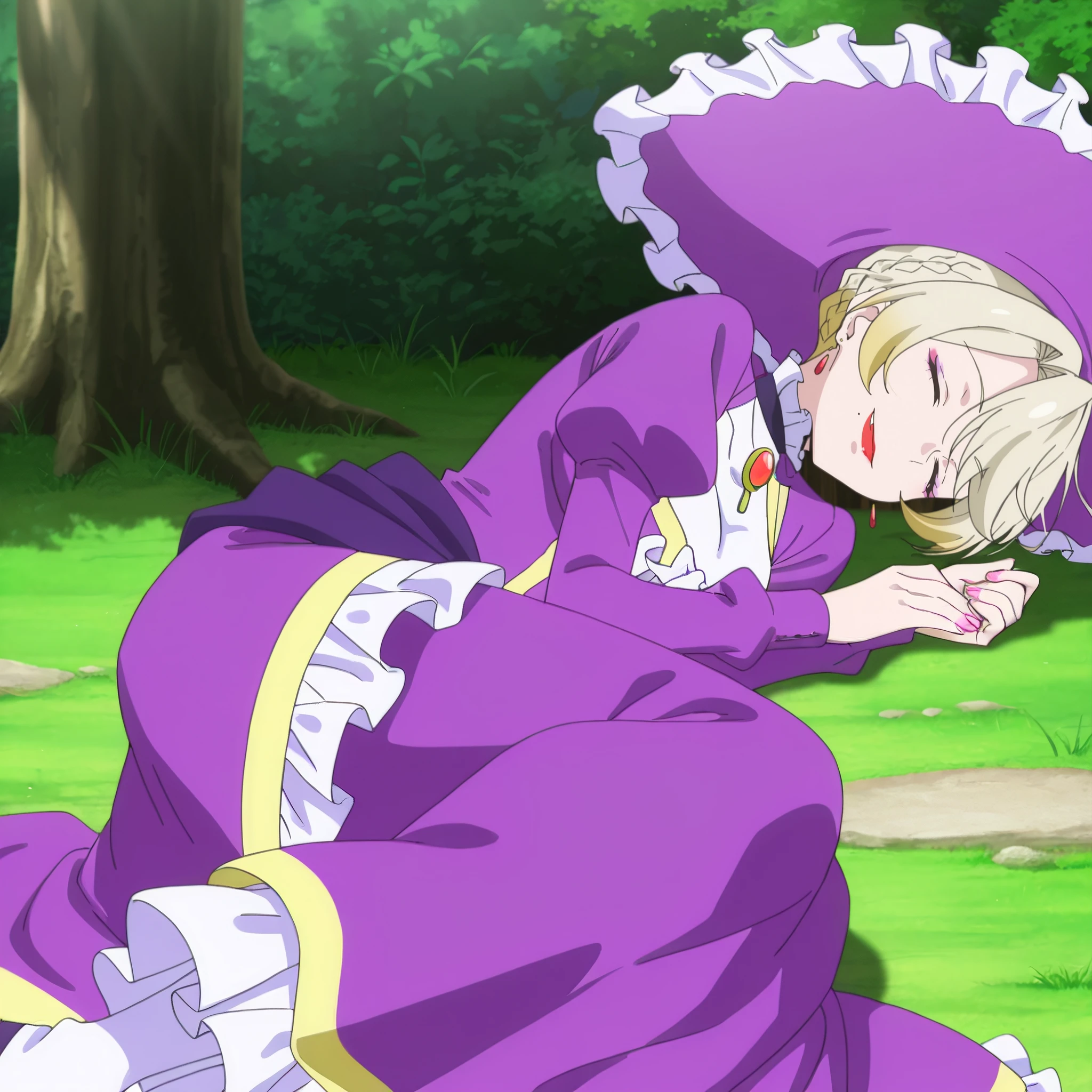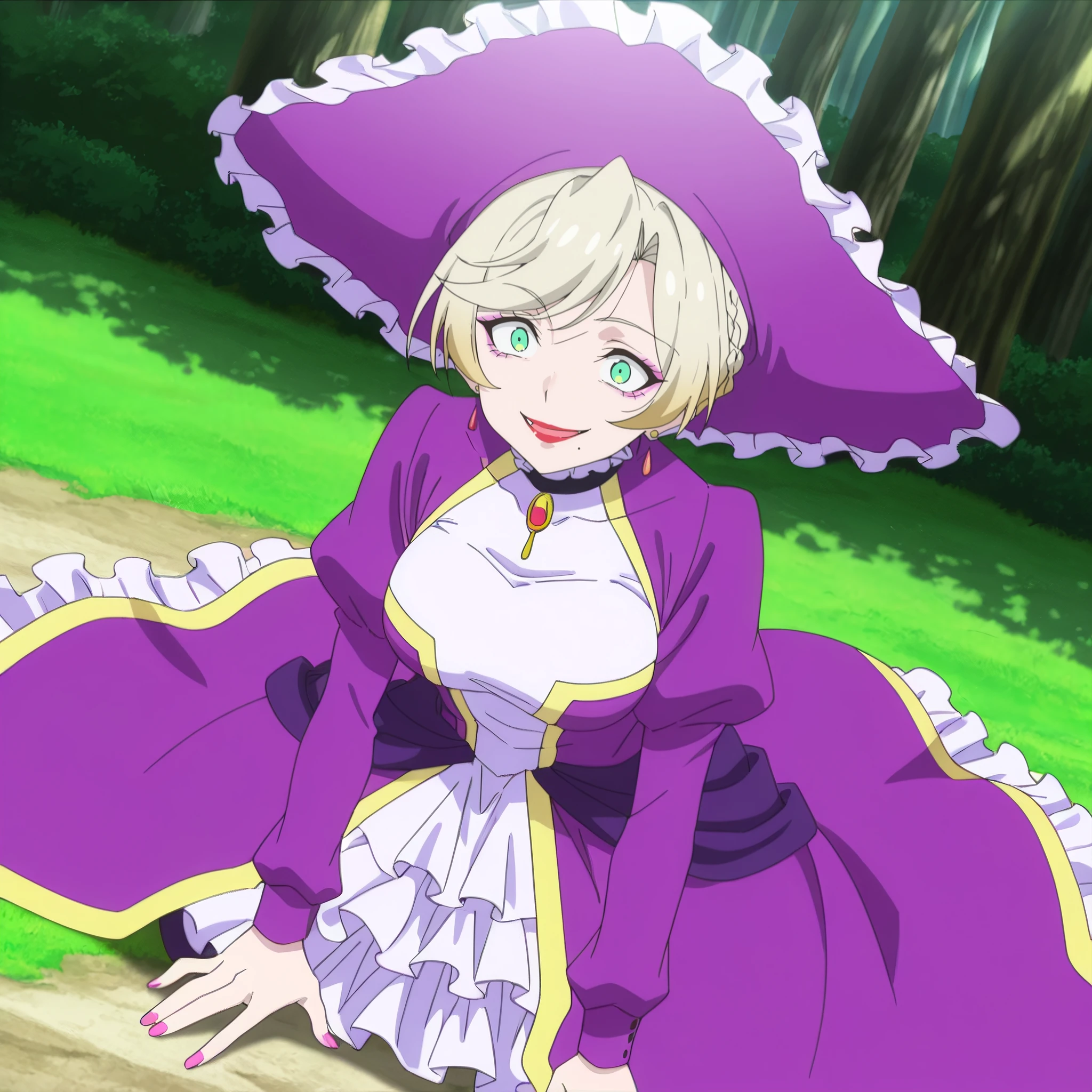 purple dress, frills, jewelry, earrings, brooch, purple hat, puffy sleeves, juliet sleeves, nail polish, pink nails, choker,