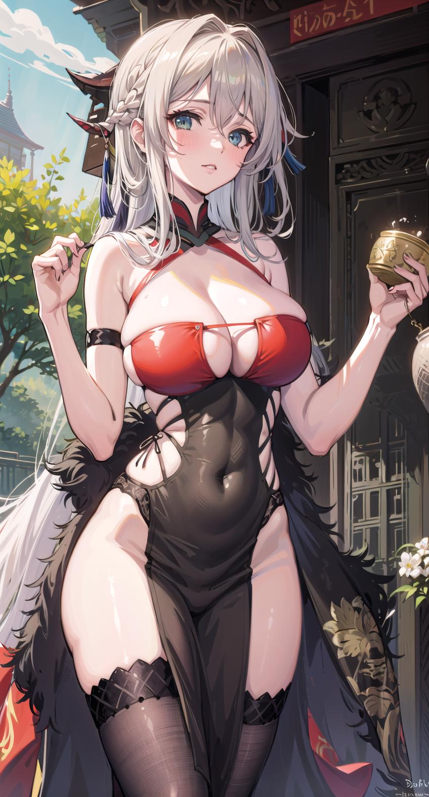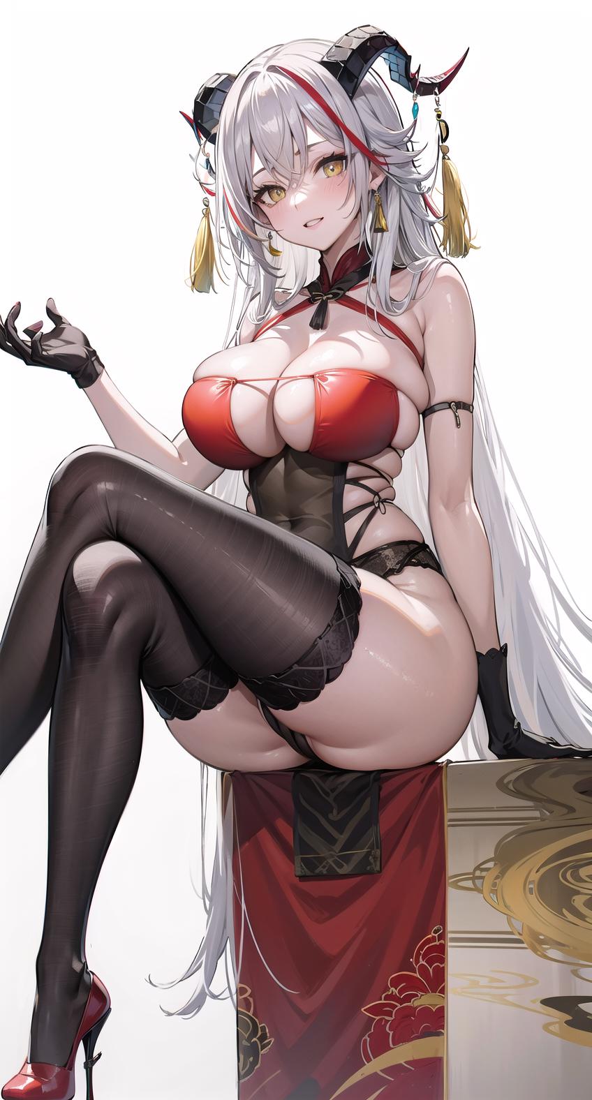 PS:You can use it as a character lora,suggest promt: goldendragon hairstyle, outfit-goldendragon, breasts, 1girl, solo, yellow eyes, long hair, cleavage, streaked hair, looking at viewer, red hair, white background, sitting, crossed legs, thighs