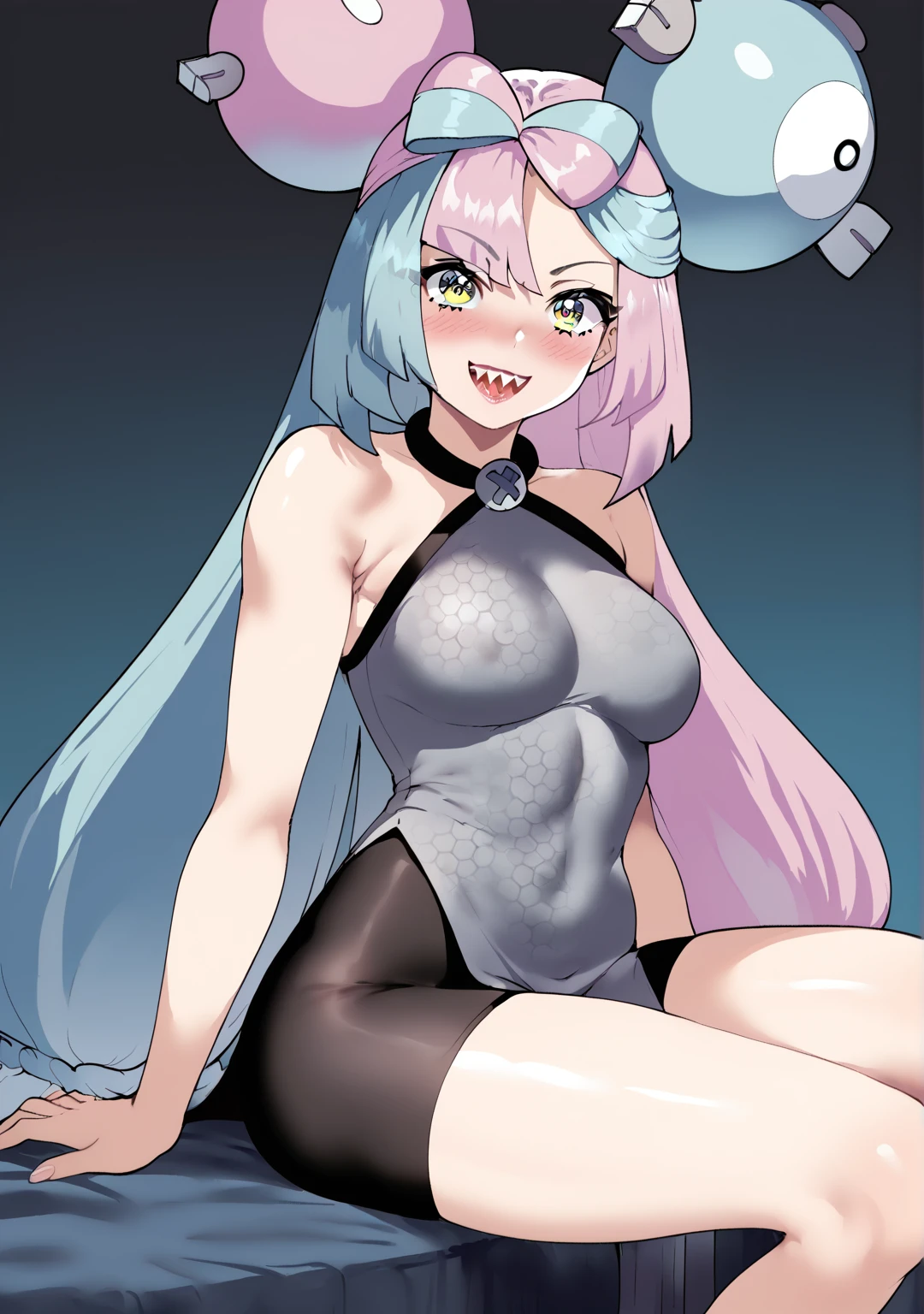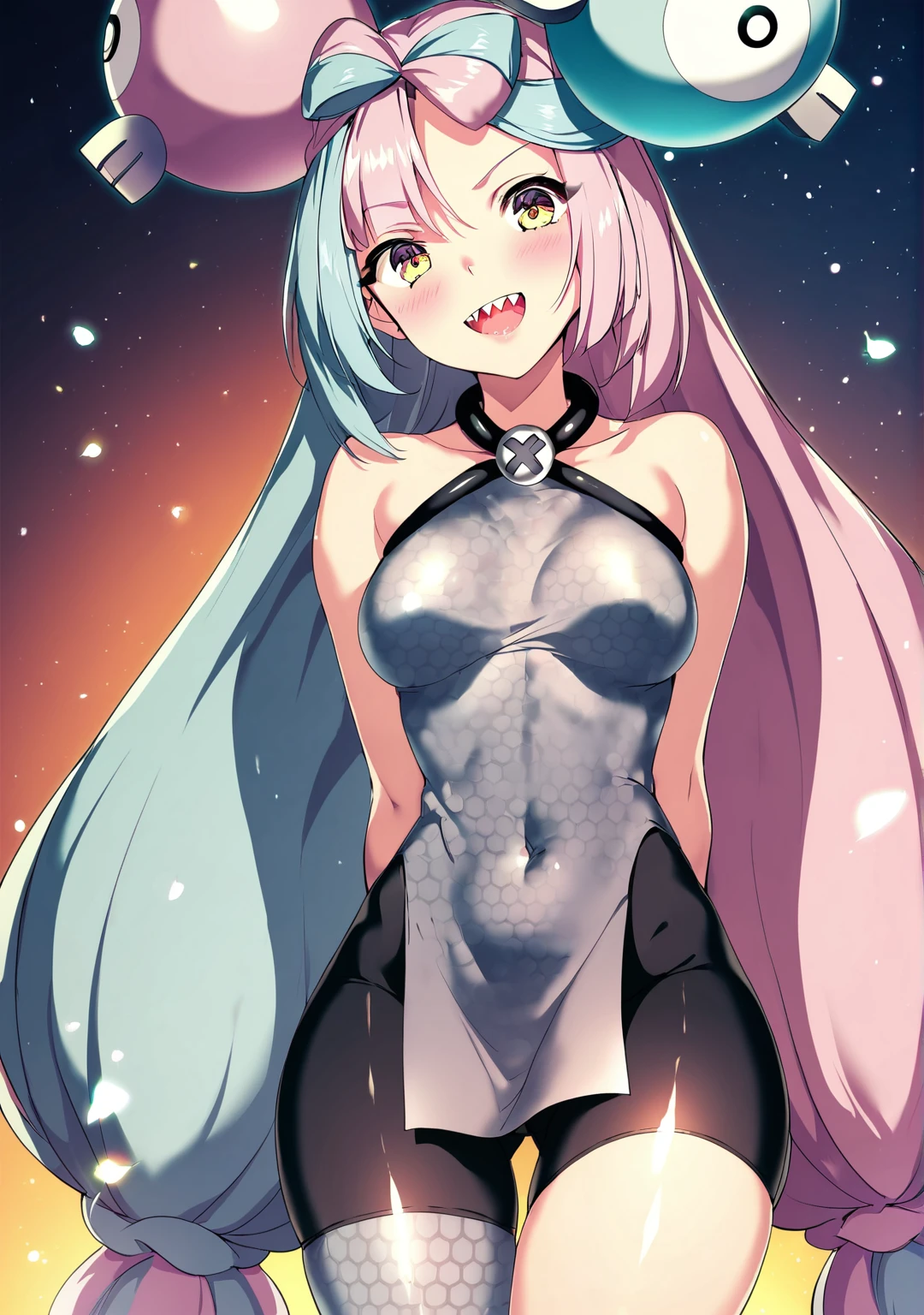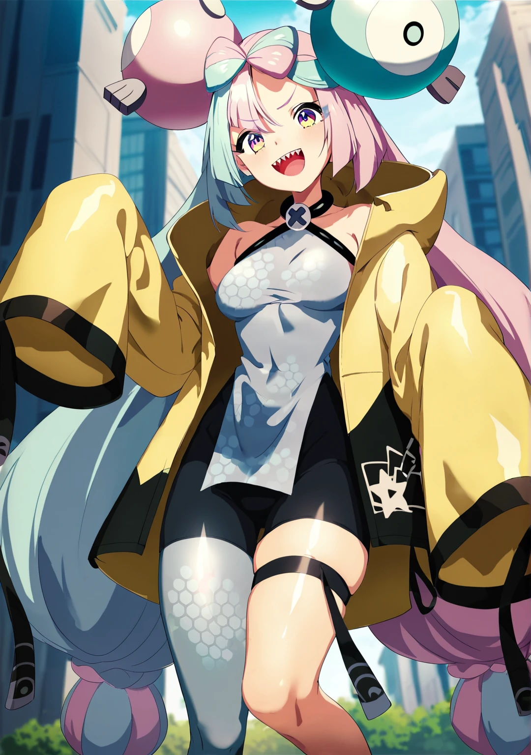 1girl, solo, iono (pokemon), multicolored hair, long hair, yellow eyes, character hair ornament, bow-shaped hair, sharp teeth, (grey vest:1.4), bike shorts, pelvic curtain,Also, add These Negatives for better No Jacket results